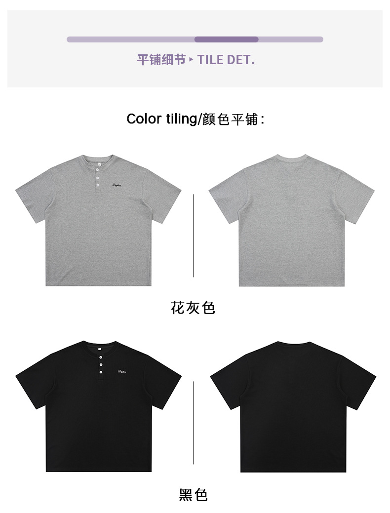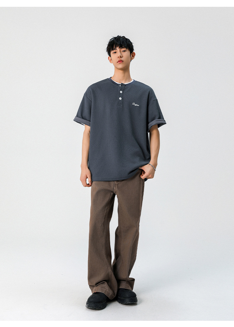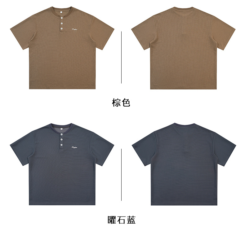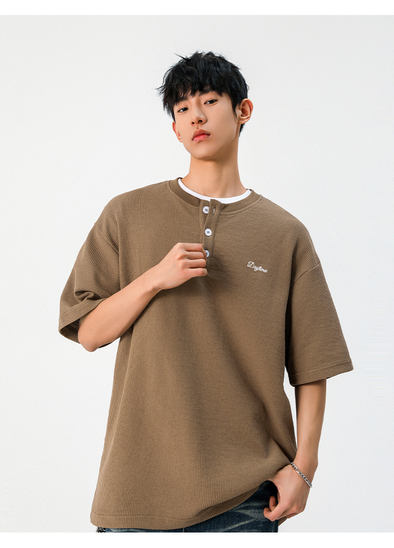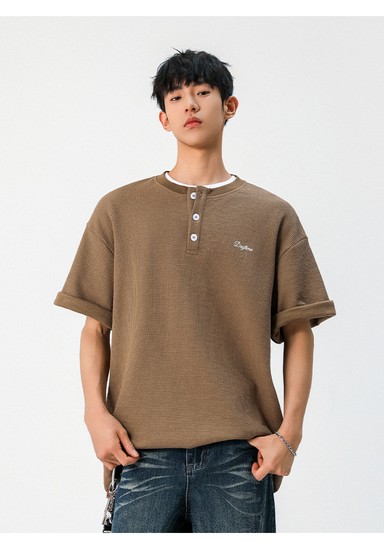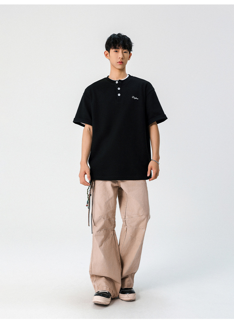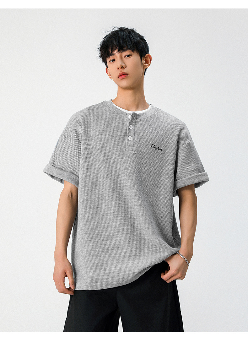 【YW】无忧购韩系重磅宽松撞色字母刺绣亨利领华夫格短袖T恤男MT7199(截单后7天发货)