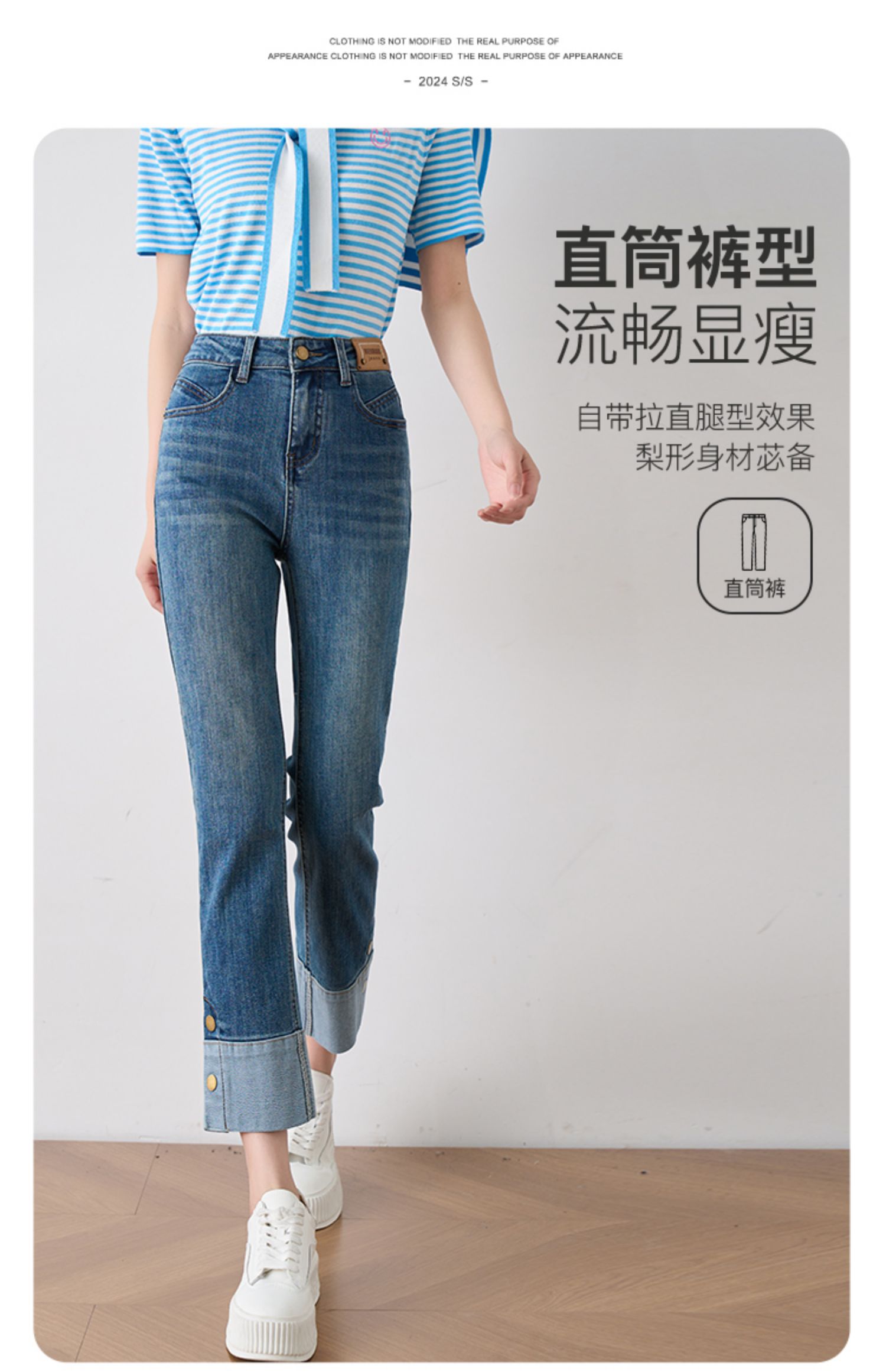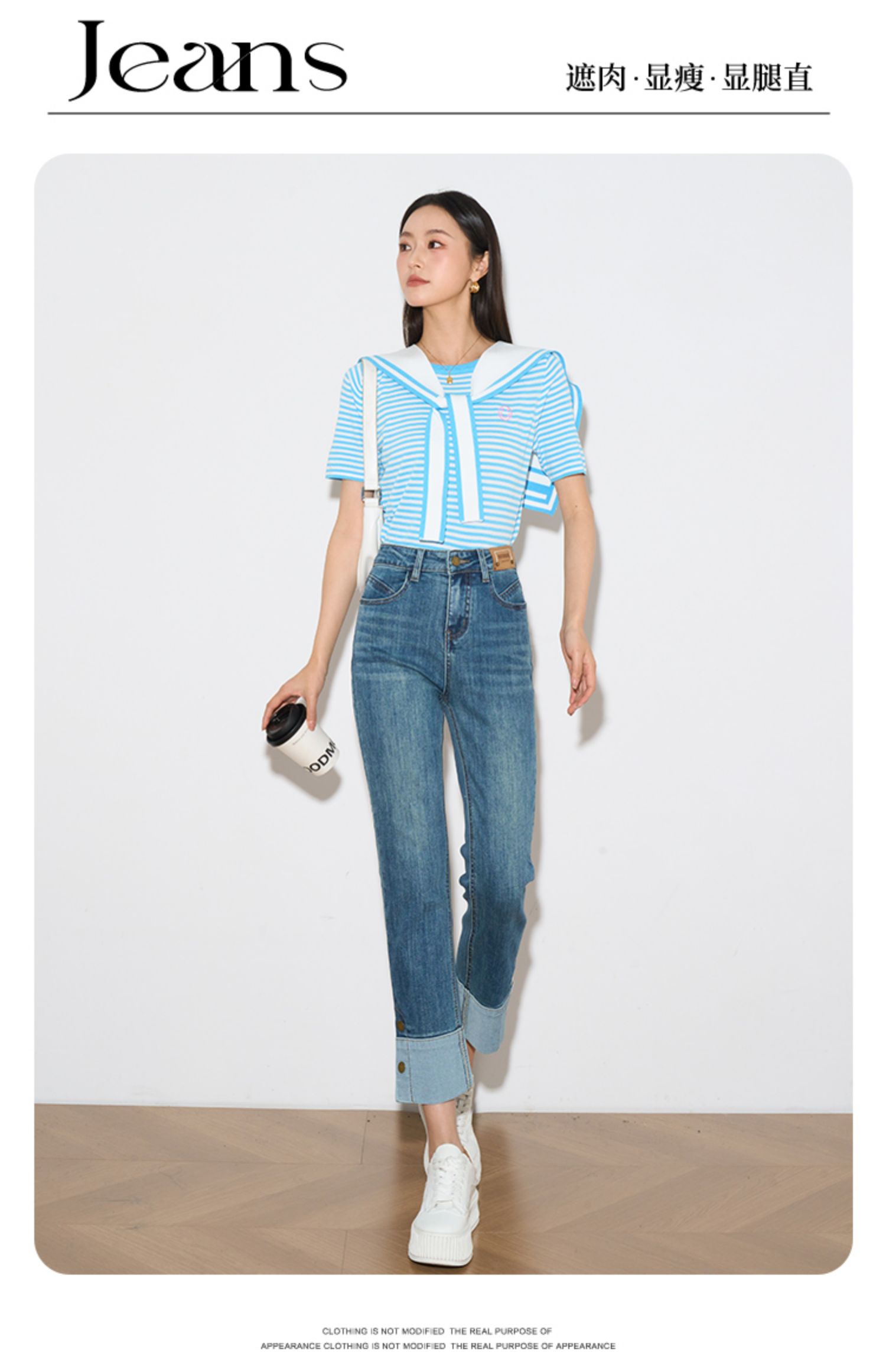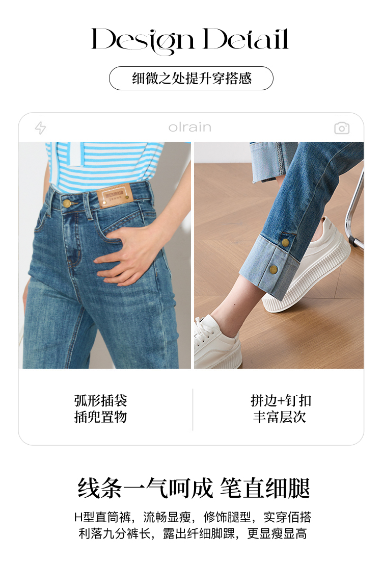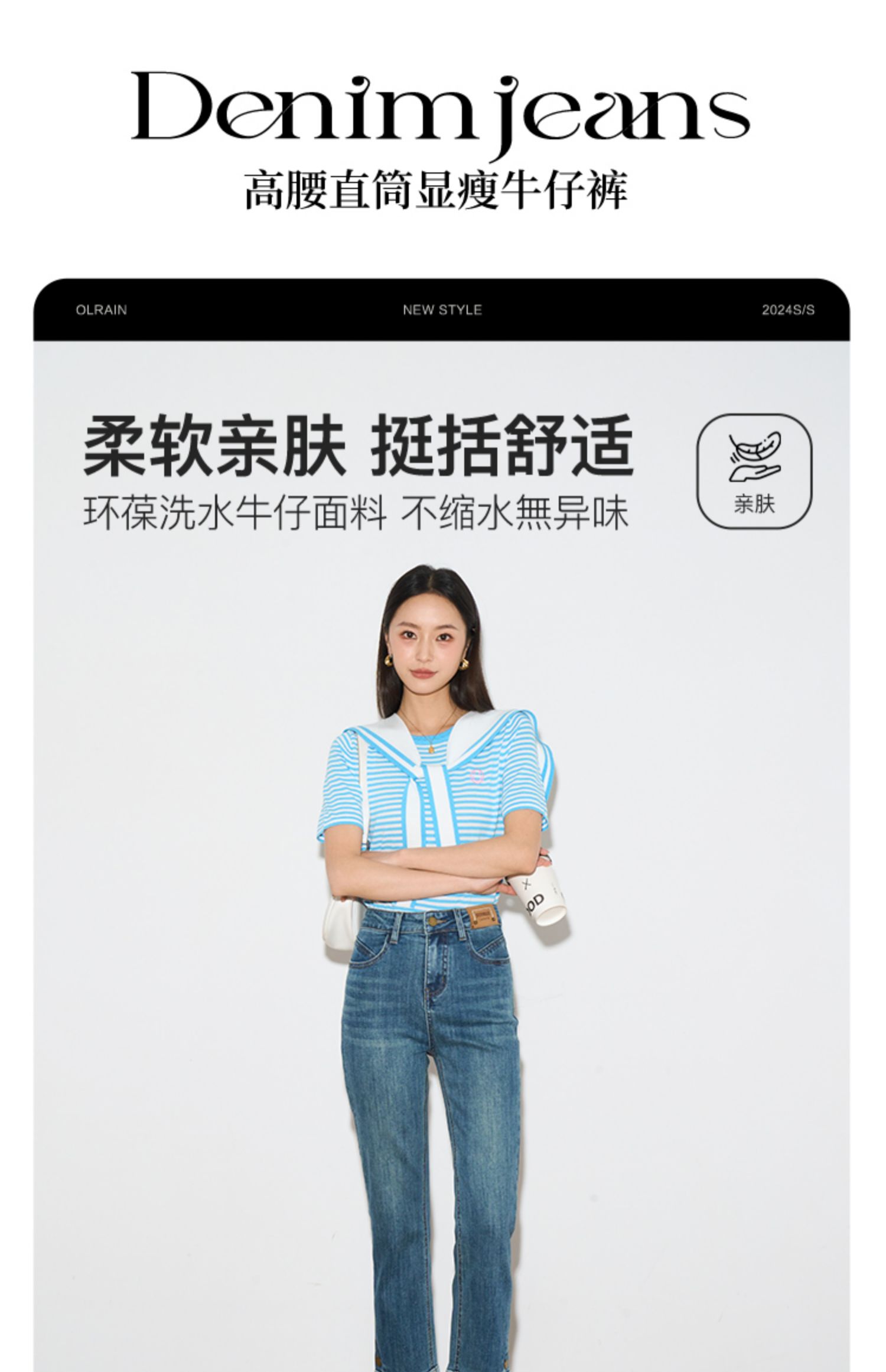 OLrain欧芮儿蓝色直筒牛仔裤女夏季2024年新款高腰阔腿显瘦长裤