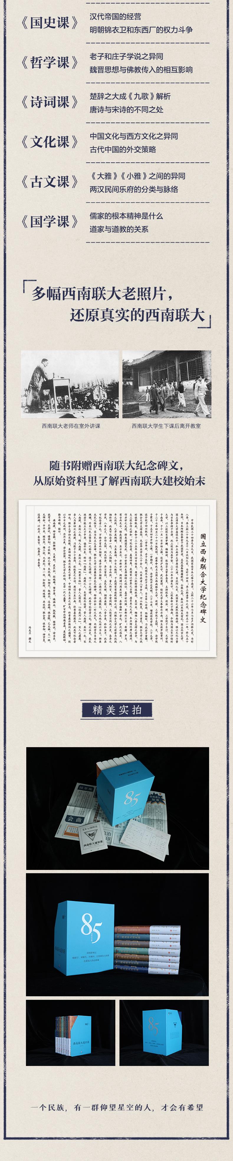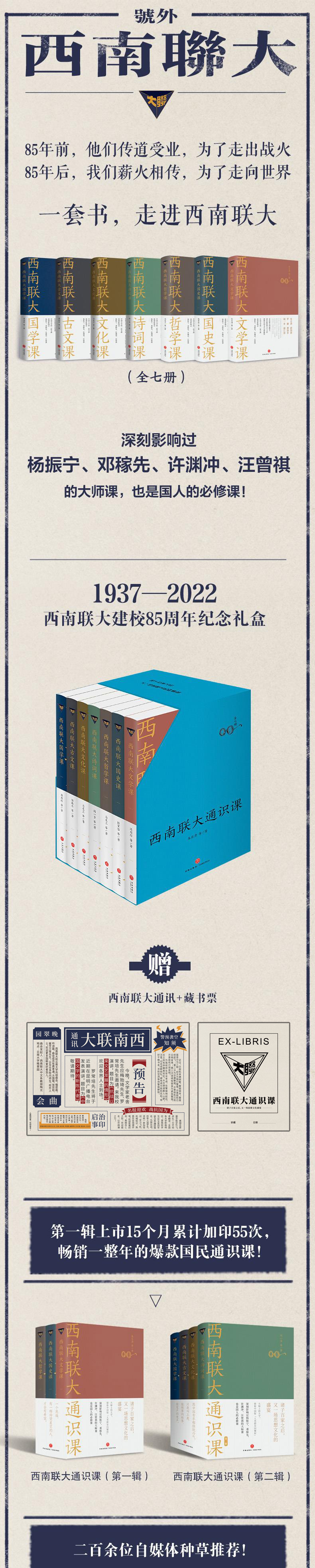 ★1937—2022,西南联大建校85周年纪念!★深刻影响过杨振宁、邓稼先、许渊冲、汪曾祺的大师课,也是国人的必修课!★第一辑上市15个月创下加印55次记录,百余自媒体种草推荐。★出版目前,首次整理编校15位西南联大著名教授的作品和讲义,分册主题为:文学、国史、哲学、诗词、文化、古文、国学。★编校团队筛选100多种底本,精心编校3年,勘误500余处,每册平均2000+知识点。★中国教育的天花板,ZUI豪华讲师天团!全面展现闻一多、朱自清、冯友兰、汤用彤、傅斯年、陈寅恪等教授新颖、前沿性十足的学术成果。★联大8年,培养了2位诺贝尔奖得主5位中国国家优选科技奖得主8位“两弹一星”功勋奖章得主170多位中国科学院院士和中国工程院院士★诞生于战火的大学,保存了中国文脉,山河沦落处,群星闪耀时。★附带西南联大纪念碑文拉页,从碑文里了解西南联大建校始末。★书中还有西南联大校徽、校歌歌词等,有关西南联大历史的记录。