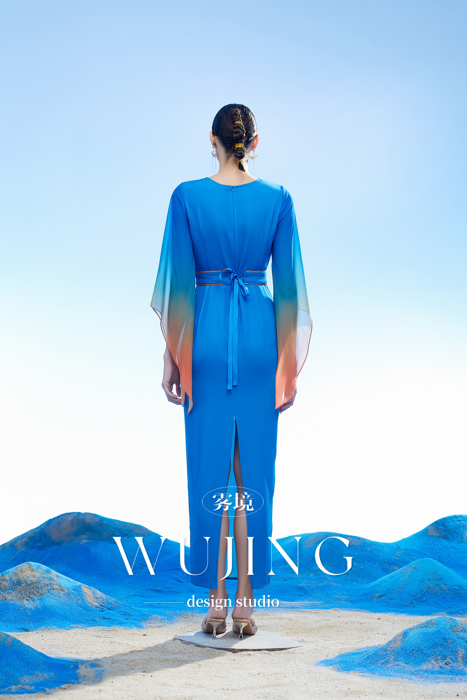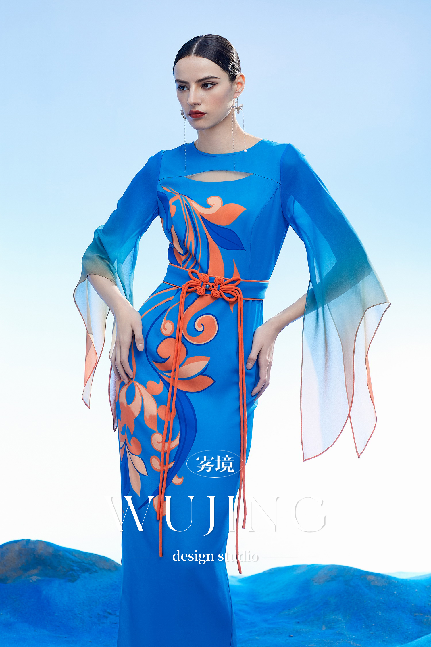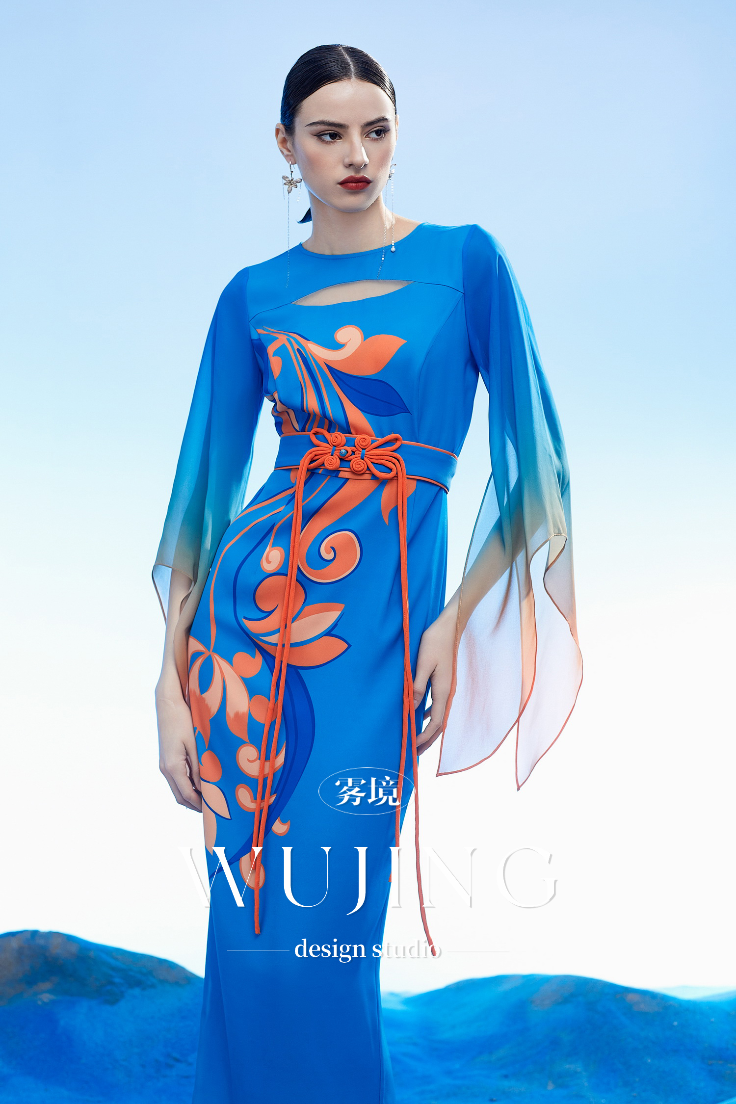3204072 灵泽岚霏 韩国进口水晶乔其纱进口纹理蜂窝缎连衣裙 雾境