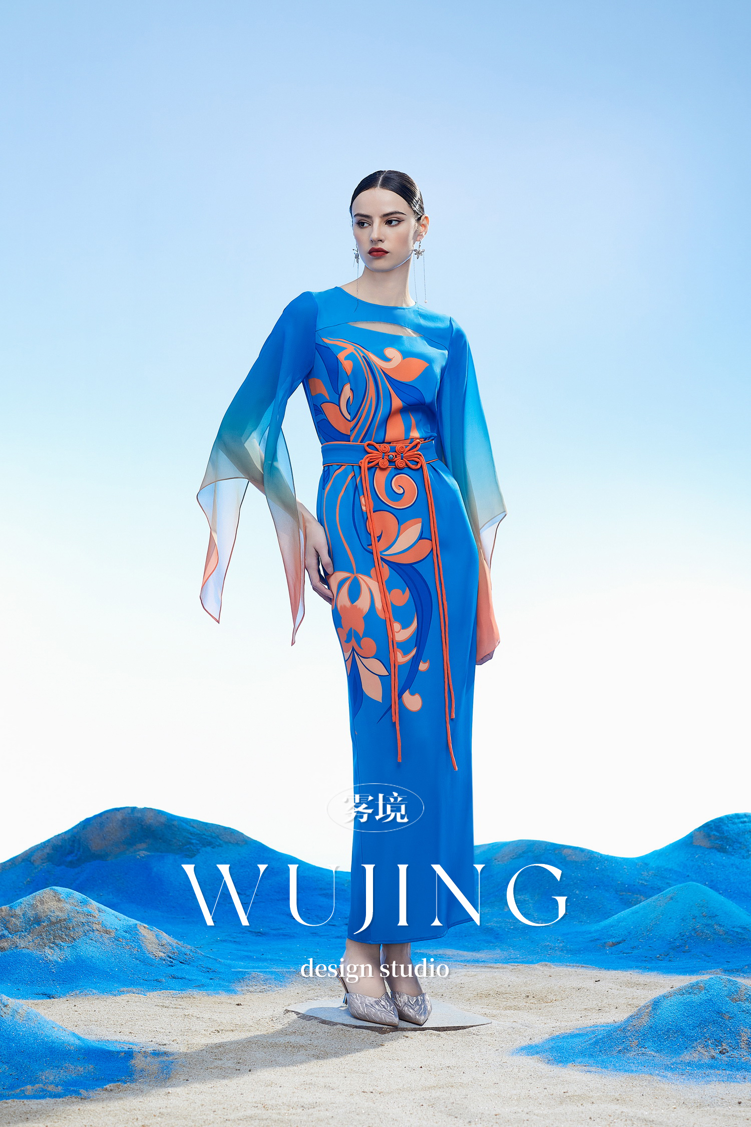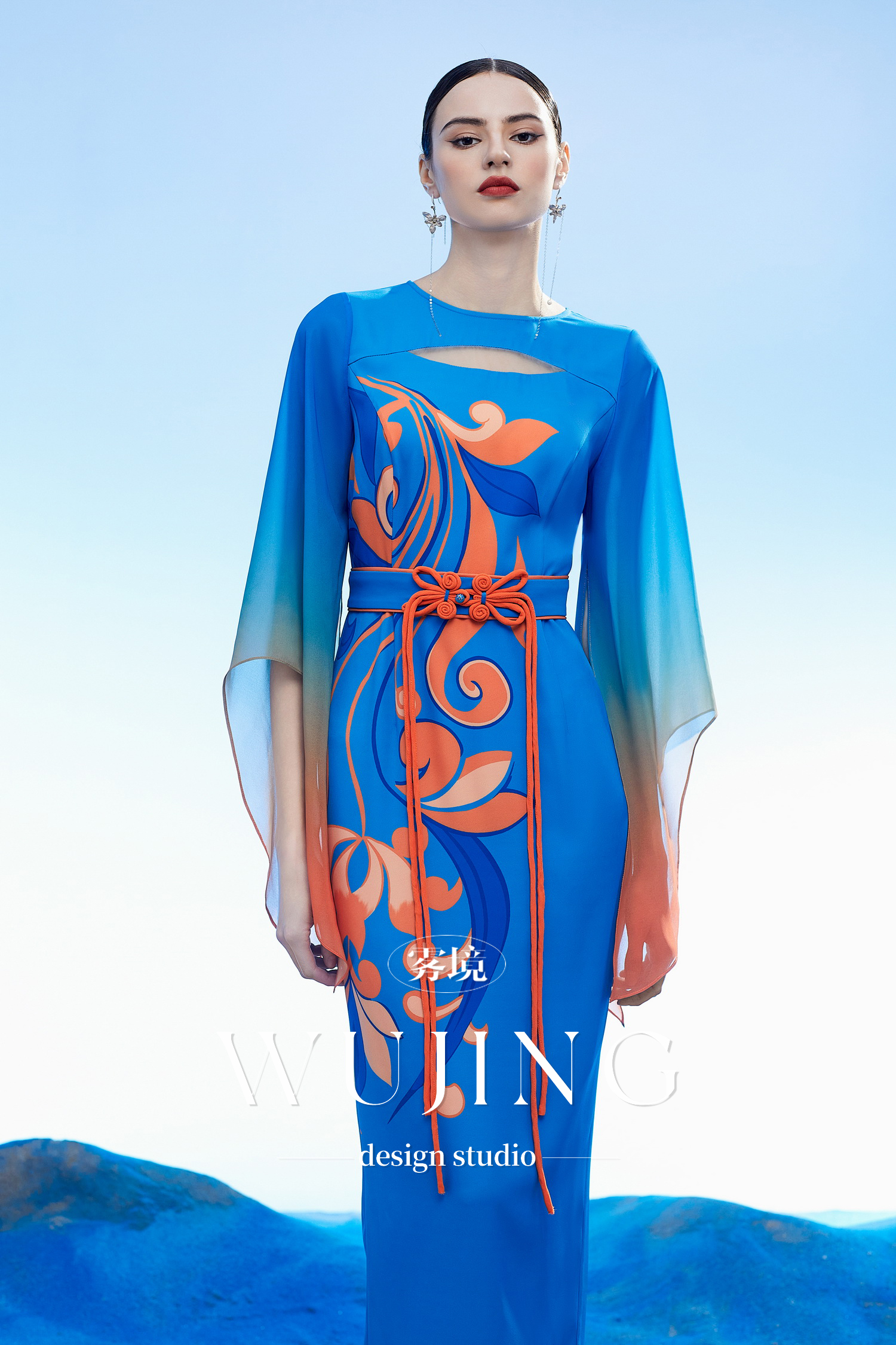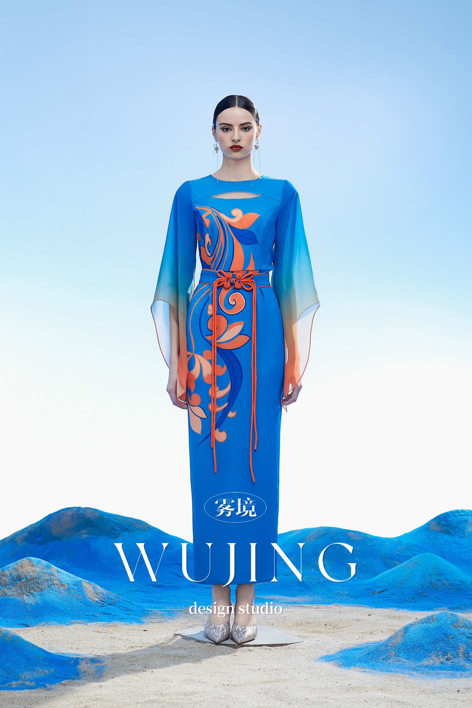 3204072 灵泽岚霏 韩国进口水晶乔其纱进口纹理蜂窝缎连衣裙 雾境