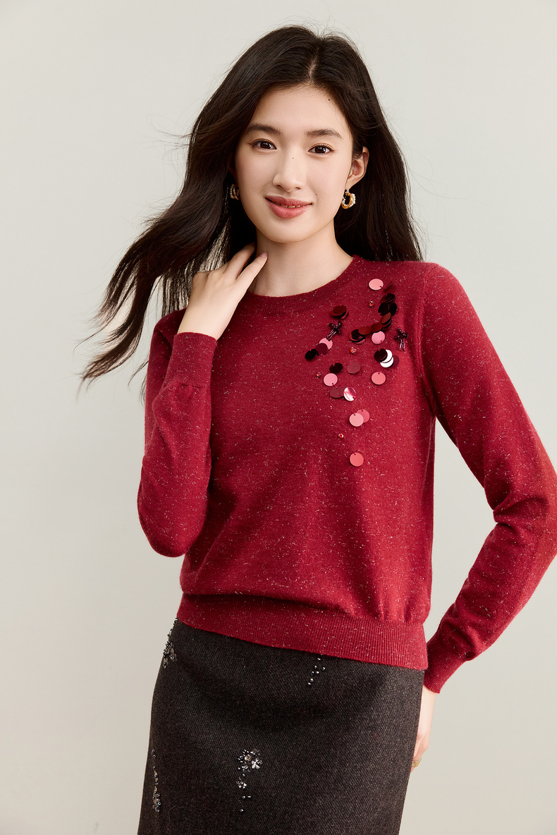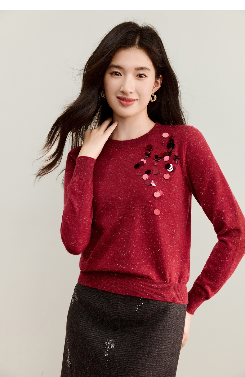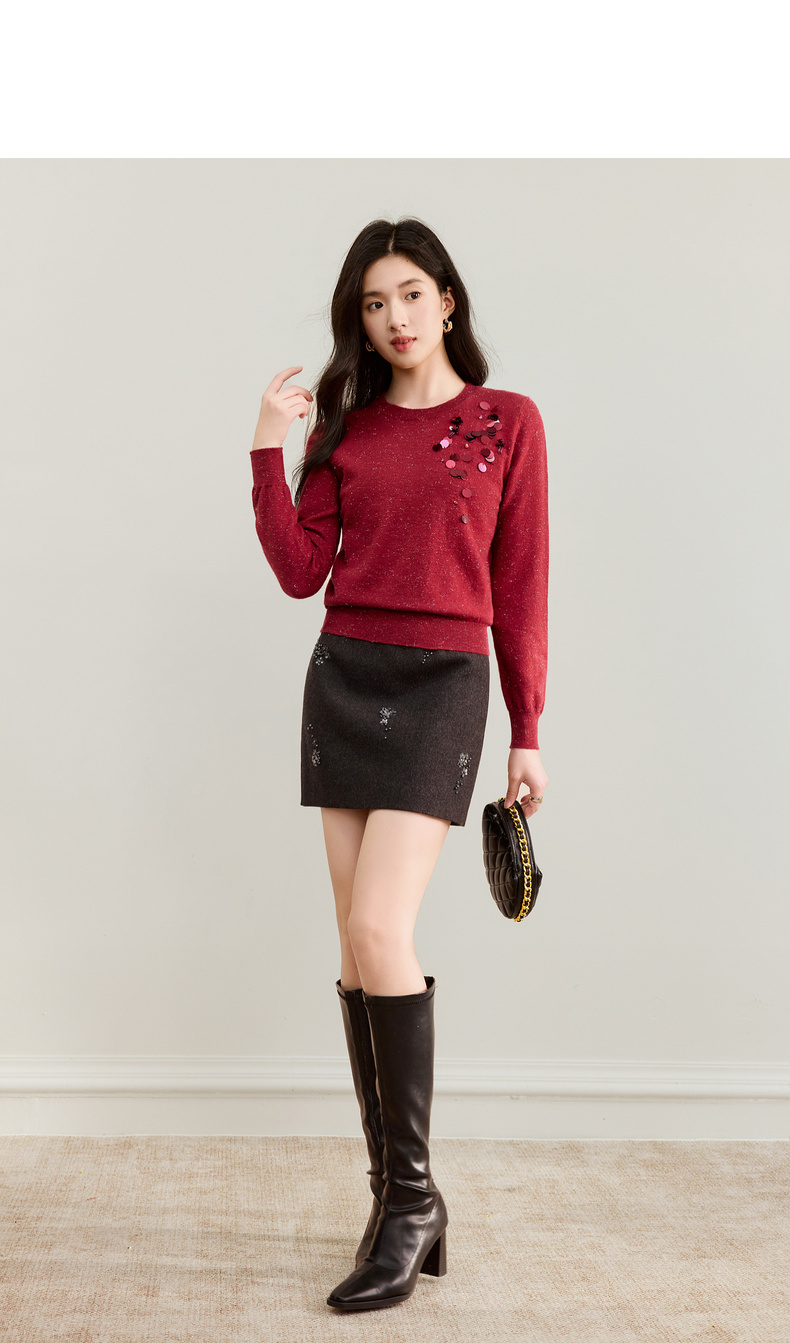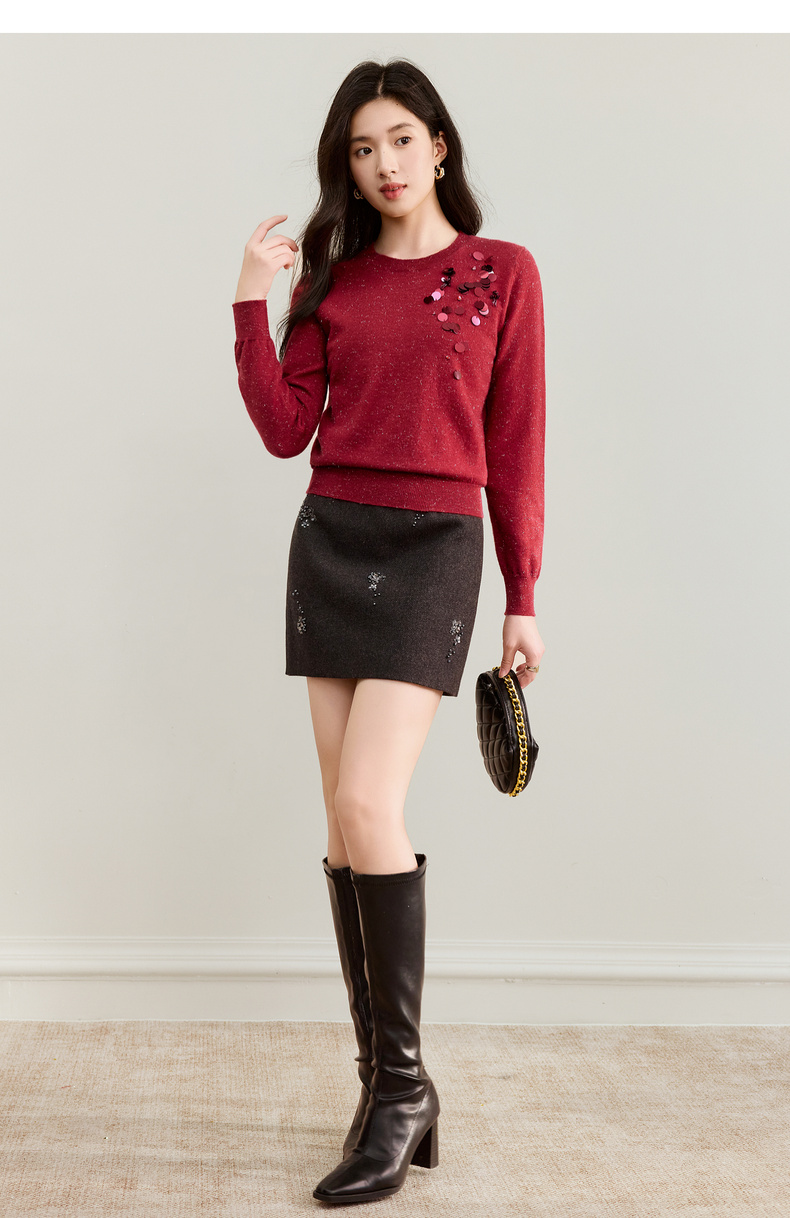 【内购】【簇状亮片花卉】设计感圆领弹力银丝珊瑚绒长袖针织衫-W53HE3793