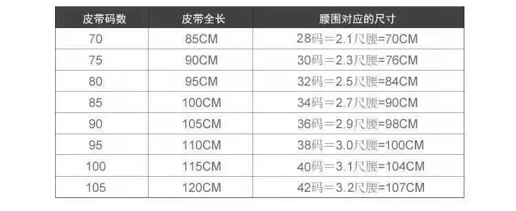 以105码为例,皮带头端到第一孔距离100cm,到最后一孔距离110cm,所以推荐腰围107cm涵盖范围之内。