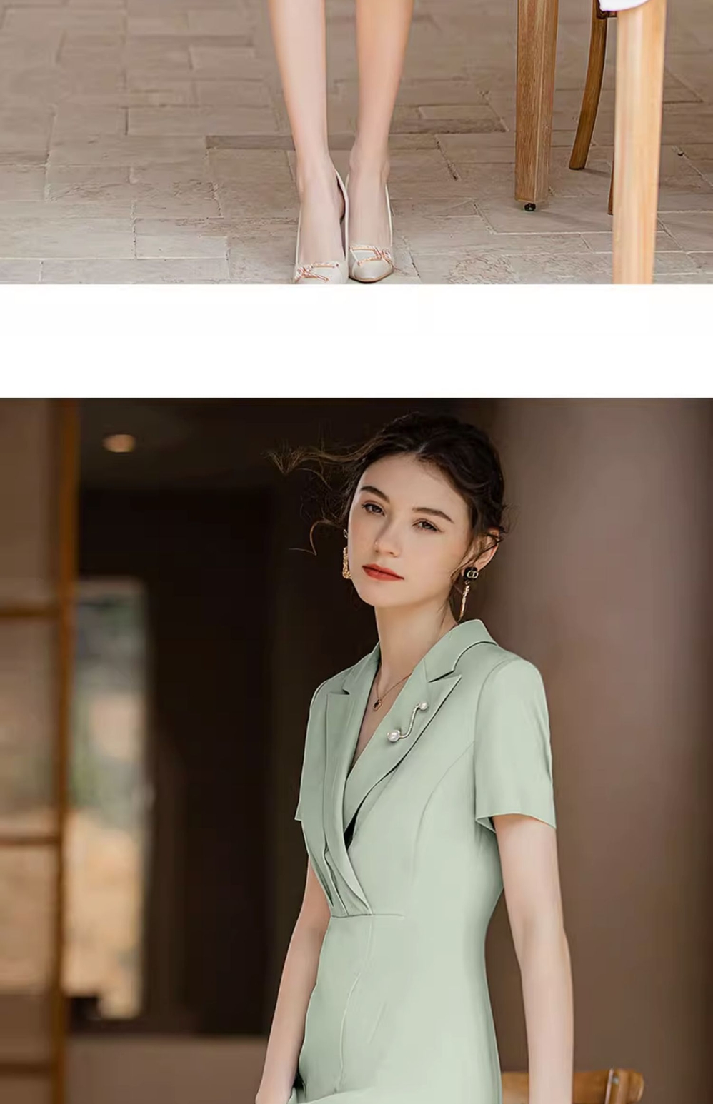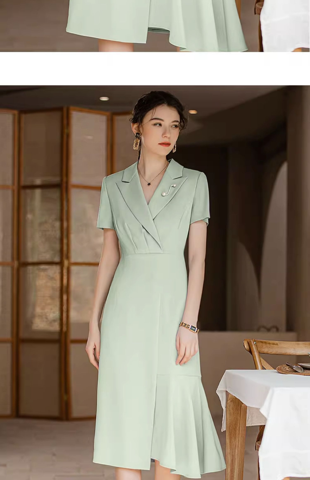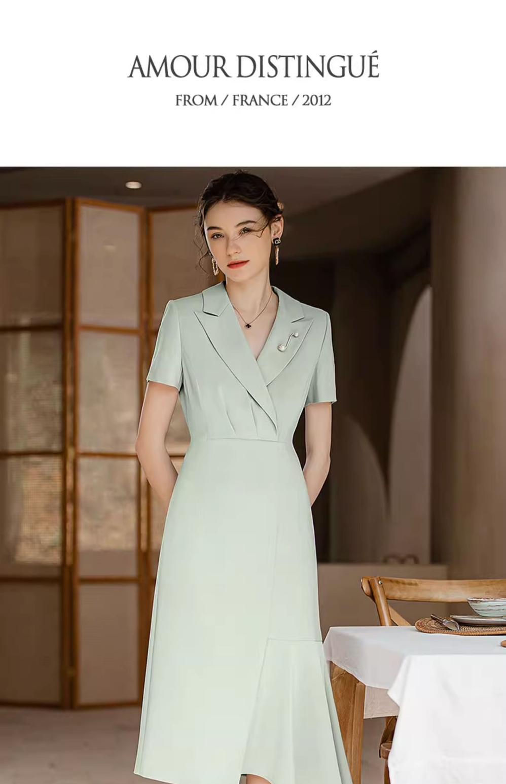 IWY/ 夏季绿色西装连衣裙短袖不规则中长款褶皱小众设计感薄西装裙Q897