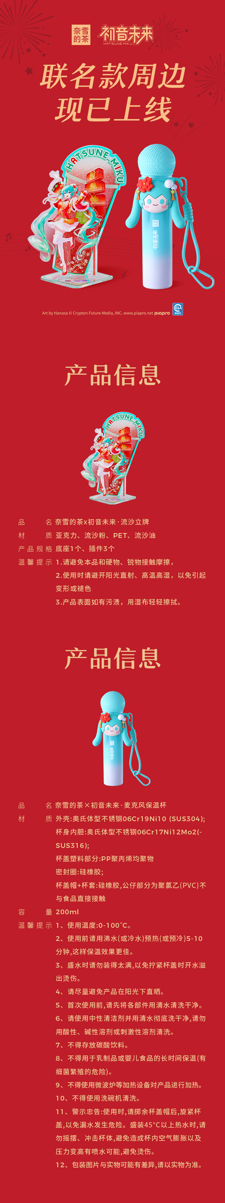 奈雪的茶X初音未来联名周边 麦克风保温杯&亚克力流沙立牌