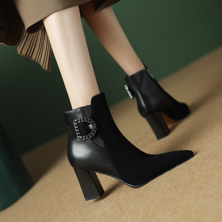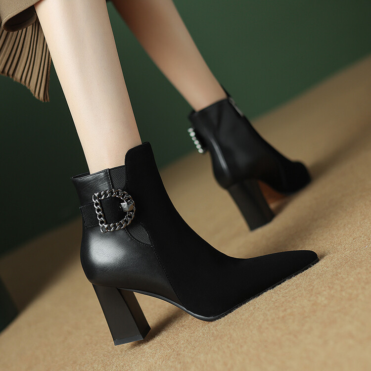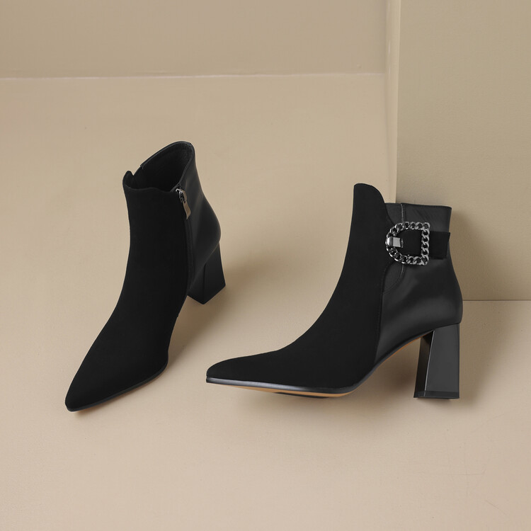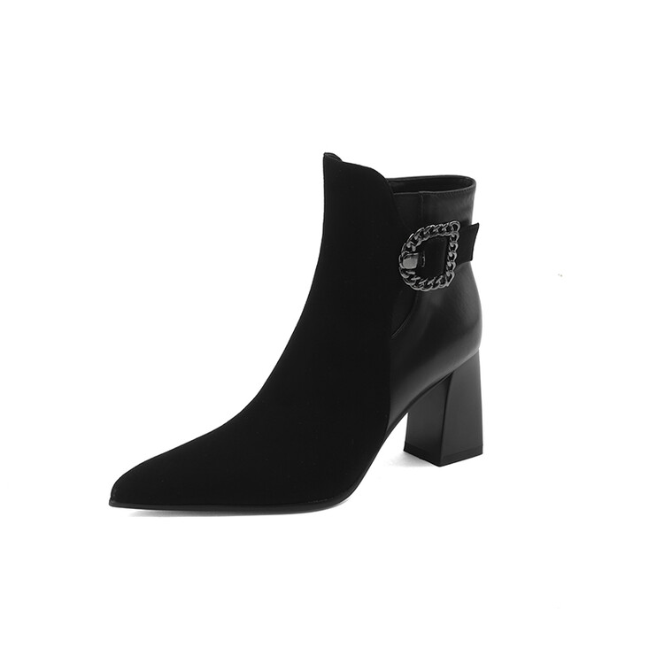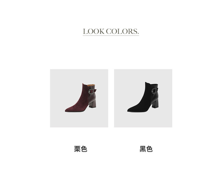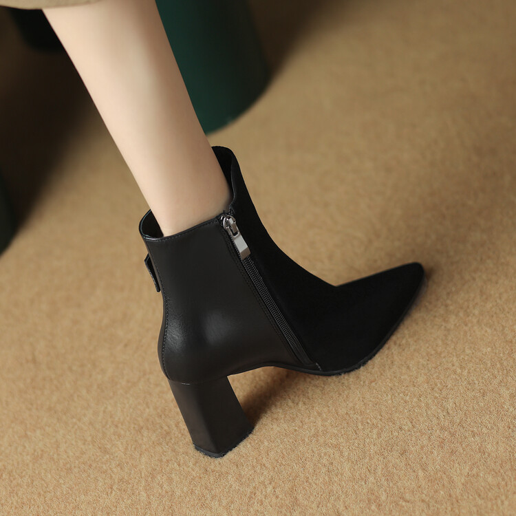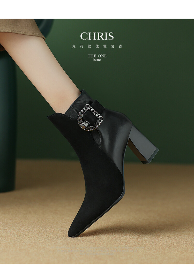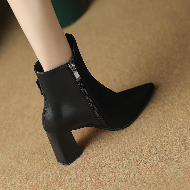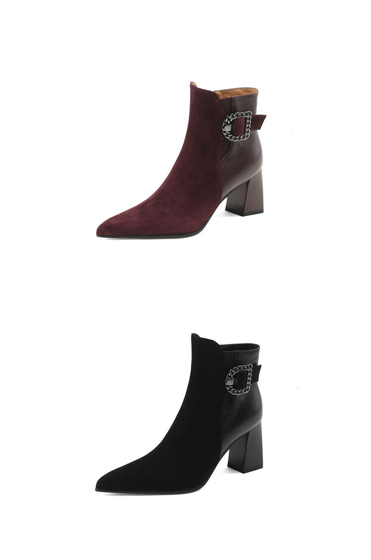 尖头拼接,复古皮带扣高粗跟短靴ZF3808
