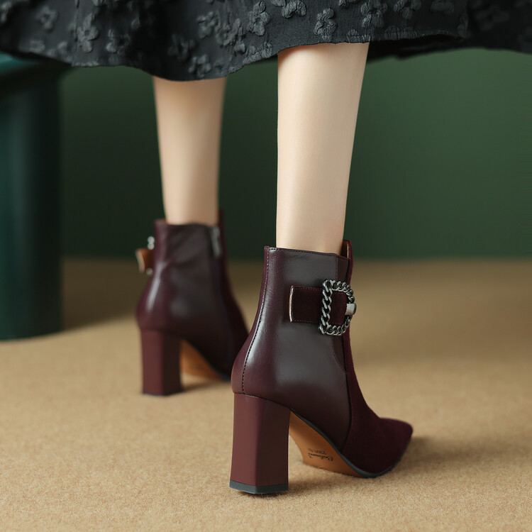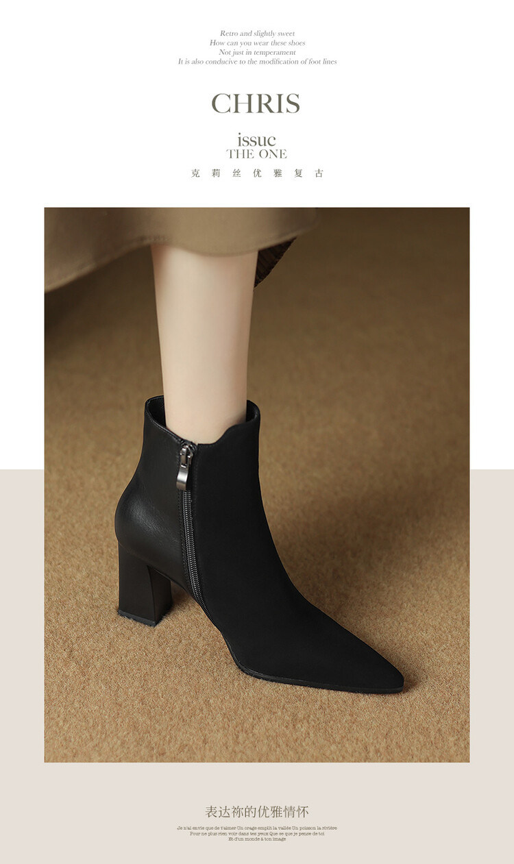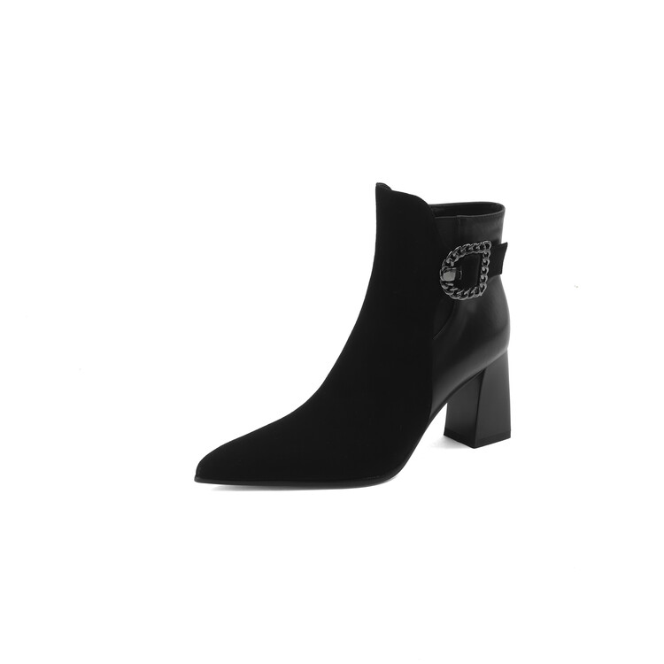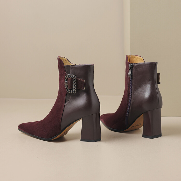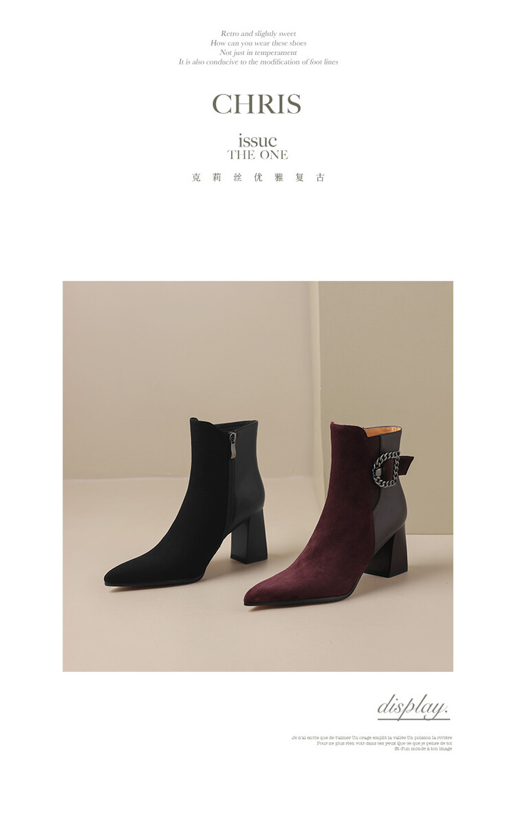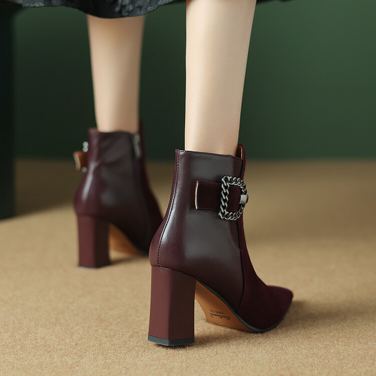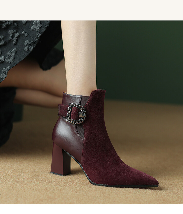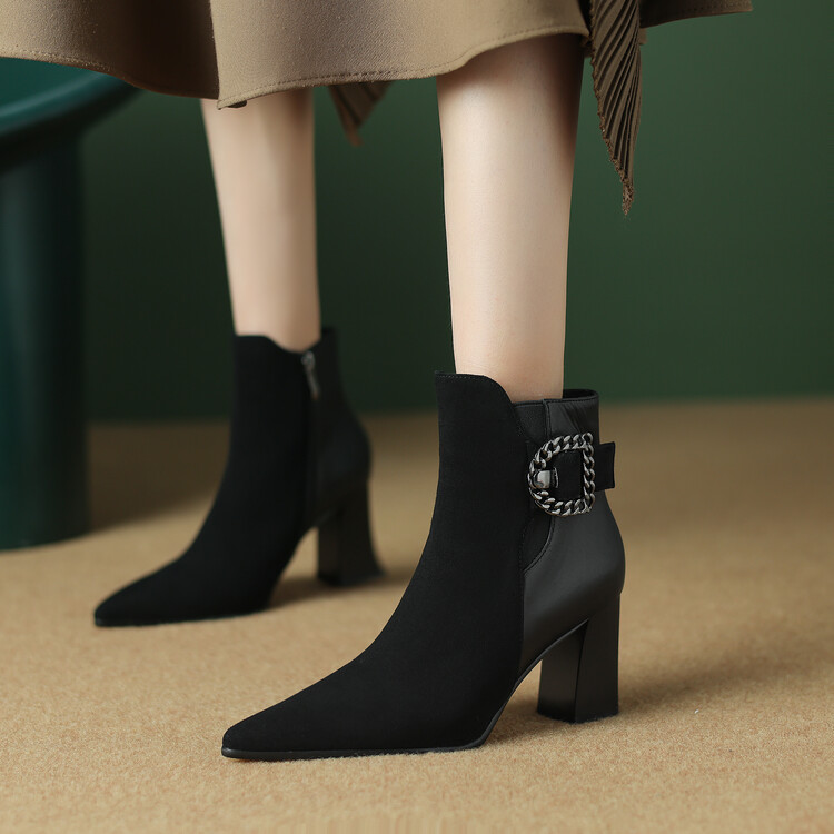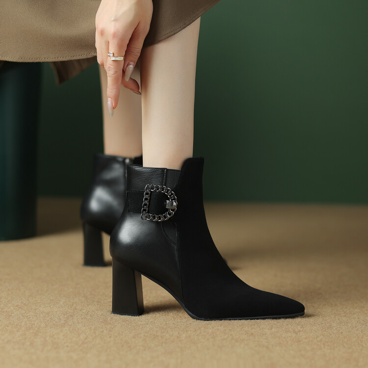 尖头拼接,复古皮带扣高粗跟短靴ZF3808
