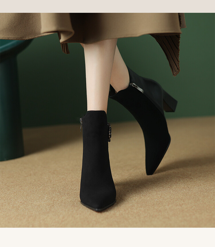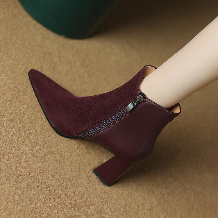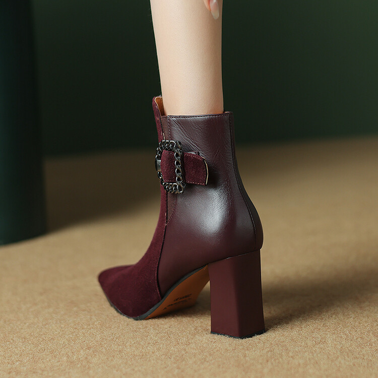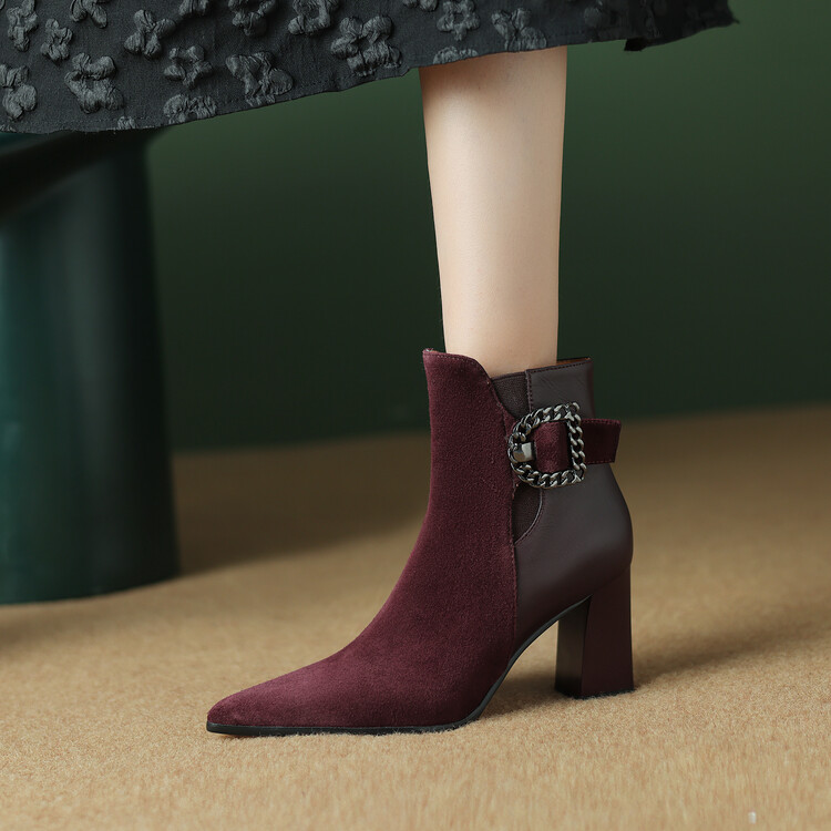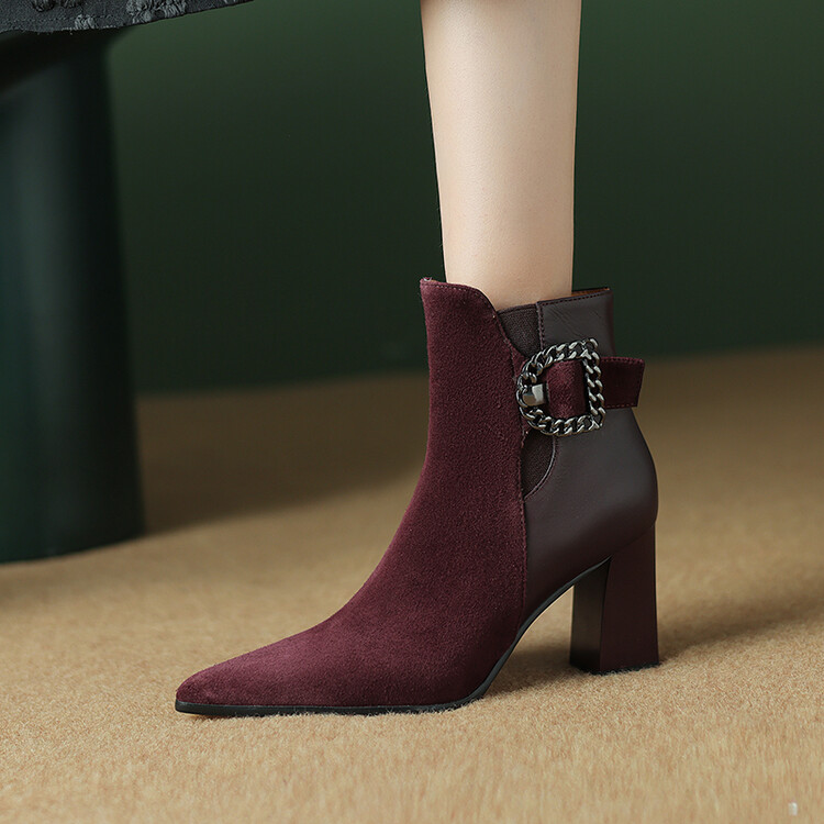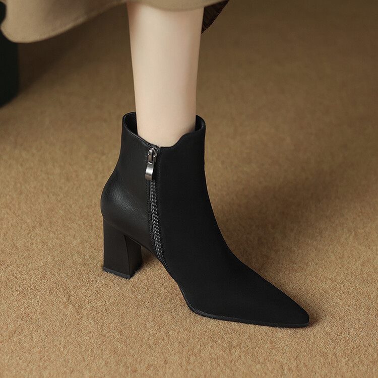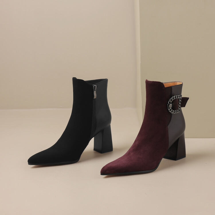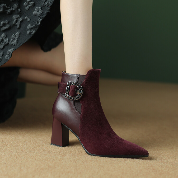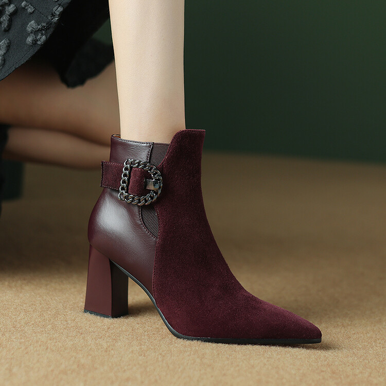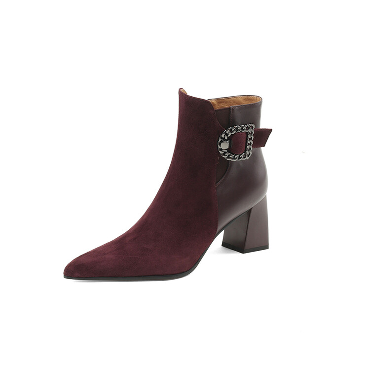 尖头拼接,复古皮带扣高粗跟短靴ZF3808