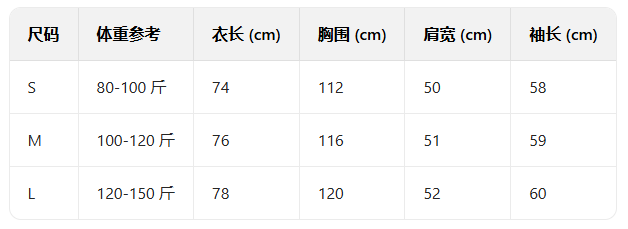 【尺码】S(80-100斤),M(100-120斤),L(120-150斤)