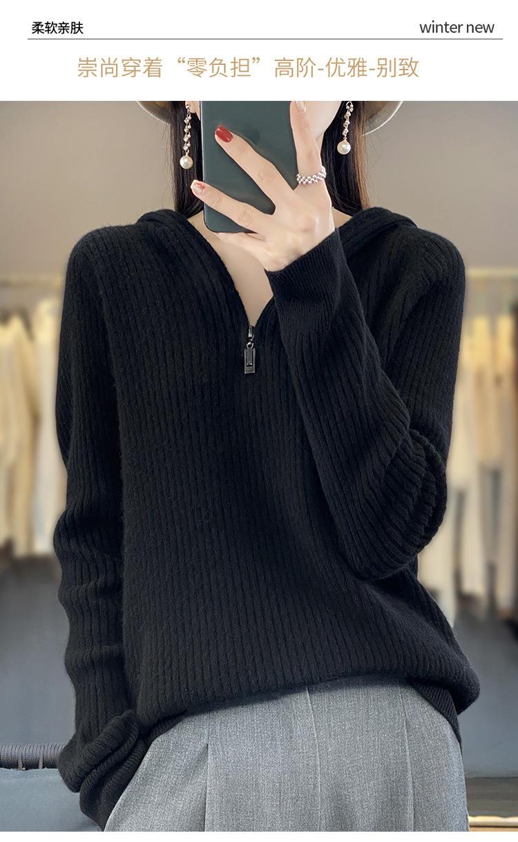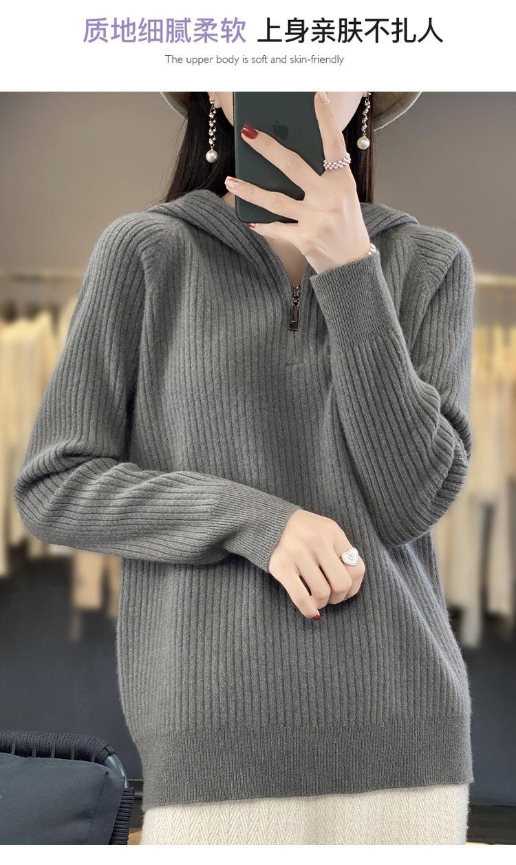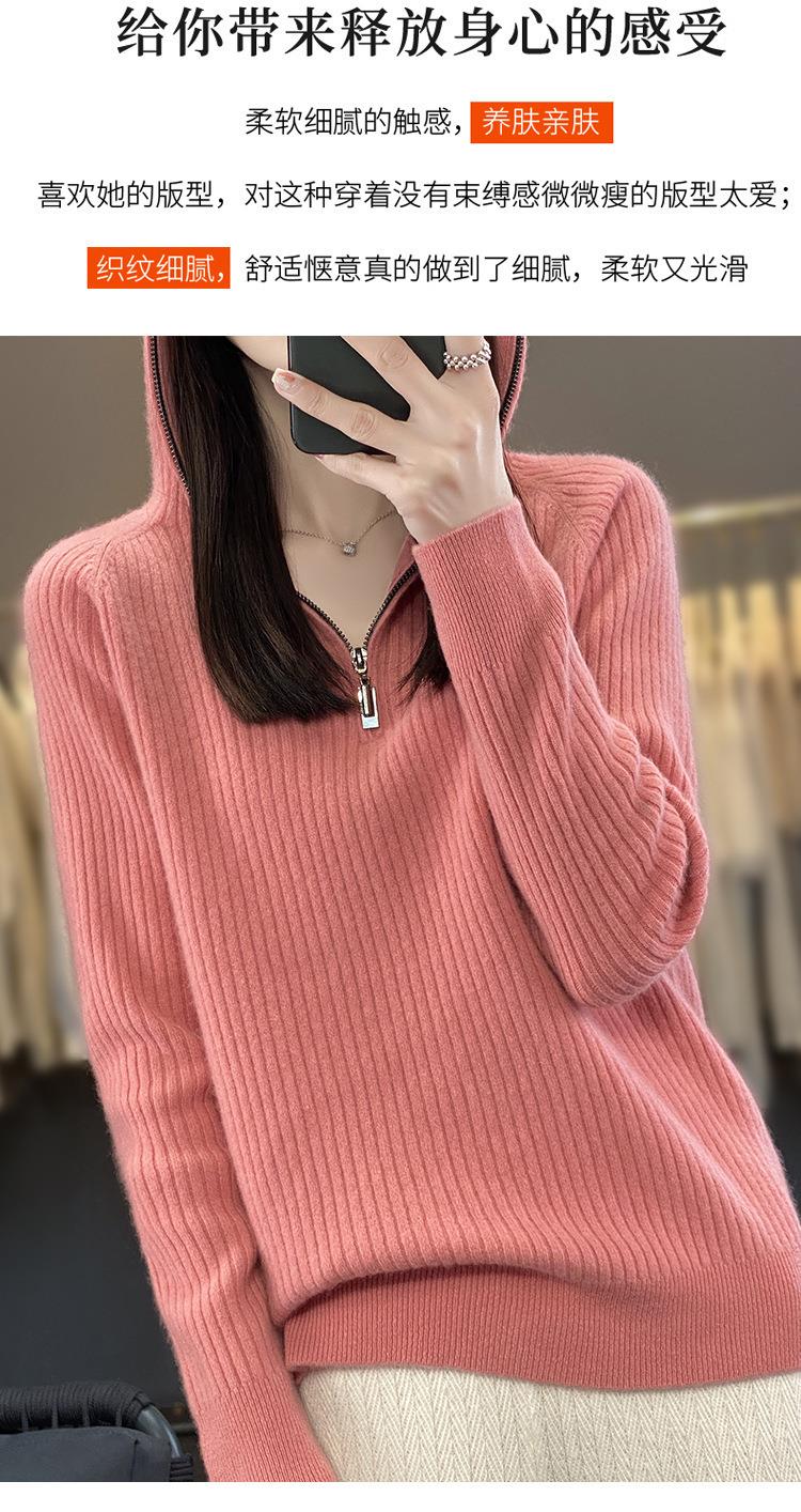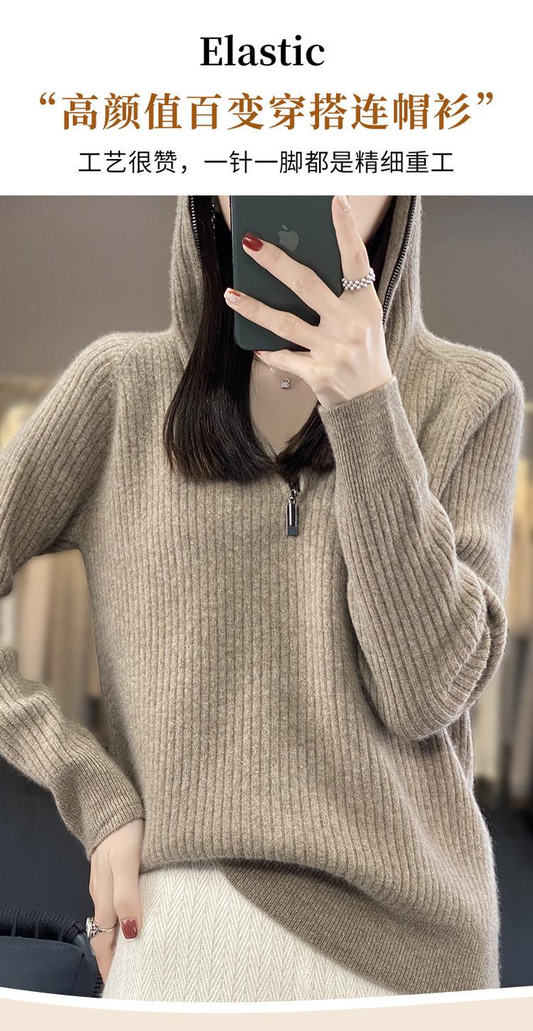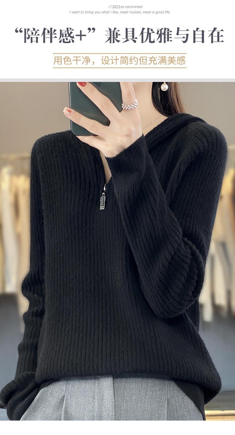 2023早秋新款半开领拉链连帽针织衫女套头弹力柔软毛衣上衣外套潮