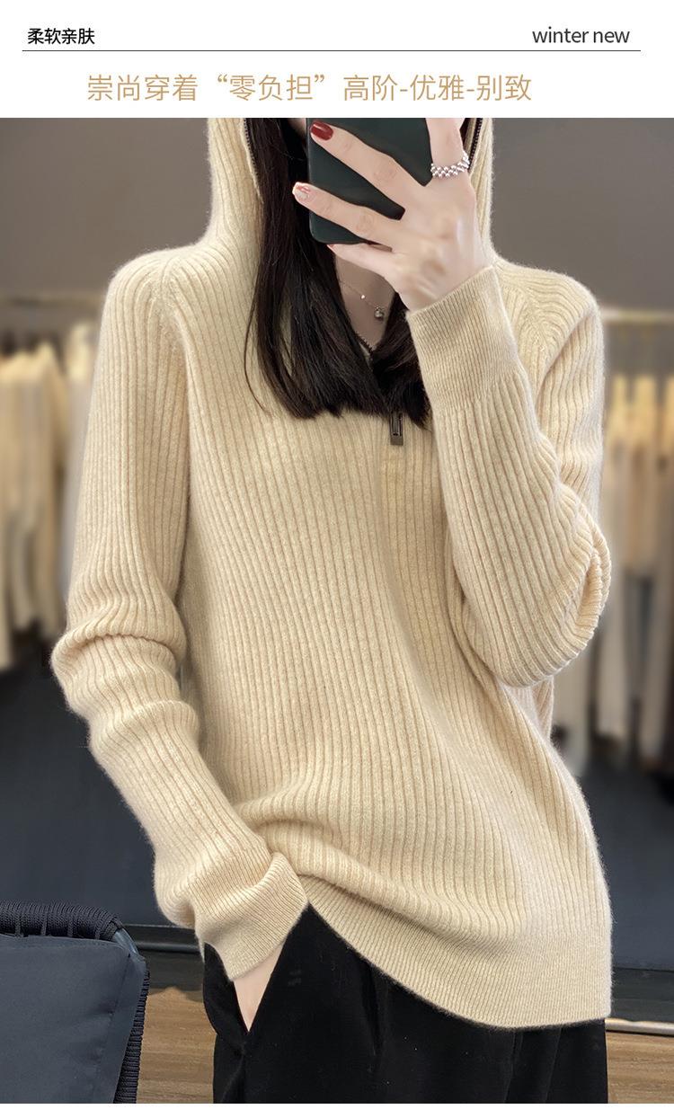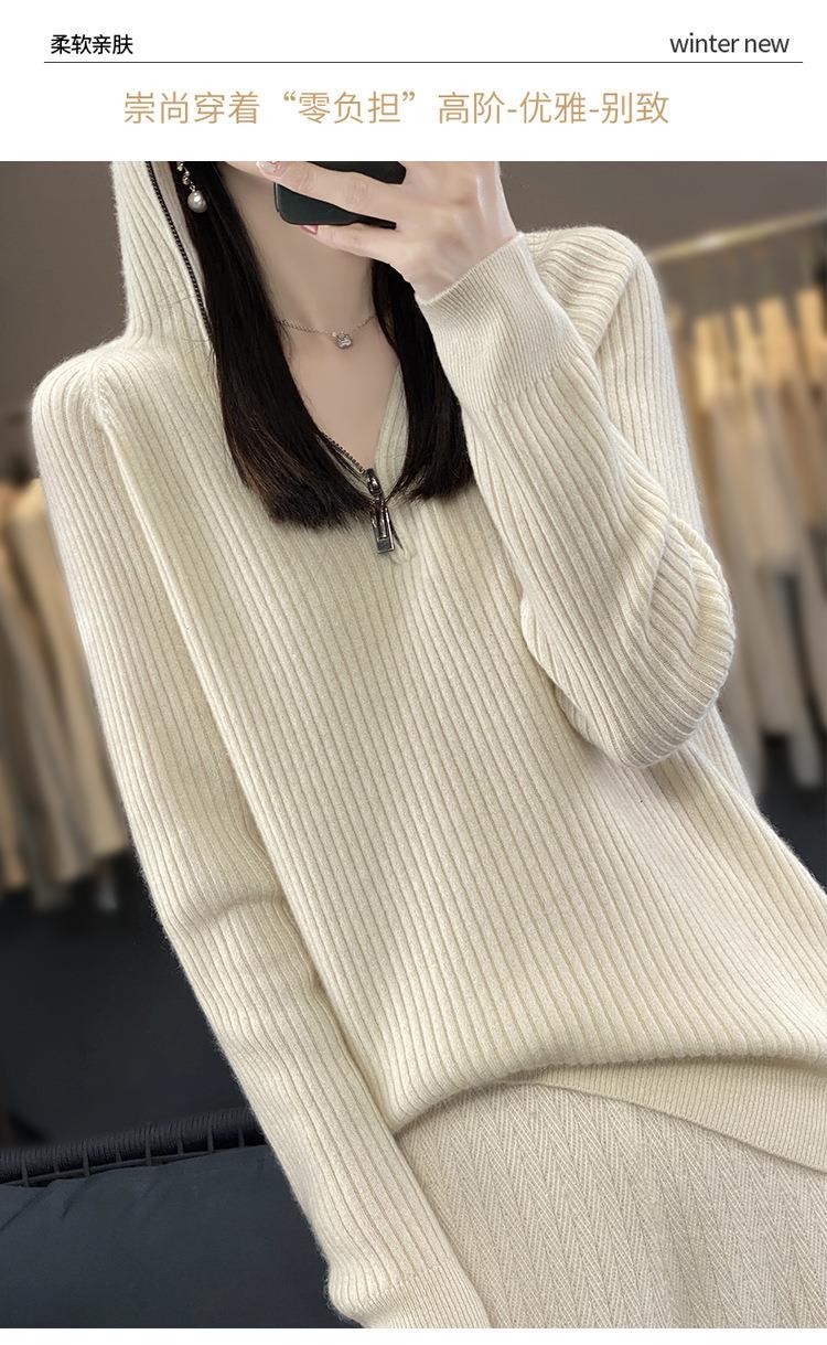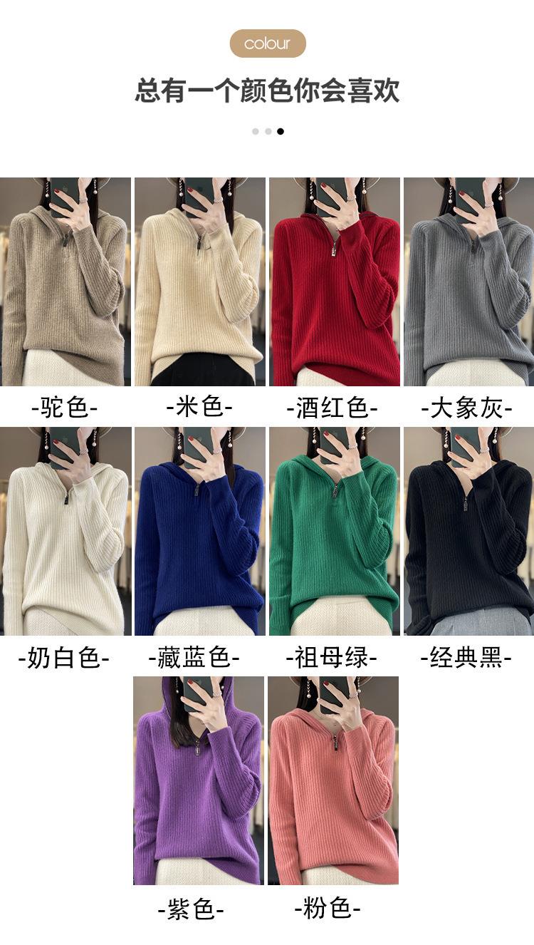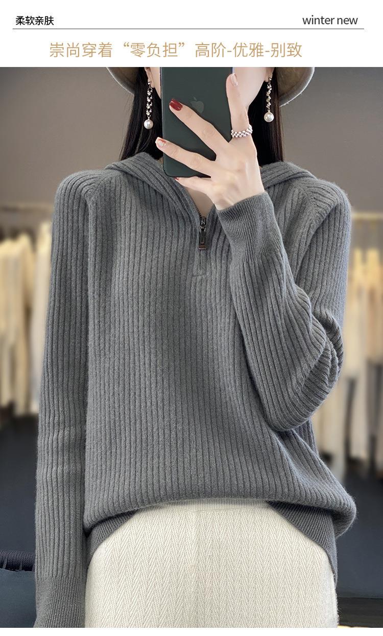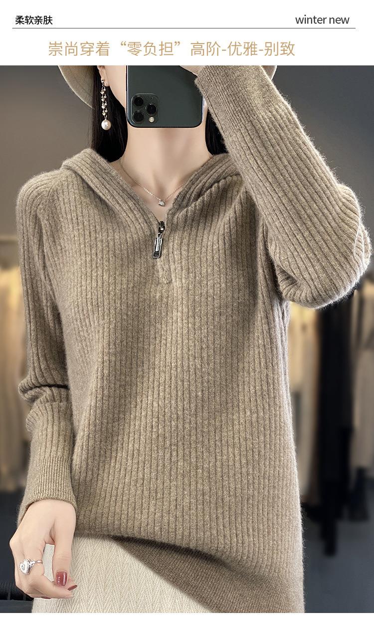 2023早秋新款半开领拉链连帽针织衫女套头弹力柔软毛衣上衣外套潮