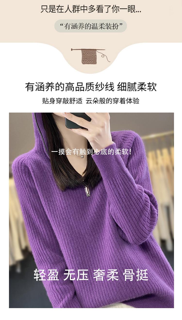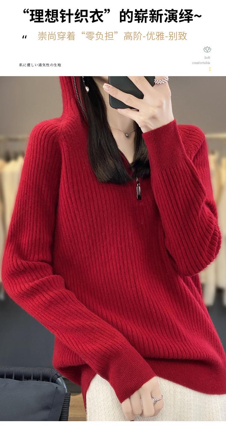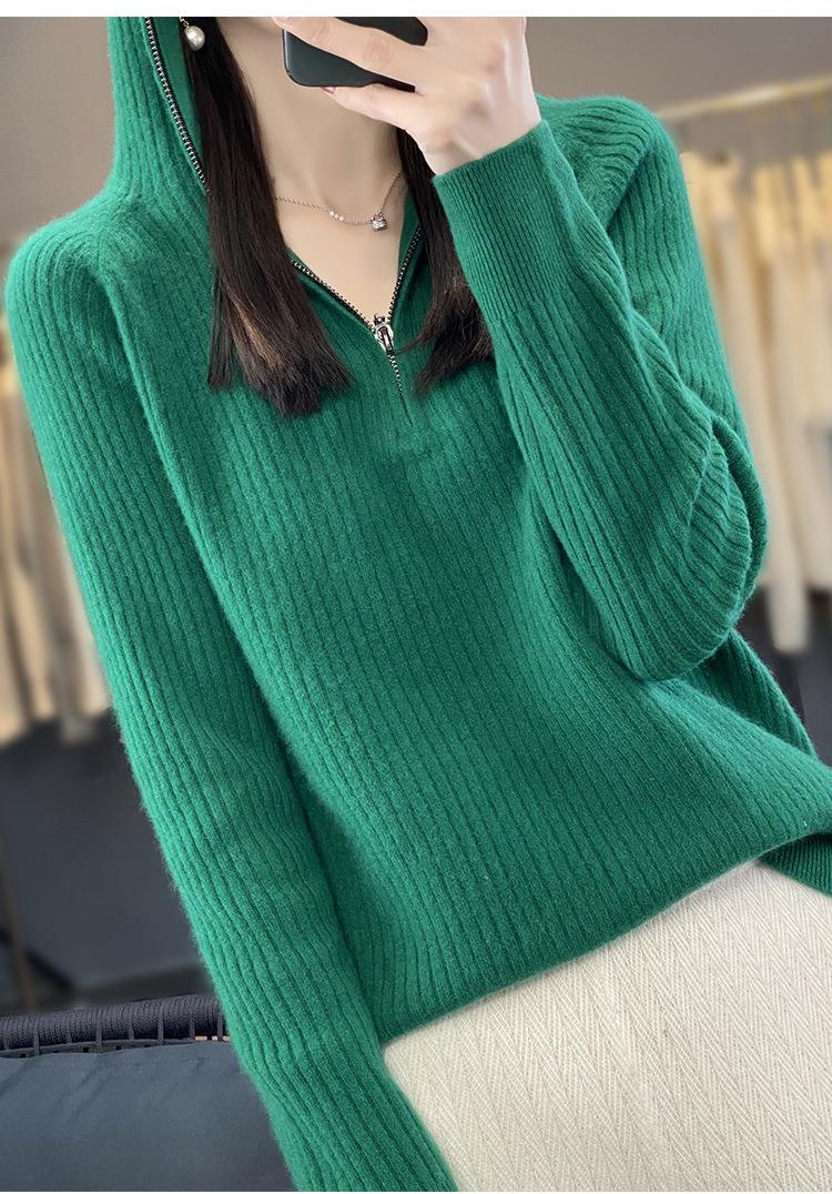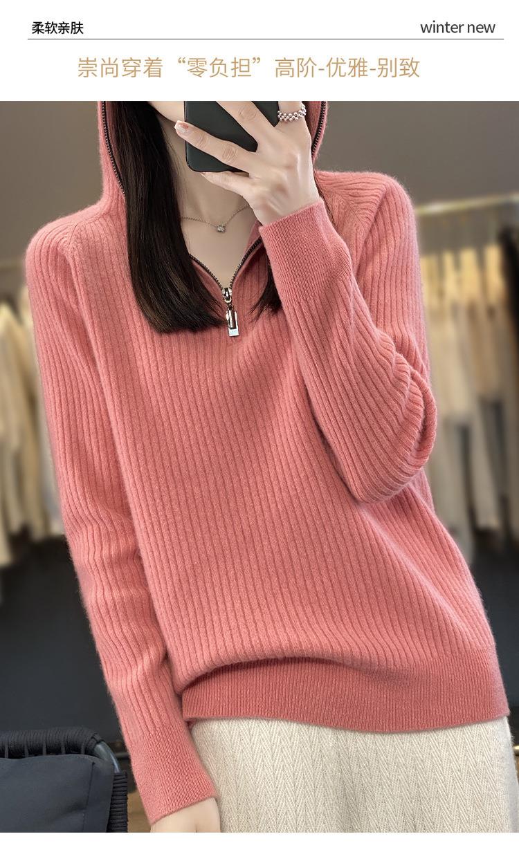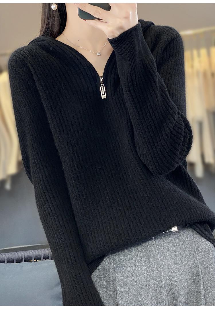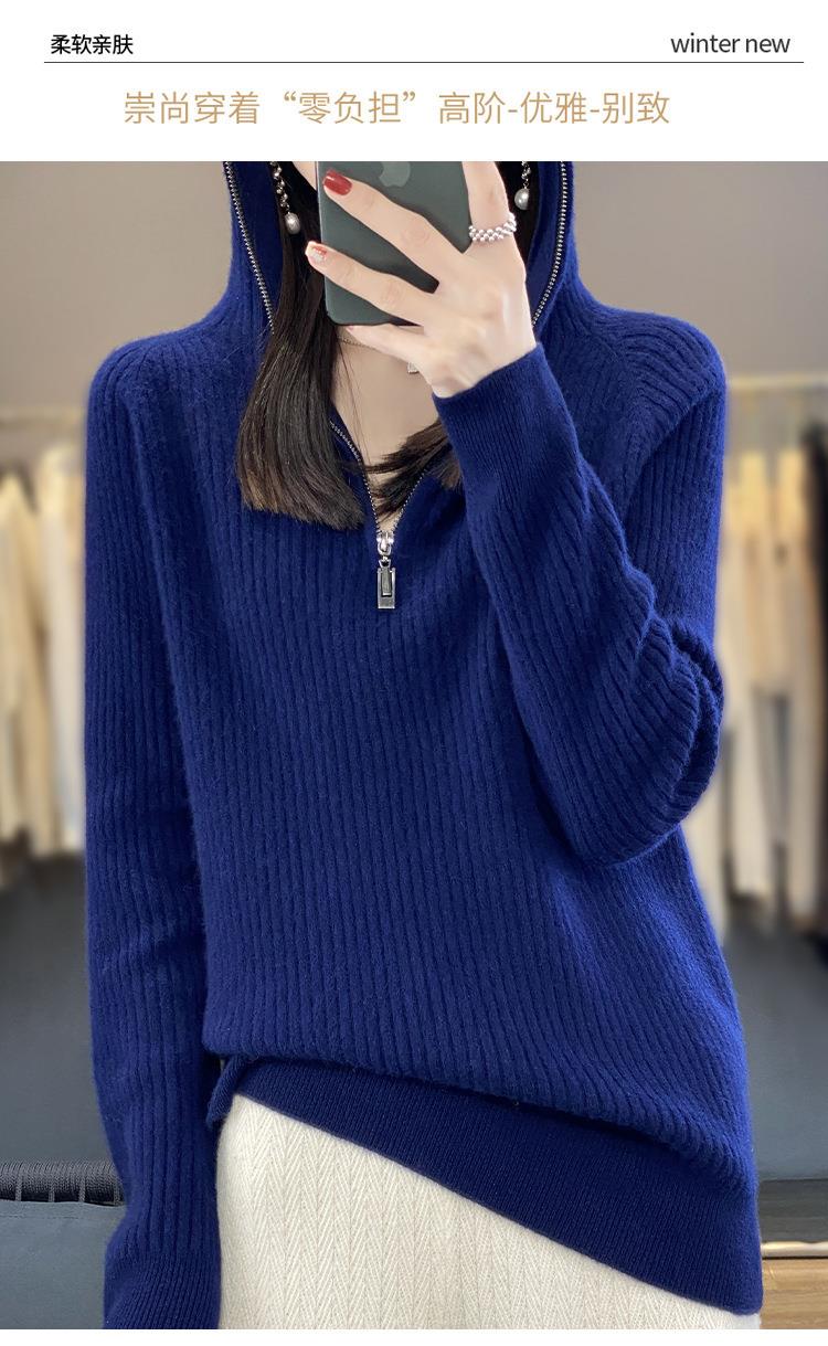 2023早秋新款半开领拉链连帽针织衫女套头弹力柔软毛衣上衣外套潮