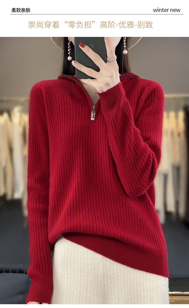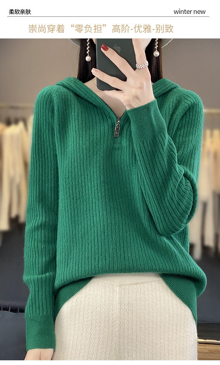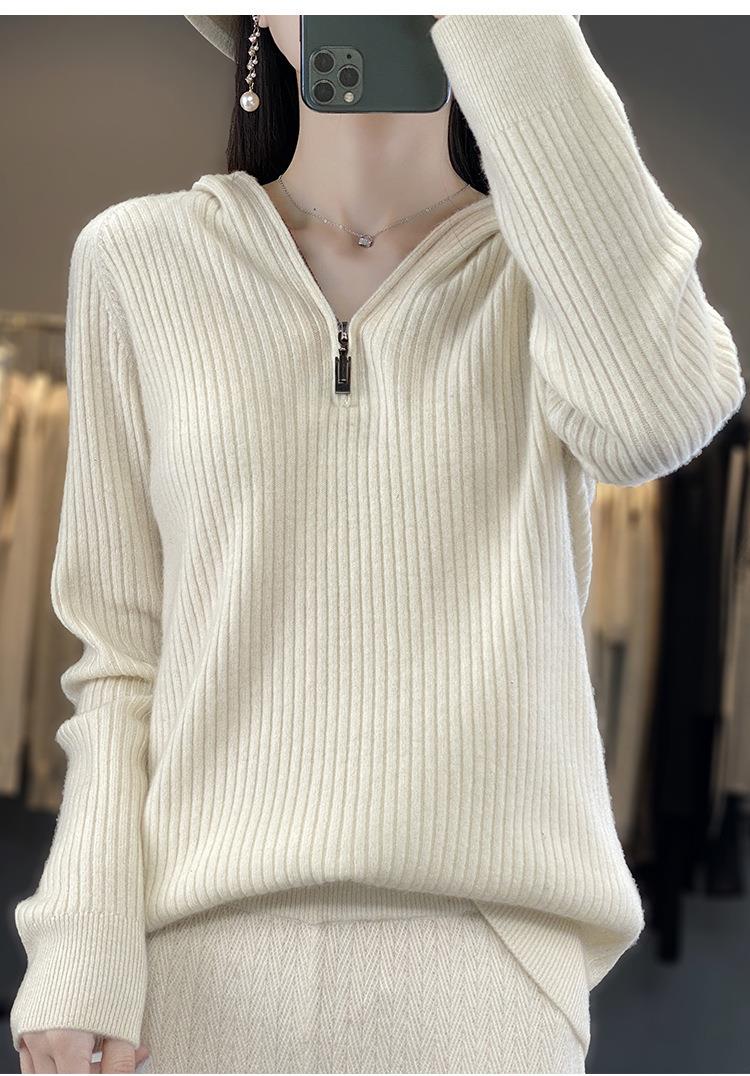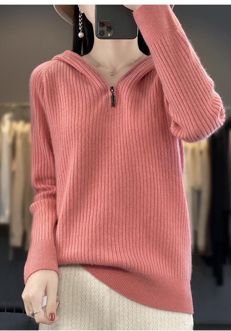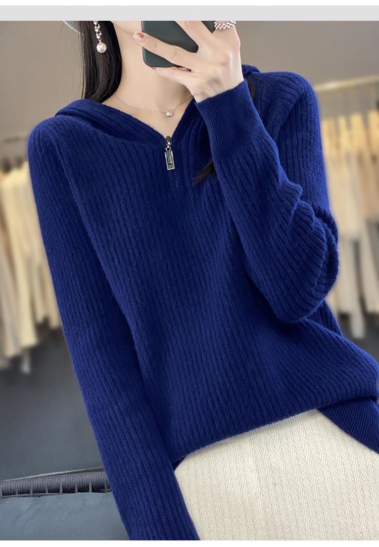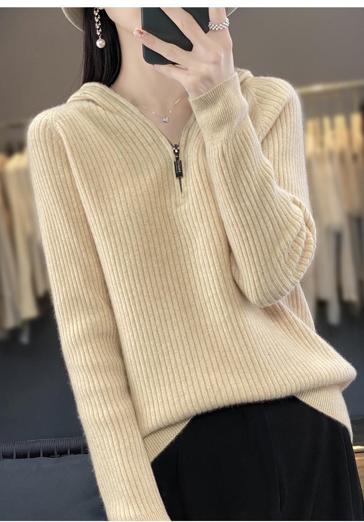 2023早秋新款半开领拉链连帽针织衫女套头弹力柔软毛衣上衣外套潮