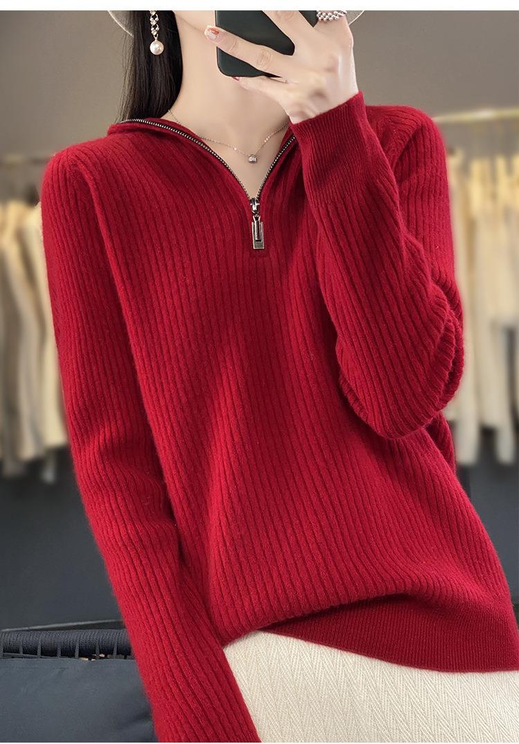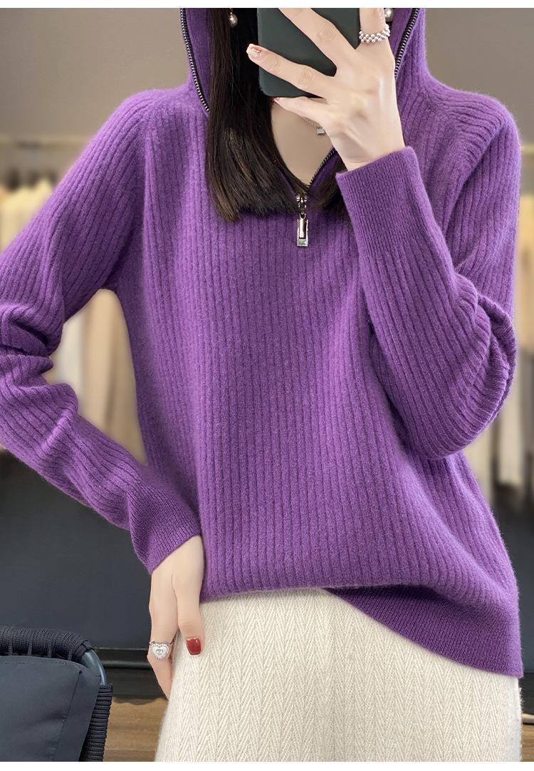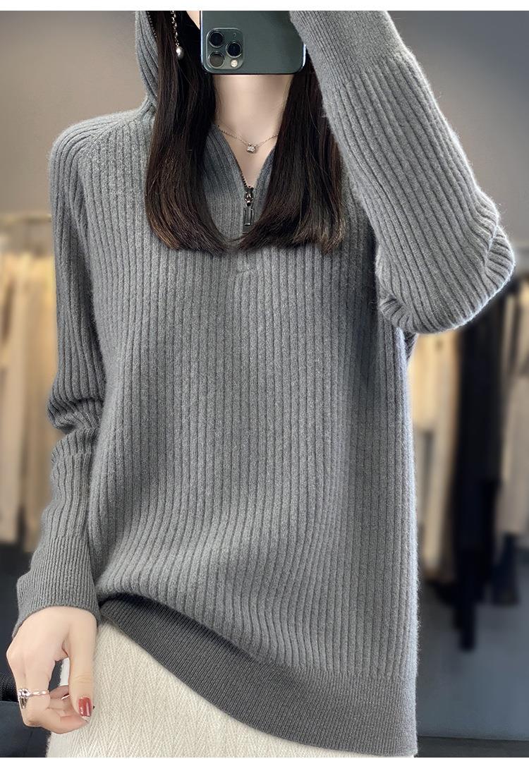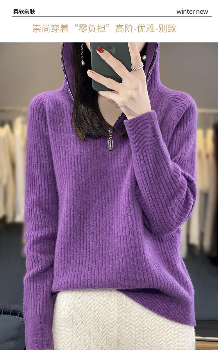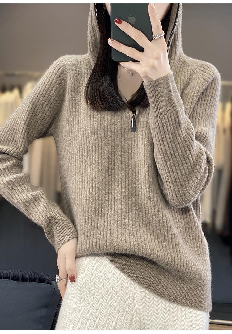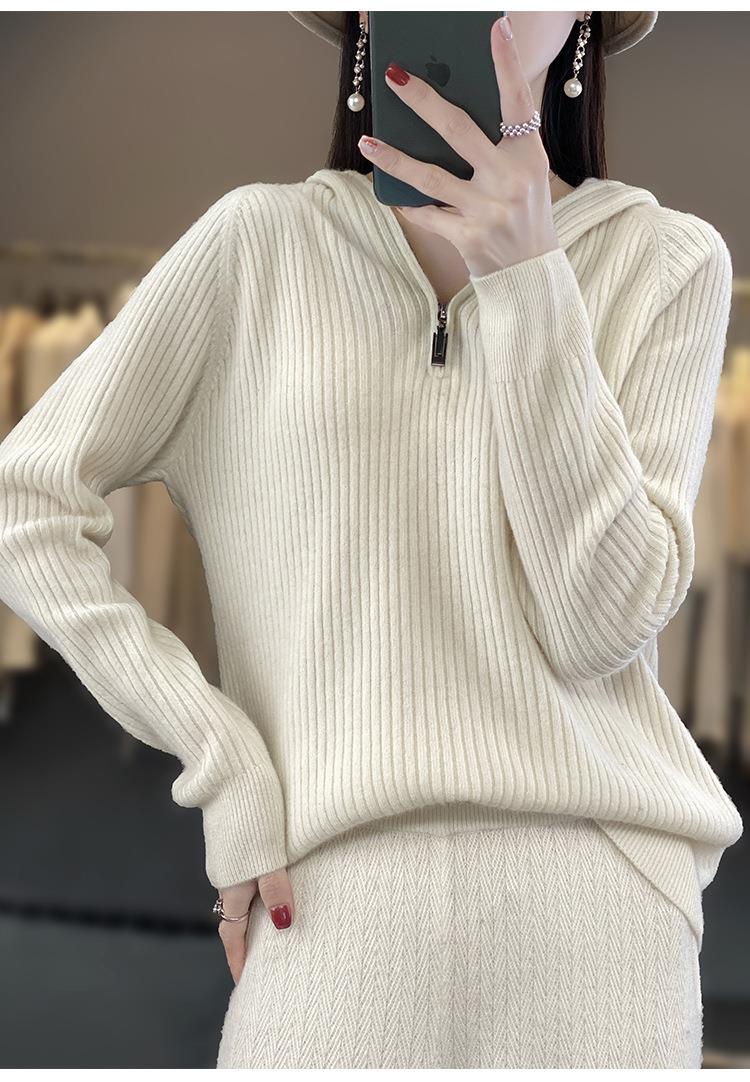 2023早秋新款半开领拉链连帽针织衫女套头弹力柔软毛衣上衣外套潮