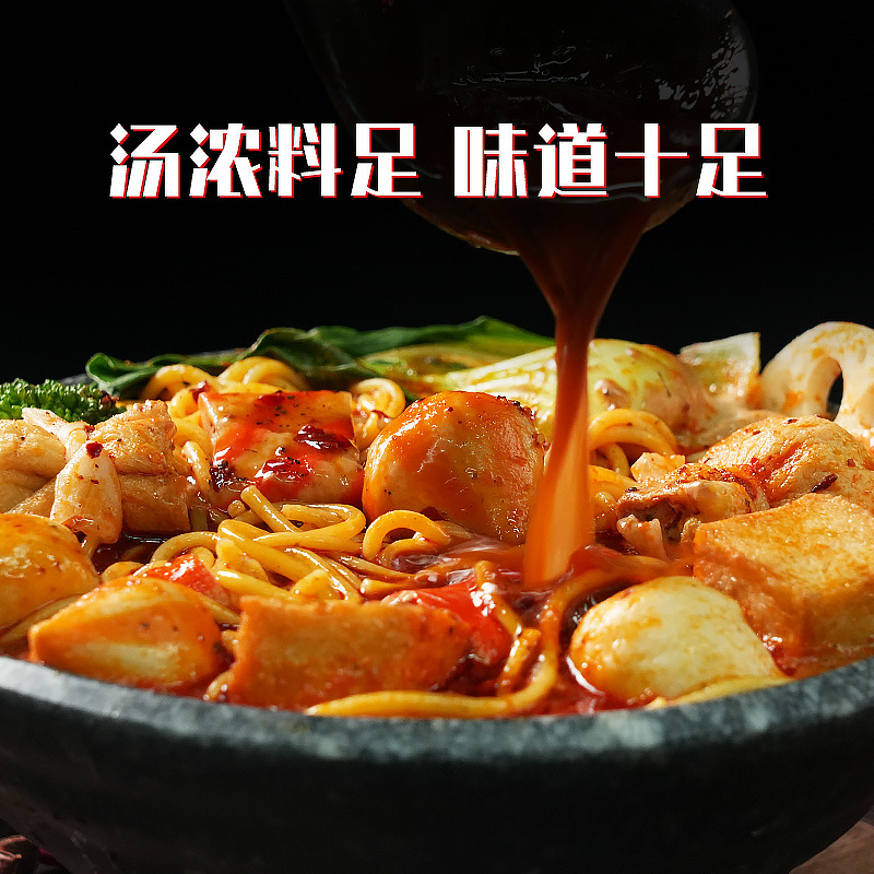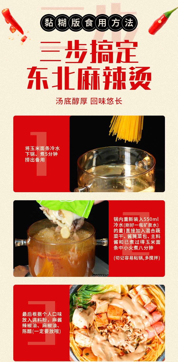 2、锅内重新装入550ML冷水(刚好一瓶矿泉水的量)直接加入混合蔬菜干、酱腌菜包、主料酱包和已煮过很玉米面条,中小火煮3-5分钟至软烂3、最后根据个人口味放入调味粉、麻酱、辣椒油、麻椒油、陈醋。(一定要后放哦!)