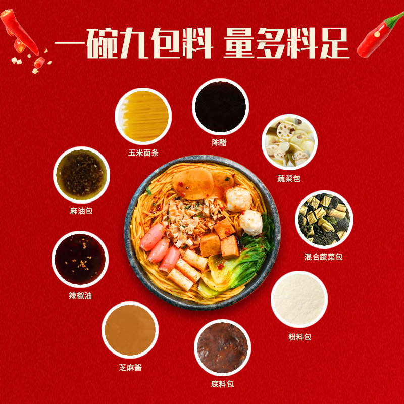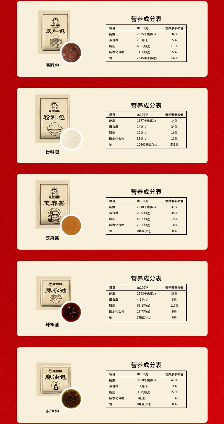 【净含量】 : 388g/袋( 内含底料包、粉料包、芝麻酱、辣椒油、麻油包、陈醋、玉米面条、蔬菜包、混合蔬菜干各一包 )