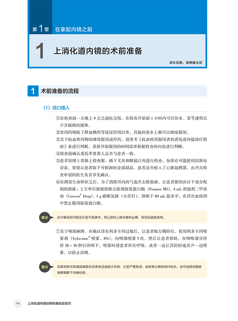 本书通过穿插大量的照片和插图,使得读者能轻松地将读到的文字内容迅速在脑海中具象化。与其说是教科书,倒不如说是一本读起来饶有趣味,且在临床上能立刻派上用场的实践用书。此外,本书最大的特点是事先向日本的内镜医生征集了平时的疑问,并且对这些问题进行了详细的解答。例如“现在都不好意思再问……”“实际情况是怎么样的?”“专家们是怎么做的呢?”等,这些在以往的书中没有记载的内容,本次我们也进行了深入的探讨。