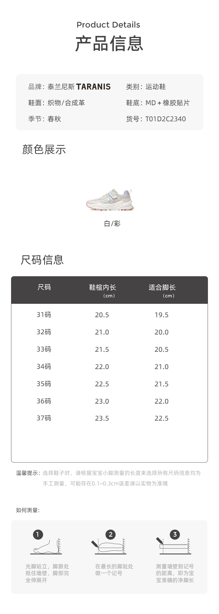 泰兰尼斯秋季中大童轻弾缓震女童运动鞋T01D2C2340