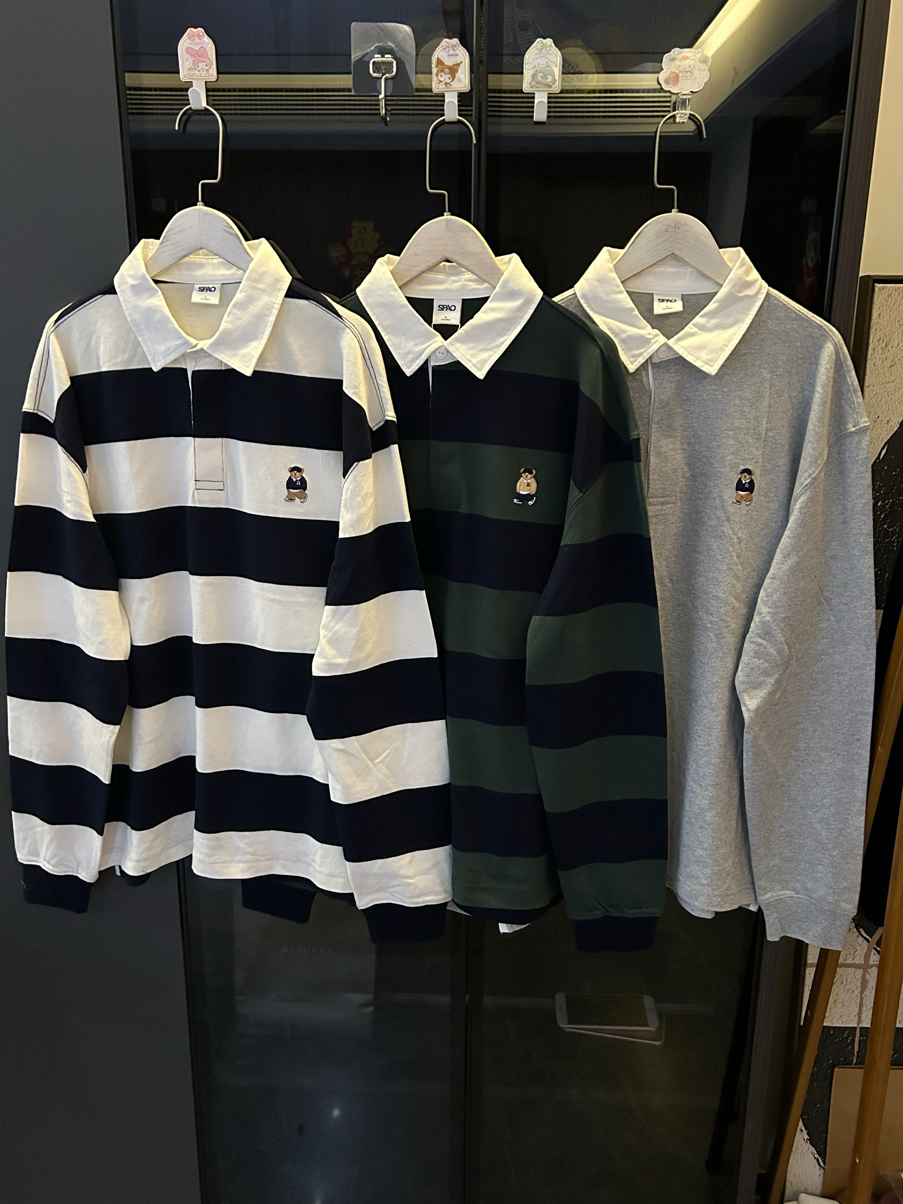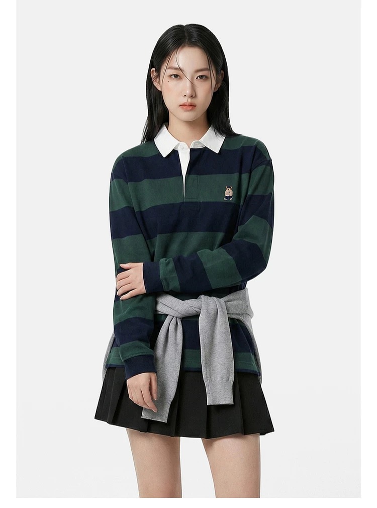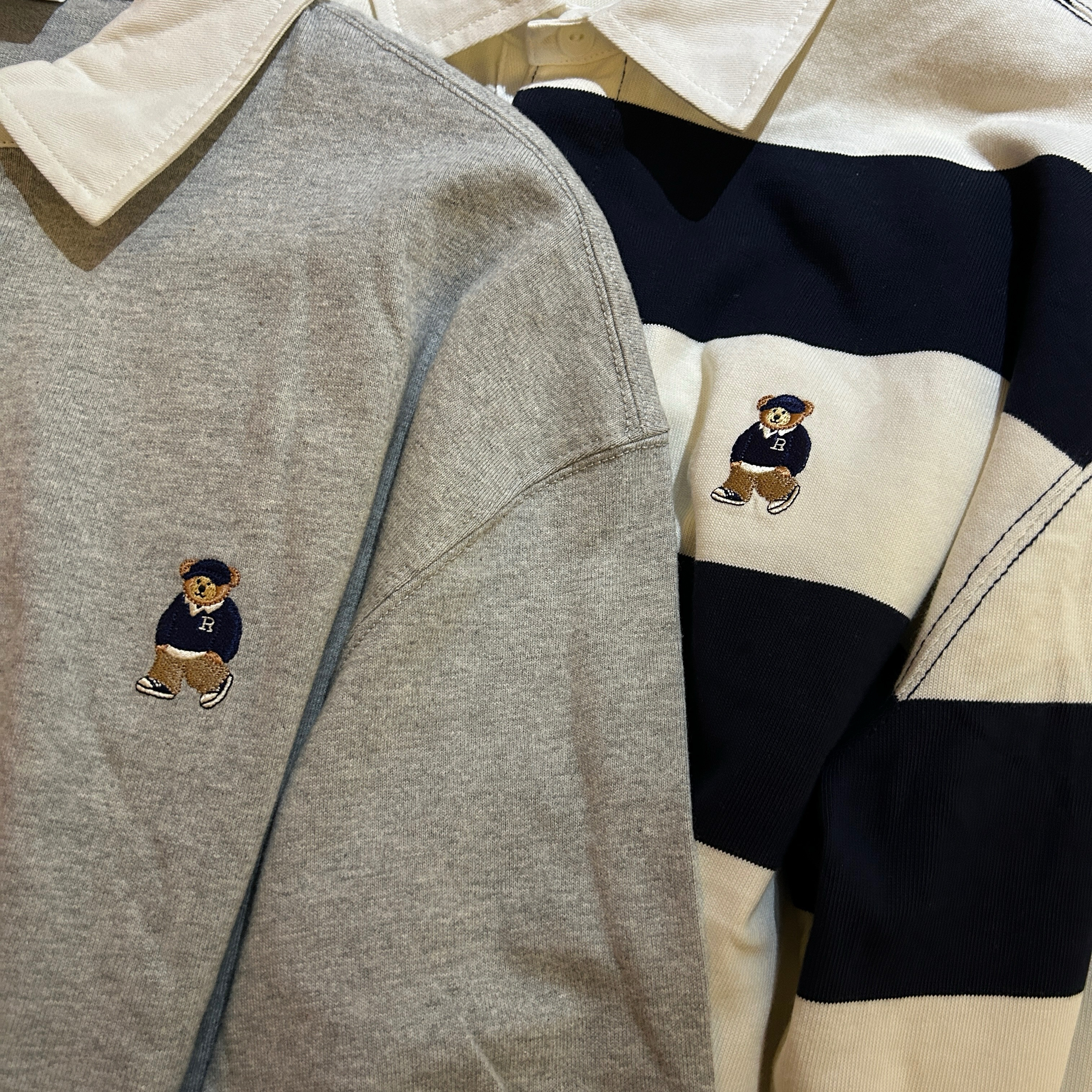 去韩国的订单,sp* x woodie 小熊 联名合作款原d,26早春新款,复古 美式 学院风 小熊 刺绣,男女同款,翻领 条纹 纯棉 上衣~
