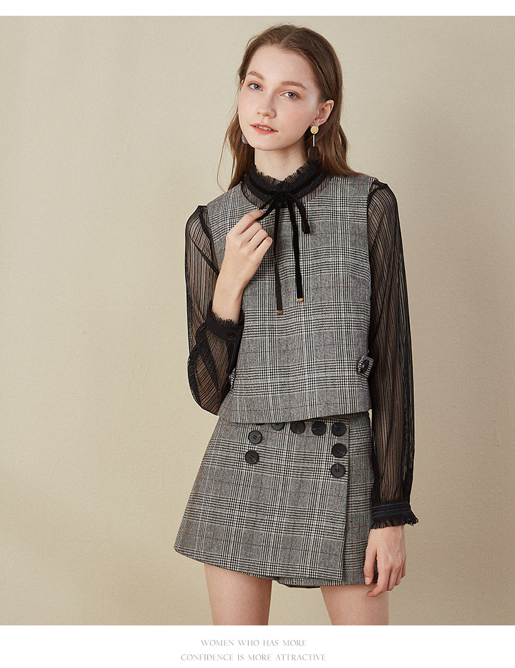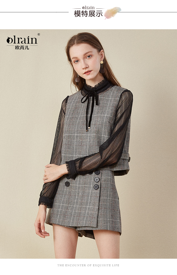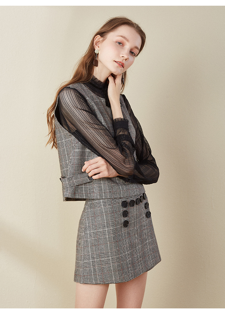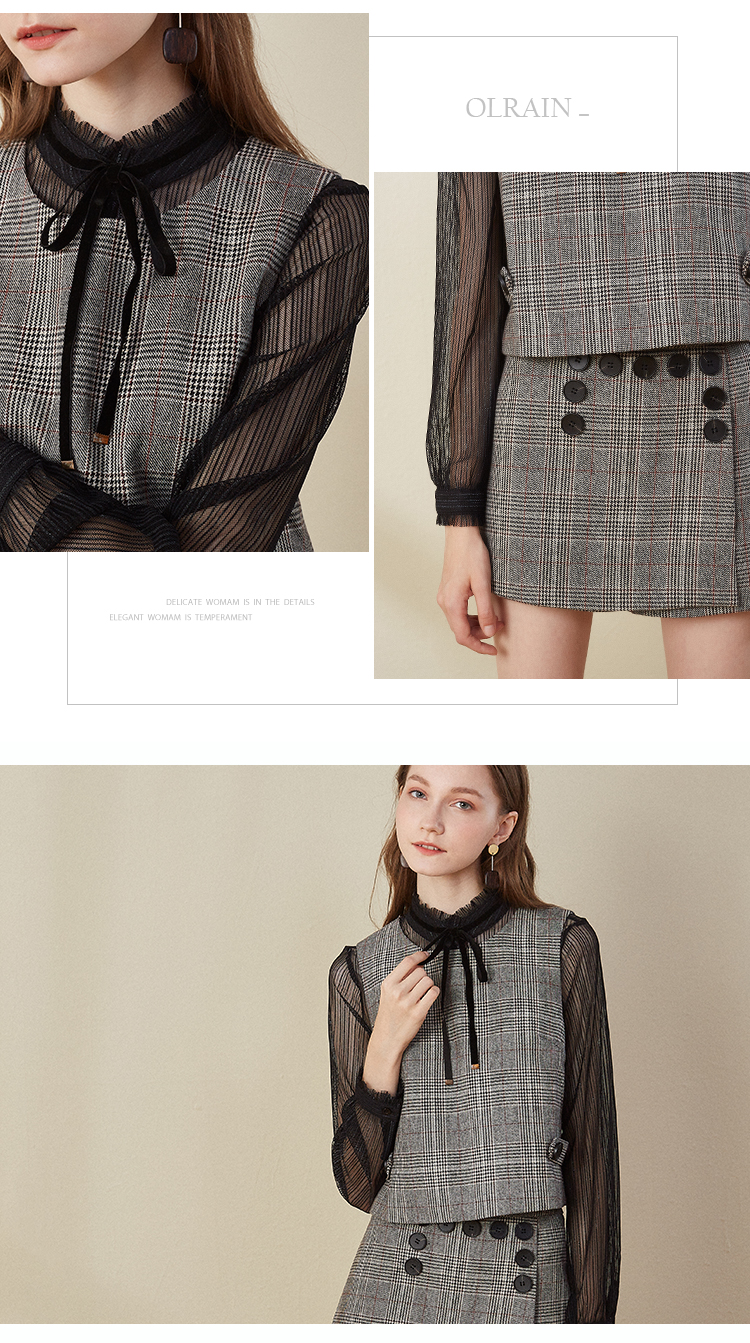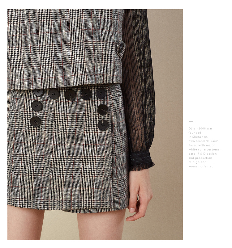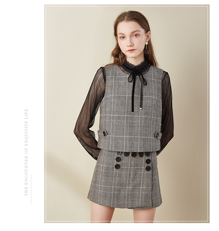 欧芮儿2018秋装新款女无袖马甲外套+格子半身裙女试试套装裙