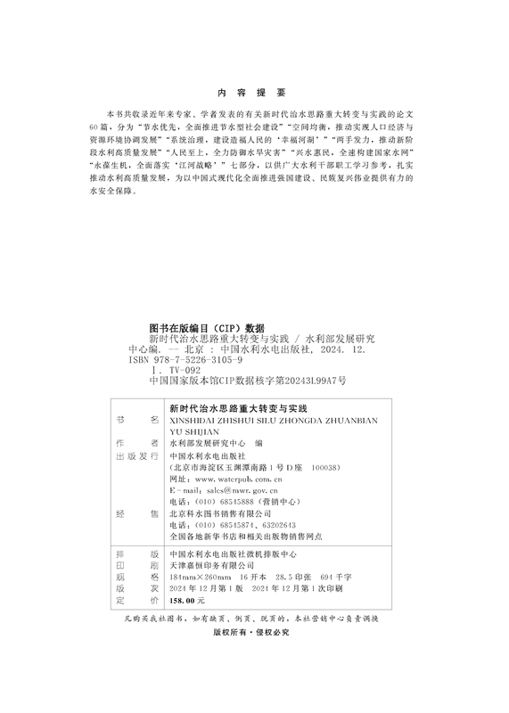 习近平总书记提出"节水优先、空间均衡、系统治理、两手发力"治水思路,形成了科学严谨、逻辑严密、系统完备的治水理论体系,为新时代水利事业发展提供了强大思想武器和科学行动指南。十年来,水利部门深入贯彻落实习近平总书记治水思路,锚定全面提升国家水安全保障能力总体目标,扎实推进新阶段水利高质量发展,治水事业取得了举世瞩目的成就。水利部发展研究中心组织编纂此书,旨在宣传展示十年来各级水利部门深入贯彻落实讲话精神的具体实践、典型经验和突出成效。