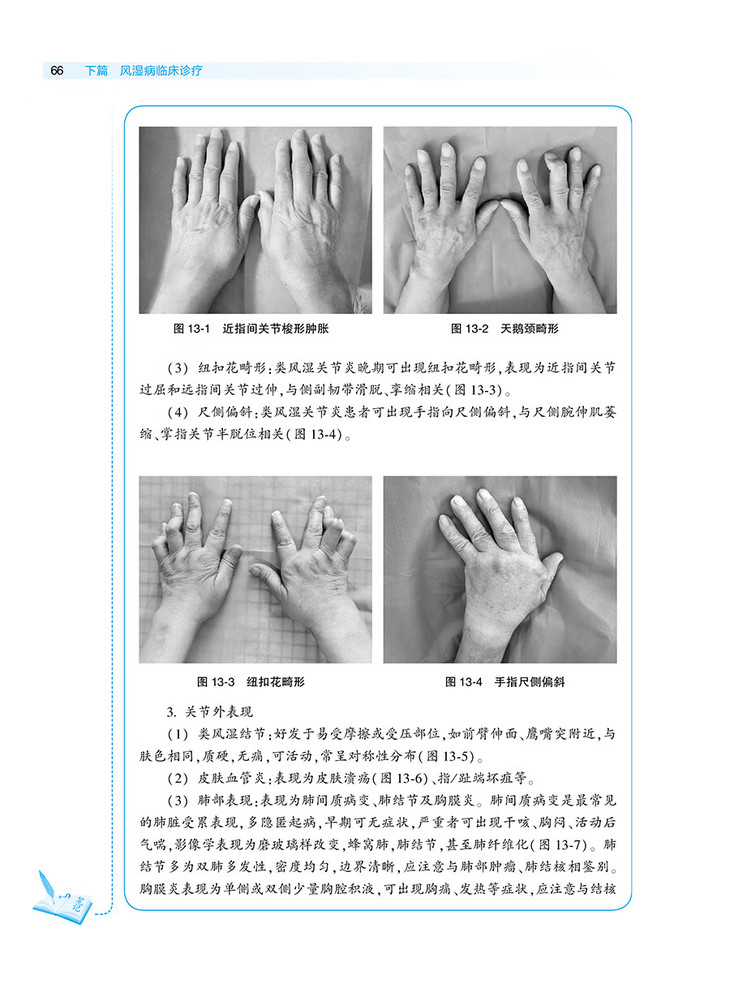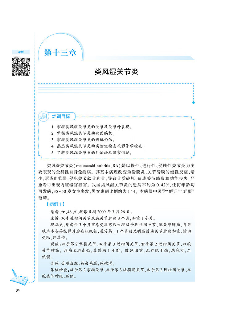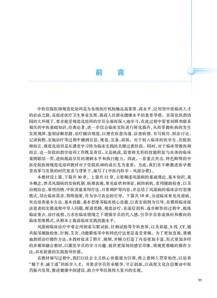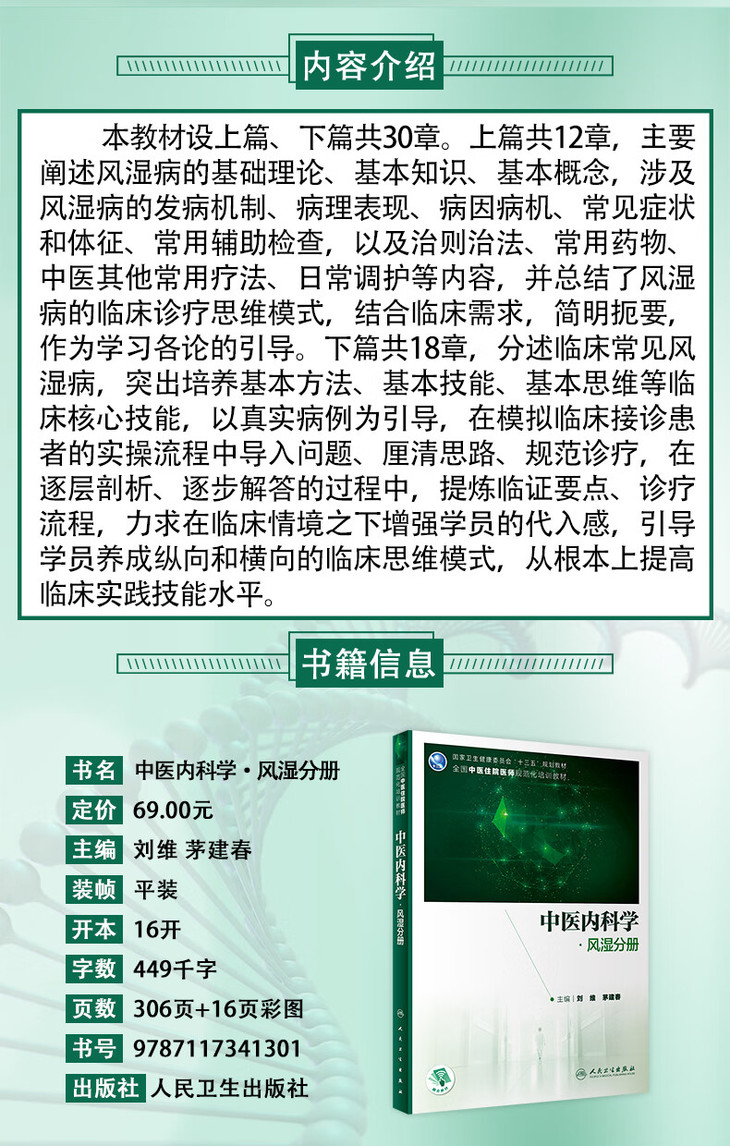 本教材设上篇、下篇共30章。上篇共12章,主要阐述风湿病的基础理论、基本知识、基本概念,涉及风湿病的发病机制、病理表现、病因病机、常见症状和体征、常用辅助检查,以及治则治法、常用药物、中医其他常用疗法、日常调护等内容,并总结了风湿病的临床诊疗思维模式,结合临床需求,简明扼要,作为学习各论的引导。下篇共18章,分述临床常见风湿病,突出培养基本方法、基本技能、基本思维等临床核心技能,以真实病例为引导,在模拟临床接诊患者的实操流程中导入问题、厘清思路、规范诊疗,在逐层剖析、逐步解答的过程中,提炼临证要点、诊疗流程,力求在临床情境之下增强学员的代入感,引导学员养成纵向和横向的临床思维模式,从根本上提高临床实践技能水平。