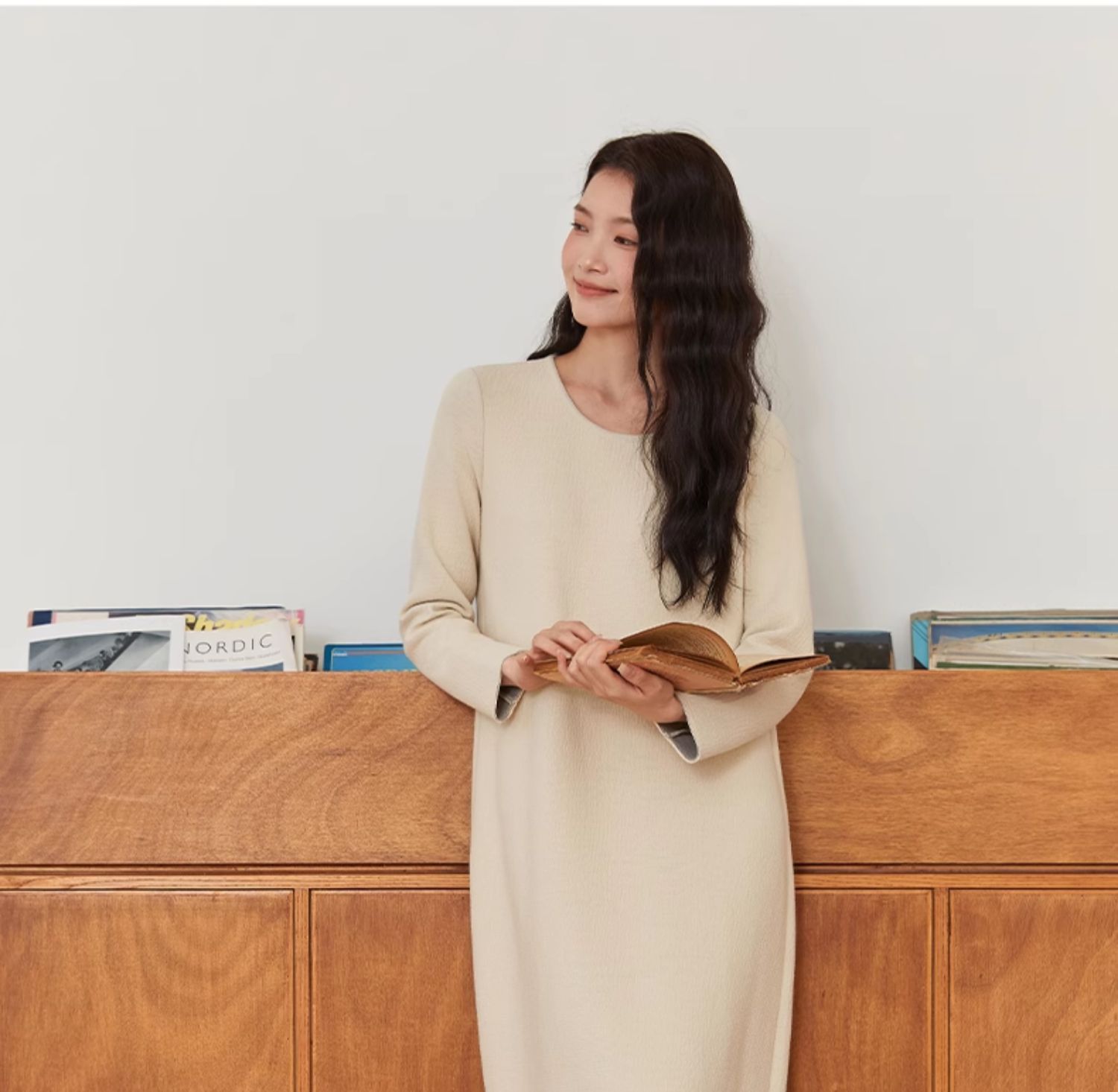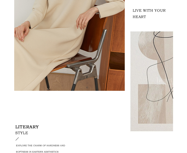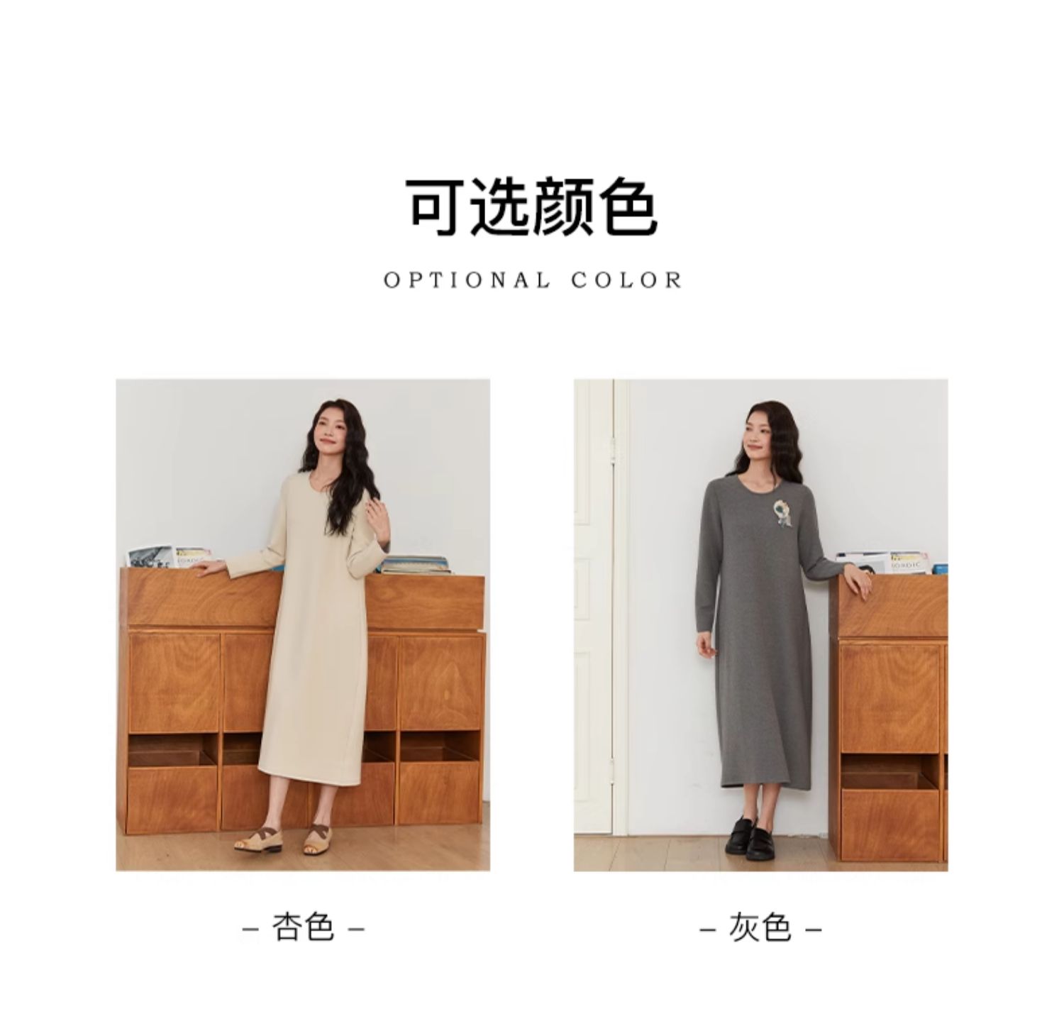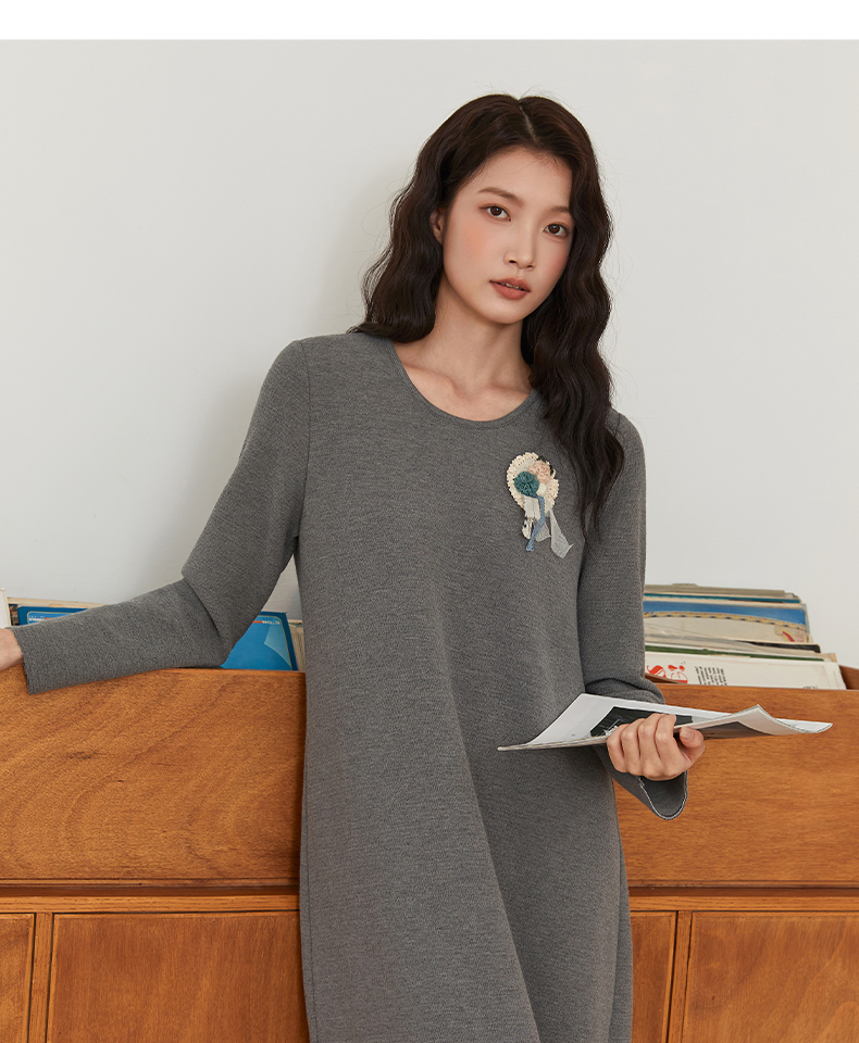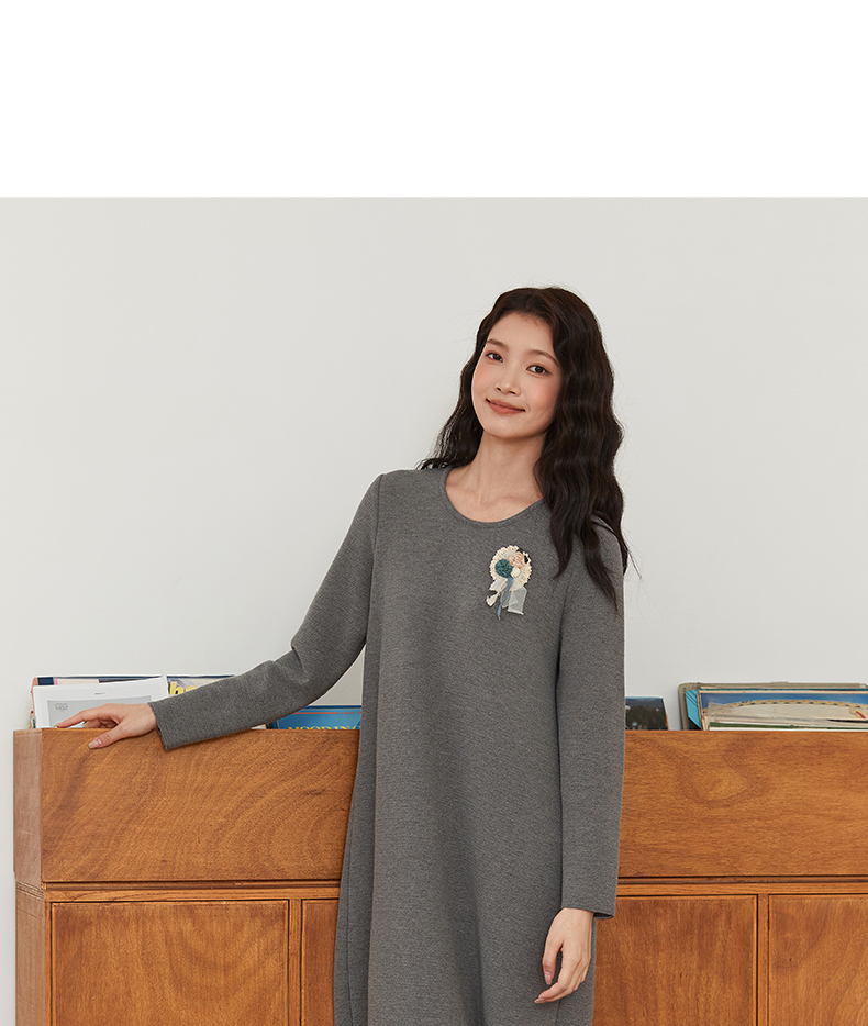 Famecoco文艺范圆领纯色简约时尚O型百搭连衣裙春秋款FAB6FA030