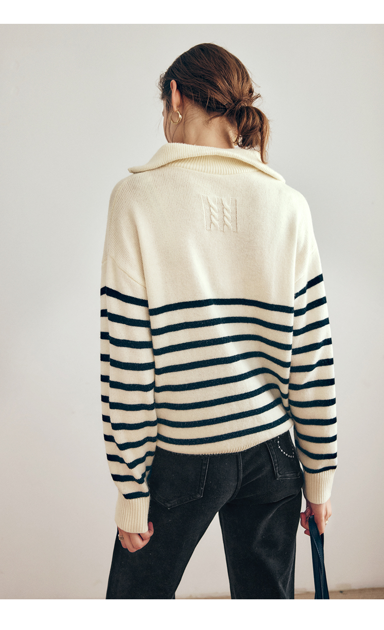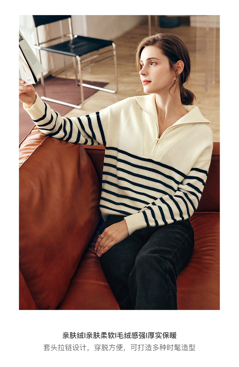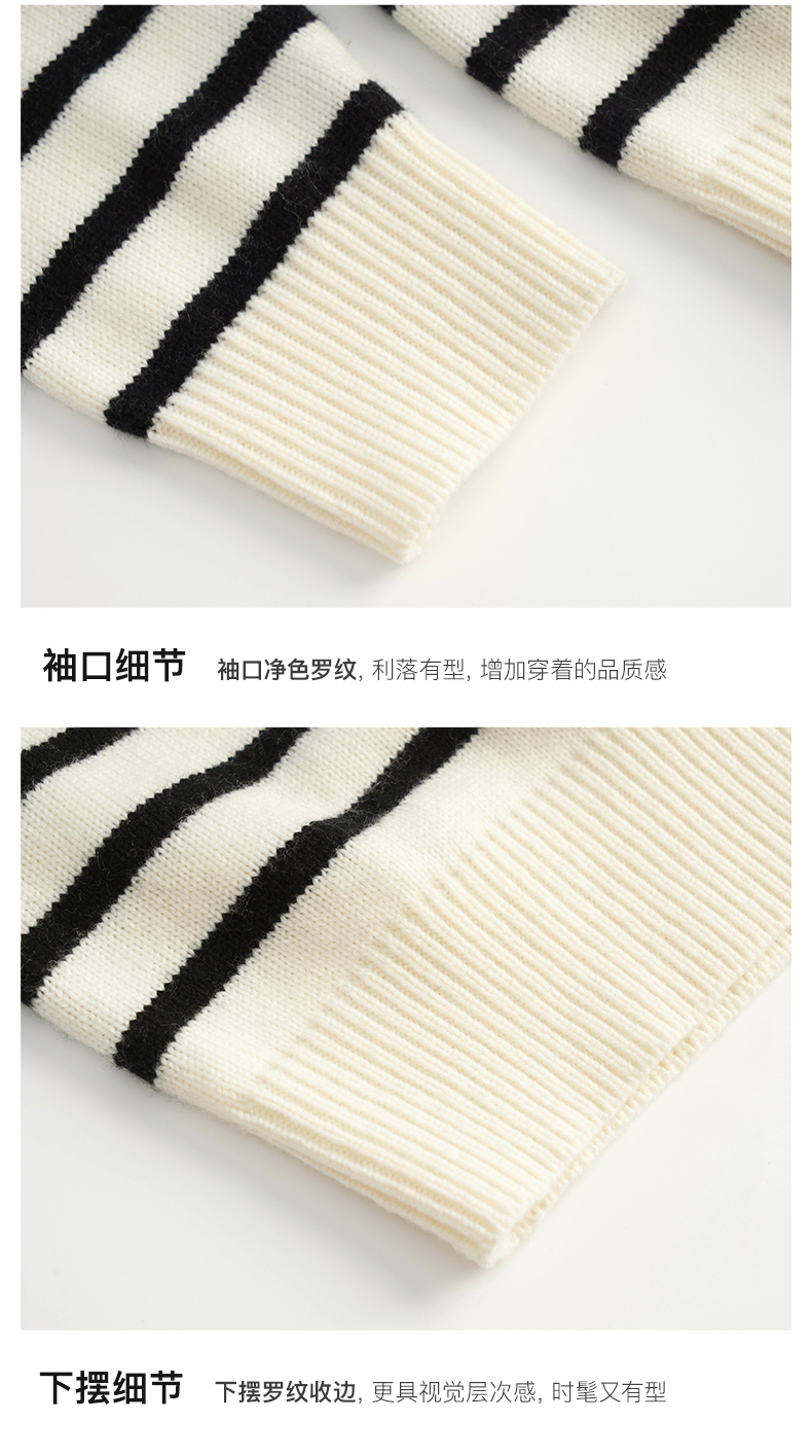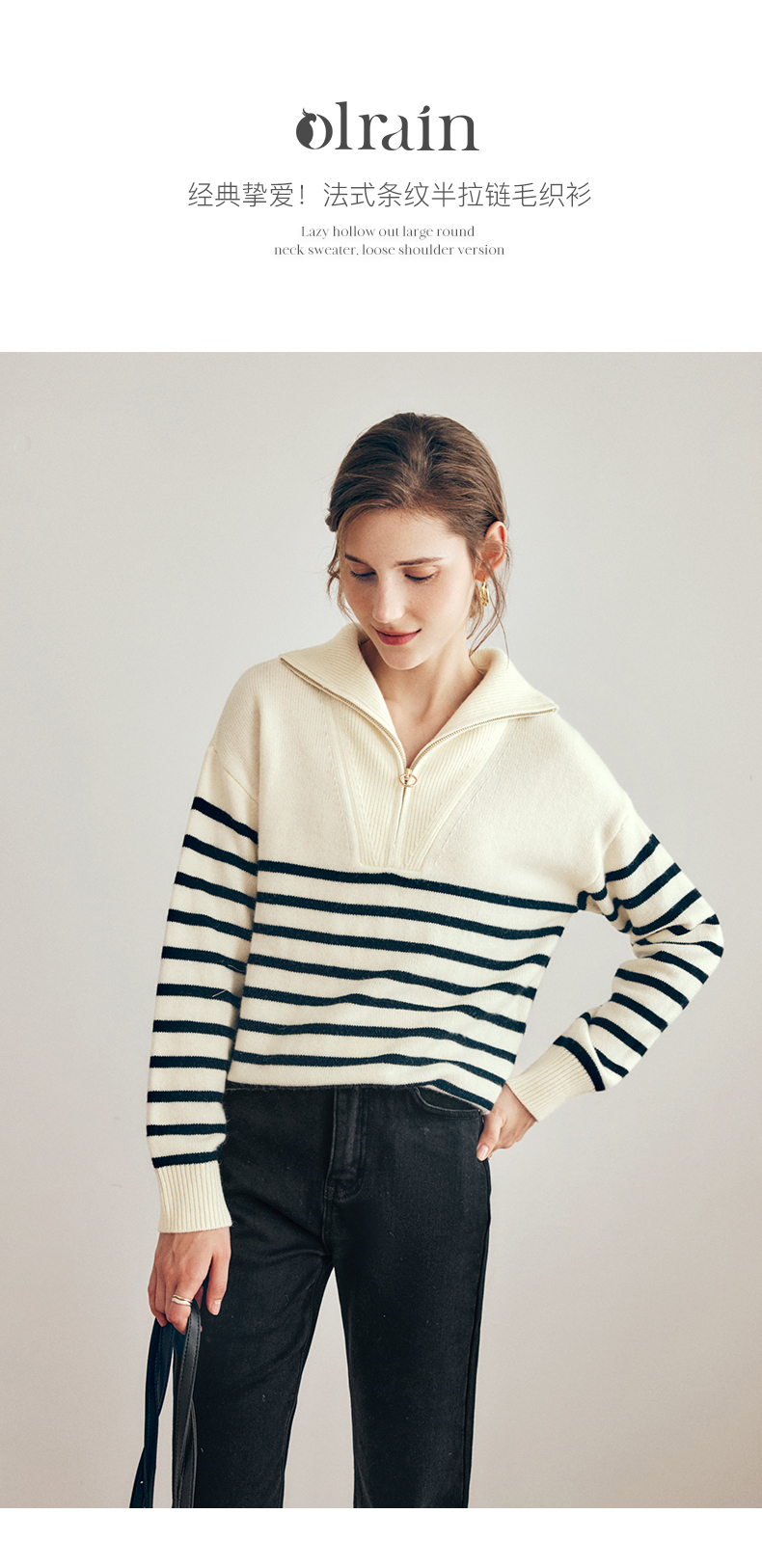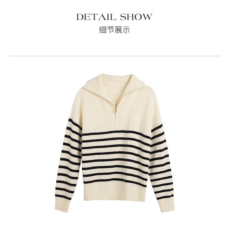 OLrain欧芮儿法式黑白条纹毛衣女秋季2023年新款两穿半拉链针织衫