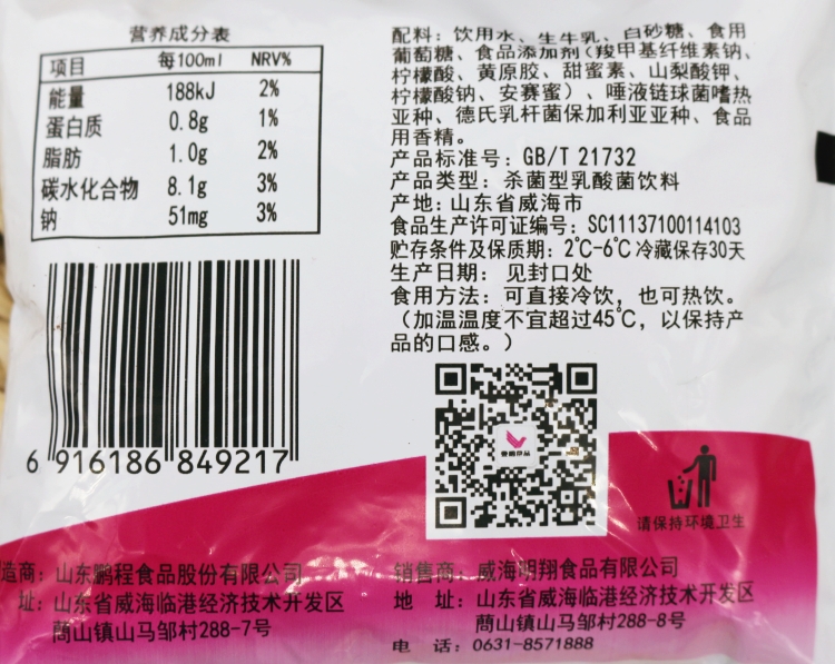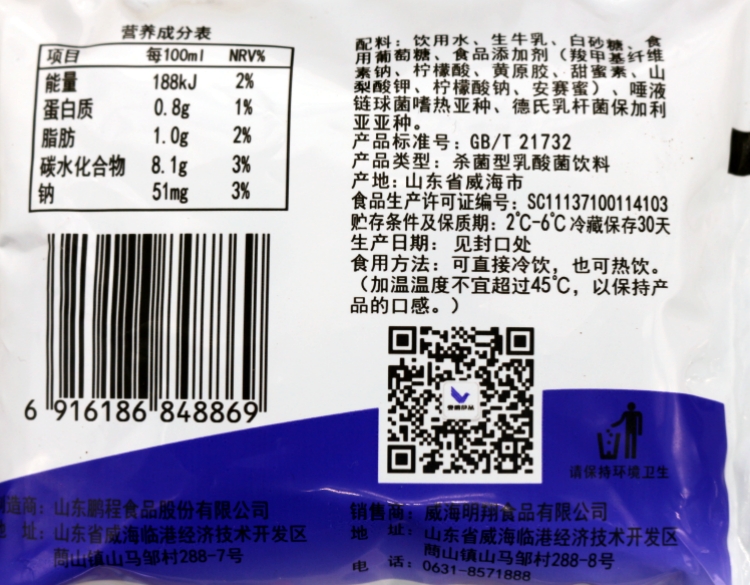 【100ml*4袋】鹏程乳酸菌饮料 草莓味/蓝莓味 冷藏保存 果味饮料饮品