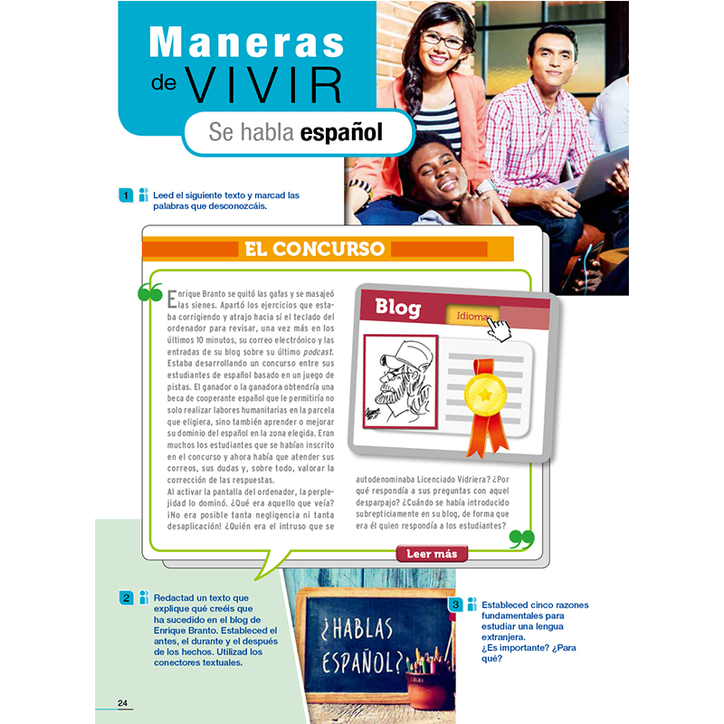 《新版走遍西班牙》突破了传统教学法,将听说读写融为一体,让学生们在学习日常交际的同时循序渐进地掌握语言的基本技能。此外,“生活方式”板块也是本教材的特色之一,学习者可以在学习语言的同时从中了解西班牙及拉丁美洲西班牙语国家的文化。