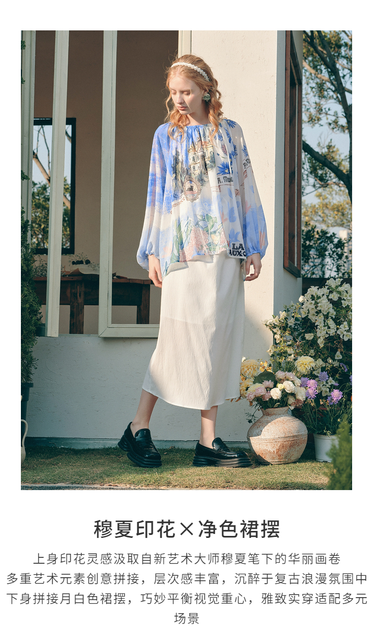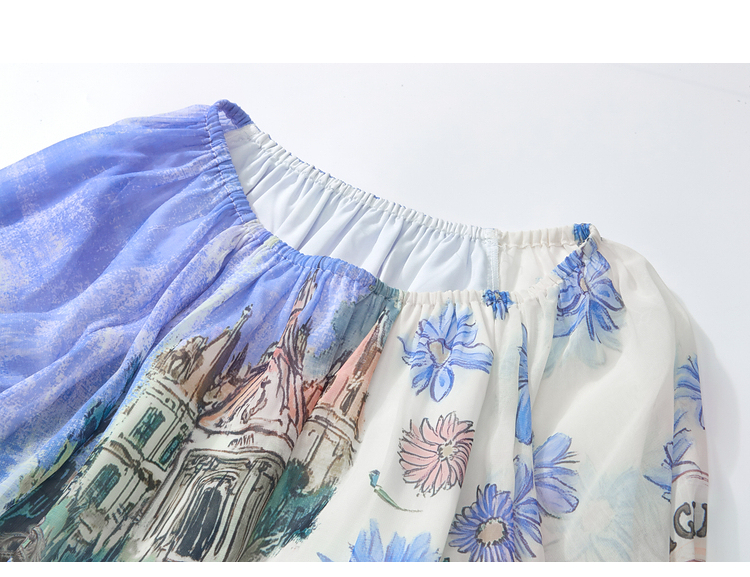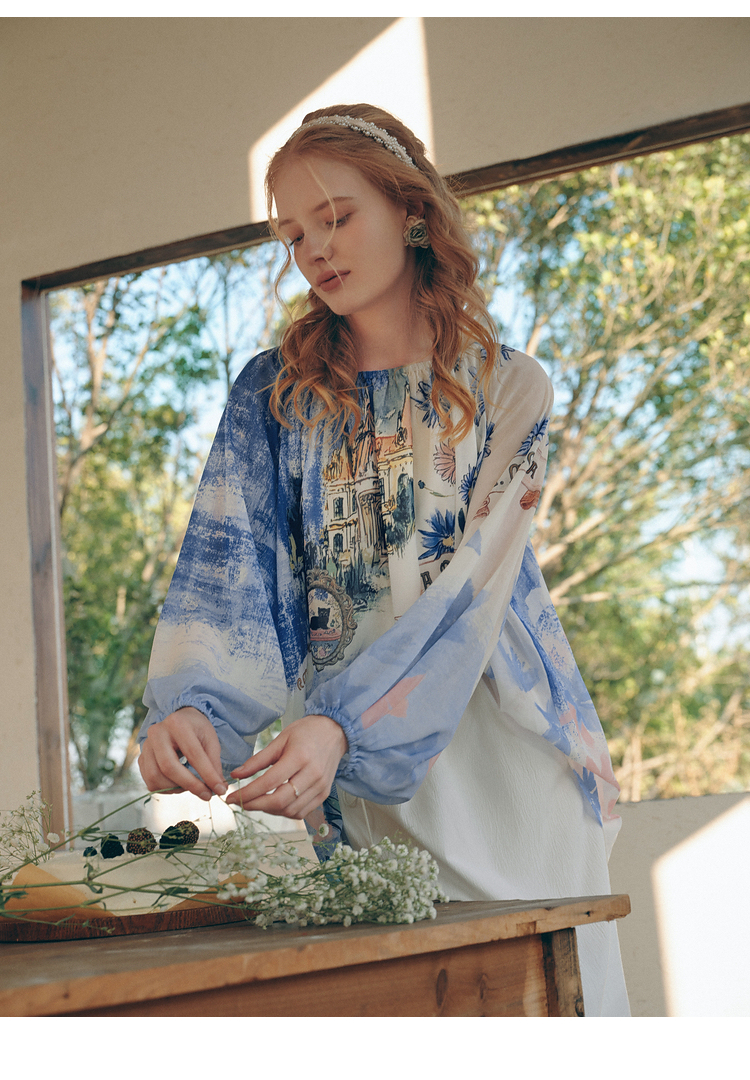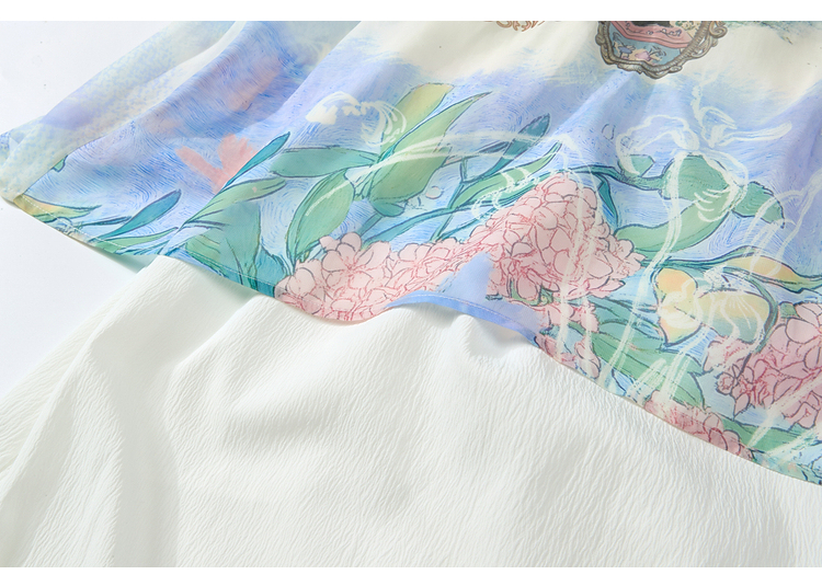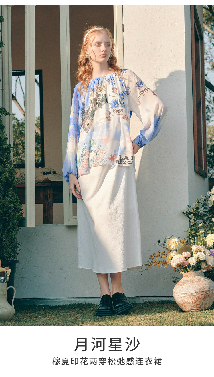 两三事 月河星沙 2026春季新款甜美印花拼接灯笼袖假两件连衣裙