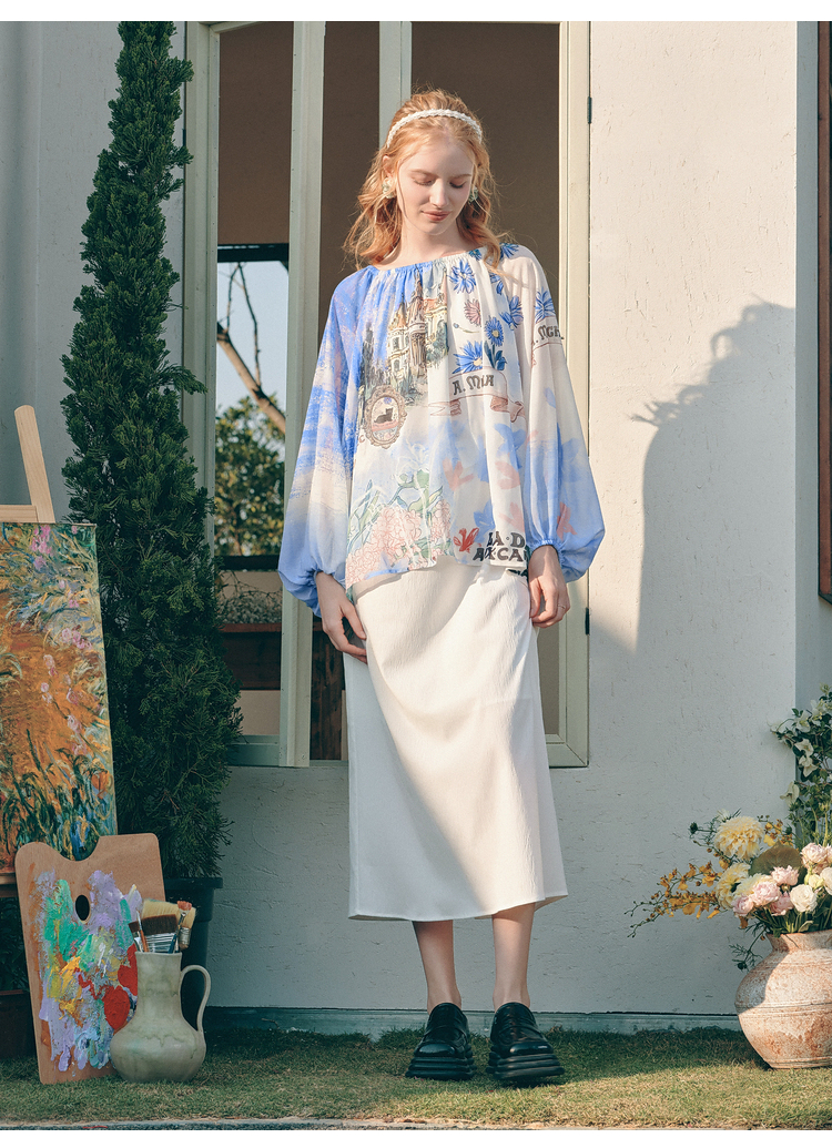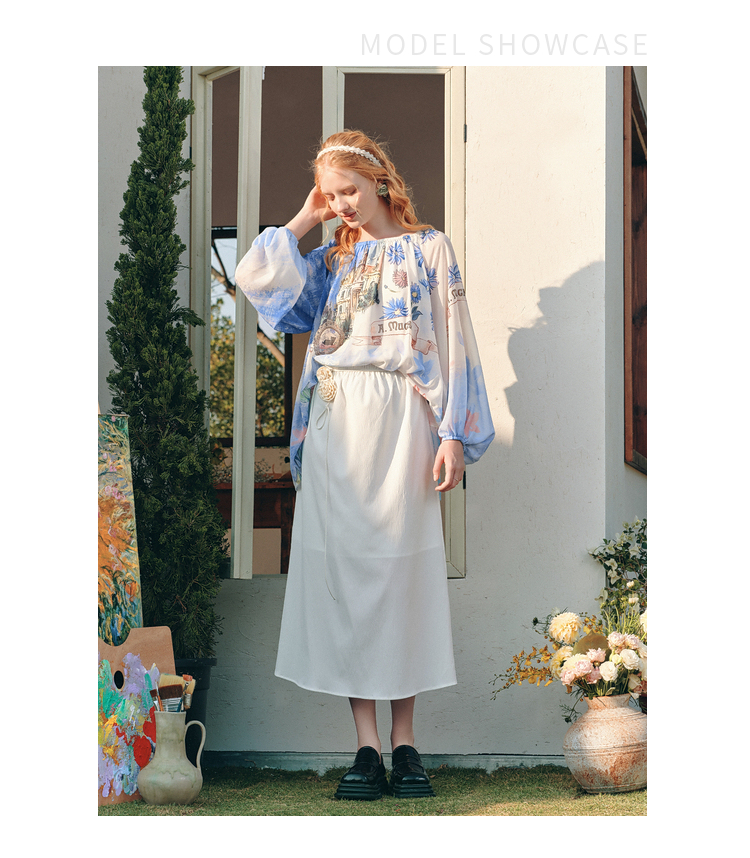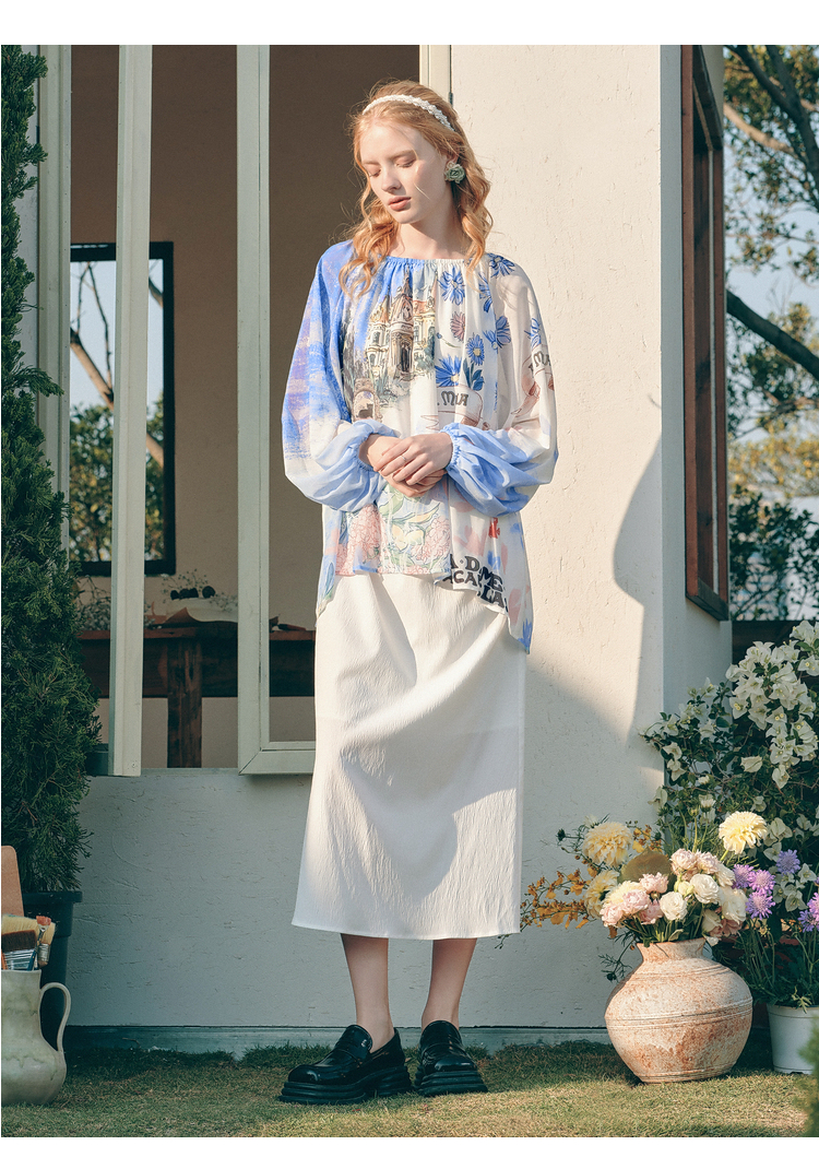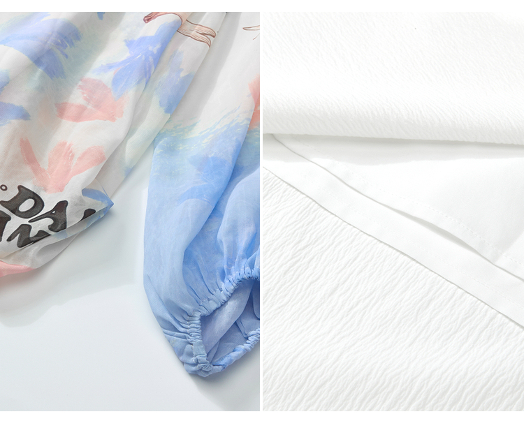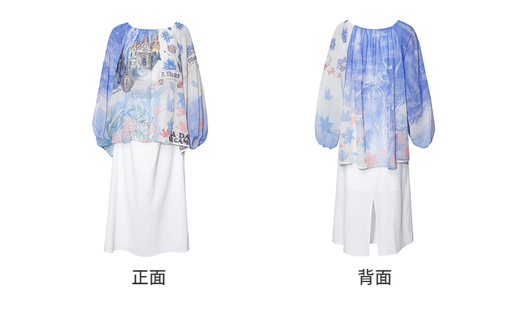 两三事 月河星沙 2026春季新款甜美印花拼接灯笼袖假两件连衣裙