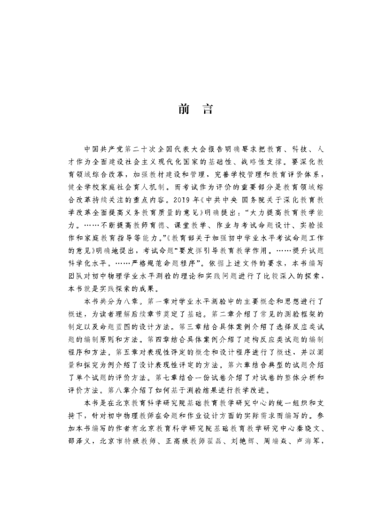 本书基于北京市物理学科教学评近十年的实践探索,按照提升命题质量,发挥引导教育教学质量的要求,结合实例从物理测评的主要类型、试题命制、试题改进与评价、基于测验结果进行教学改进四个方面进行了系统的梳理和总结,旨在帮助广大一线物理教师提升考试命题设计能力,助力物理教师开展核心素养导向的教学评一体化探索。