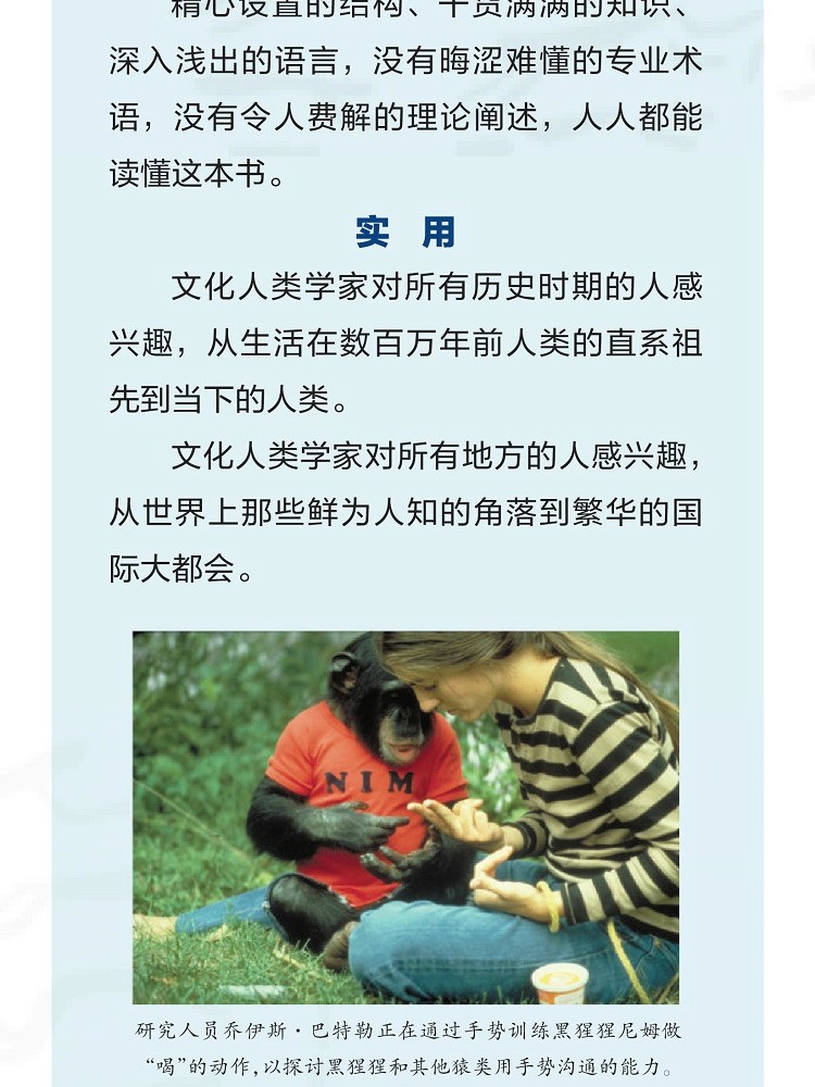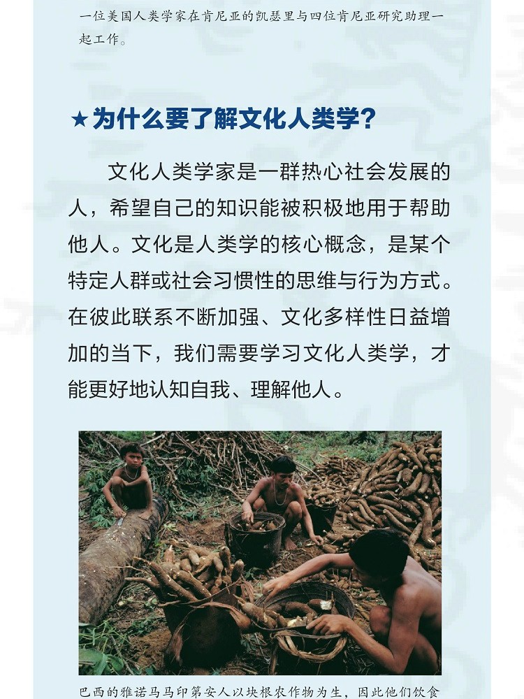 文化人类学家是一群充满好奇心的人,或者穿梭于全世界那些鲜为人知的角落研究迥然不同的人群,或者深挖地层以发掘化石和人类使用过的各种工具与器皿。他们关注文化在过去和现在如何、为何发生变化或保持不变,涉及语言、性别、婚姻、家庭、宗教、艺术等等领域。