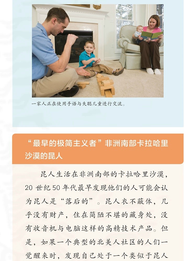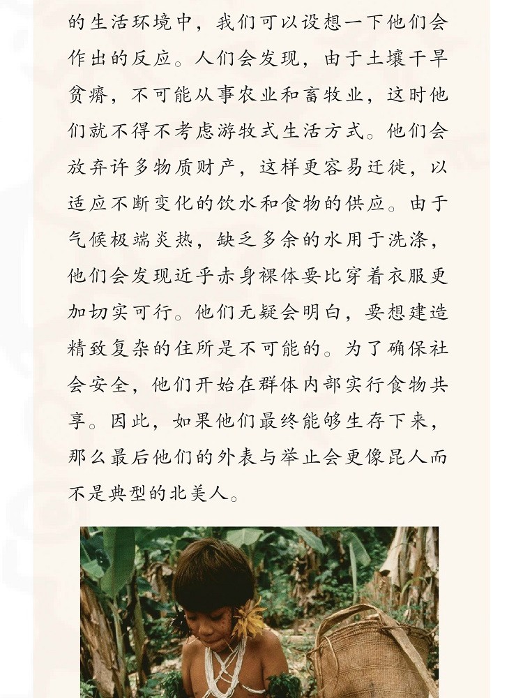 昆人生活在非洲南部的卡拉哈里沙漠,20 世纪50 年代最早发现他们的人可能会认为昆人是“落后的”。昆人衣不蔽体,几乎没有财产,住在简陋不堪的藏身处,没有收音机与电脑这样的高精技术产品。但是,如果一个典型的北美人社区的人们一觉醒来时,发现自己处于一个类似于昆人的生活环境中,我们可以设想一下他们会作出的反应。人们会发现,由于土壤干旱贫瘠,不可能从事农业和畜牧业,这时他们就不得不考虑游牧式生活方式。他们会放弃许多物质财产,这样更容易迁徙,以适应不断变化的饮水和食物的供应。由于气候极端炎热,缺乏多余的水用于洗涤,他们会发现近乎赤身裸体要比穿着衣服更加切实可行。他们无疑会明白,要想建造精致复杂的住所是不可能的。为了确保社会安全,他们开始在群体内部实行食物共享。因此,如果他们最终能够生存下来,那么最后他们的外表与举止会更像昆人而不是典型的北美人。