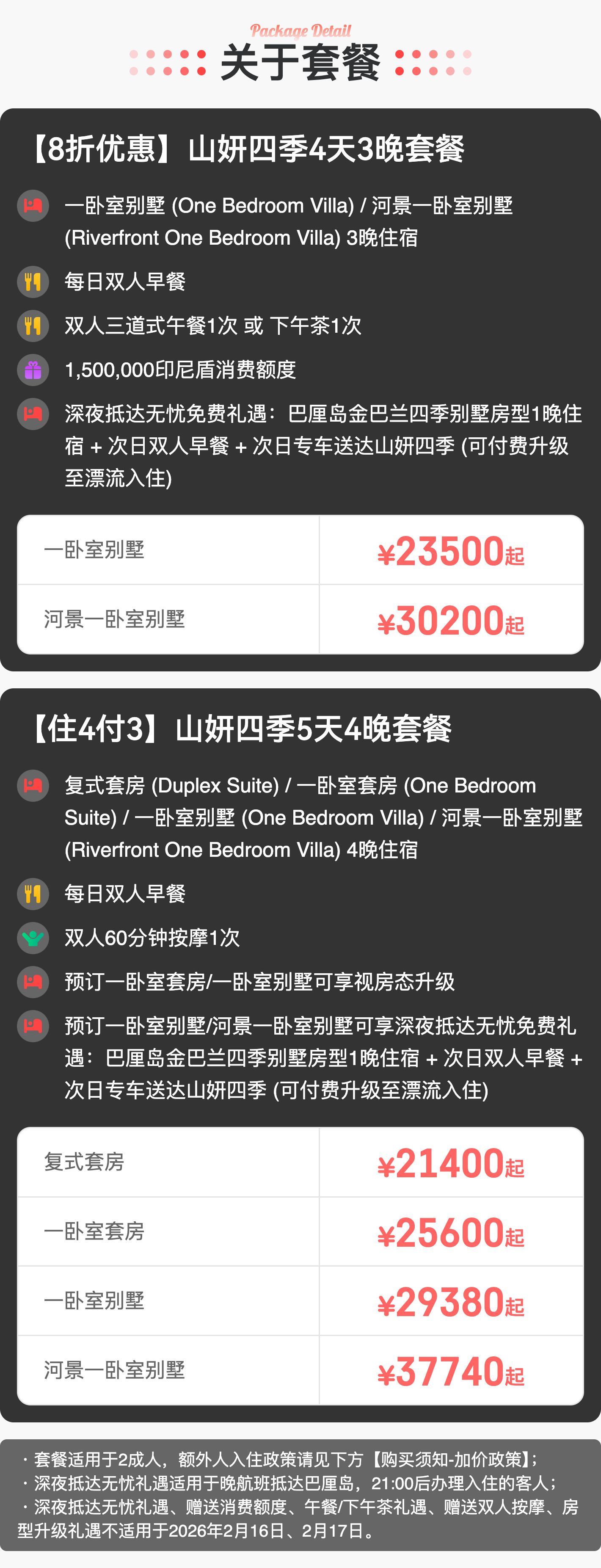 3晚/4晚【巴厘岛乌布山妍四季度假酒店】寒假/春节不加价!享深夜抵达免费礼遇!深度体验山妍四季隐匿式度假,享三道式午餐、消费额/SPA按摩及免费升房等福利~
