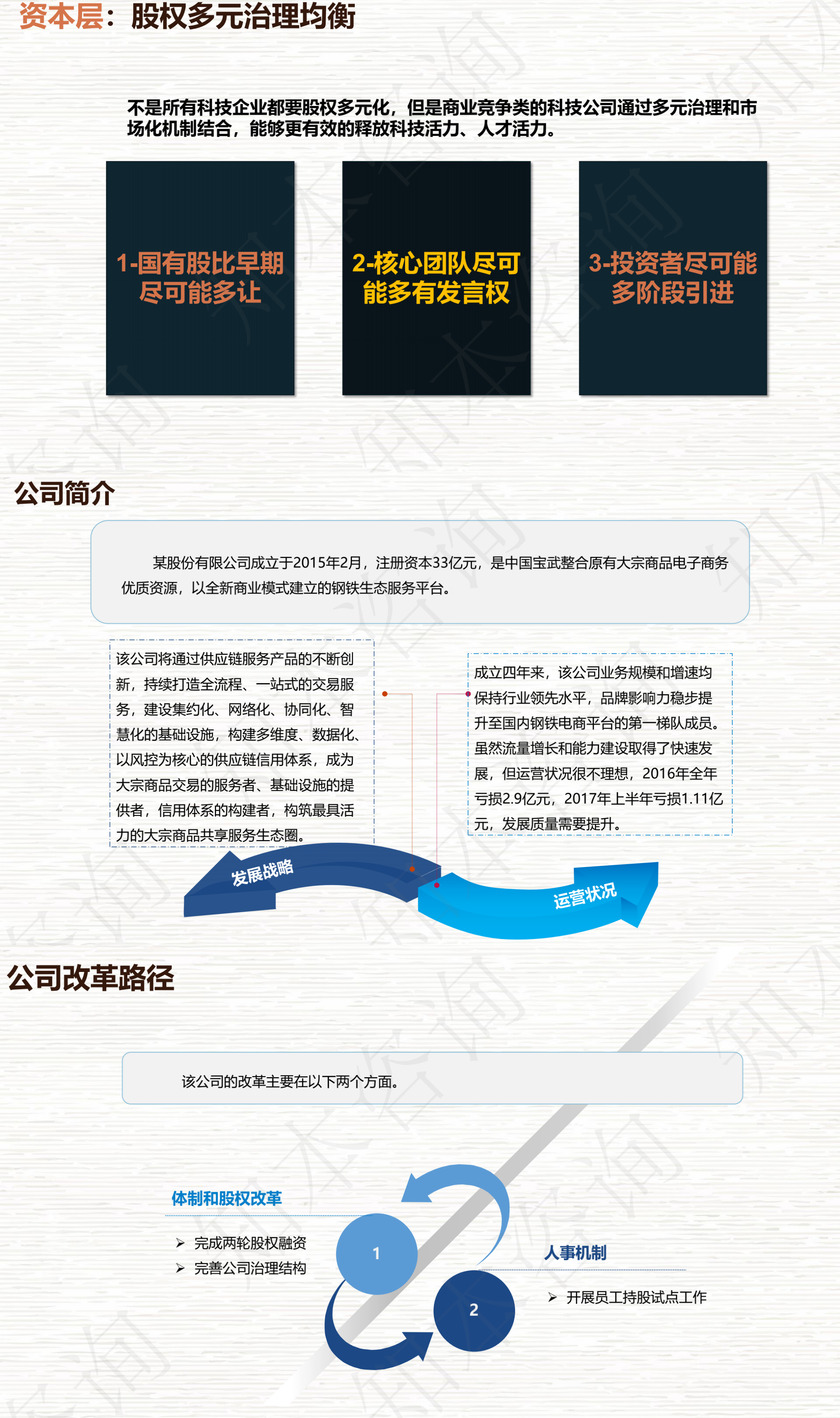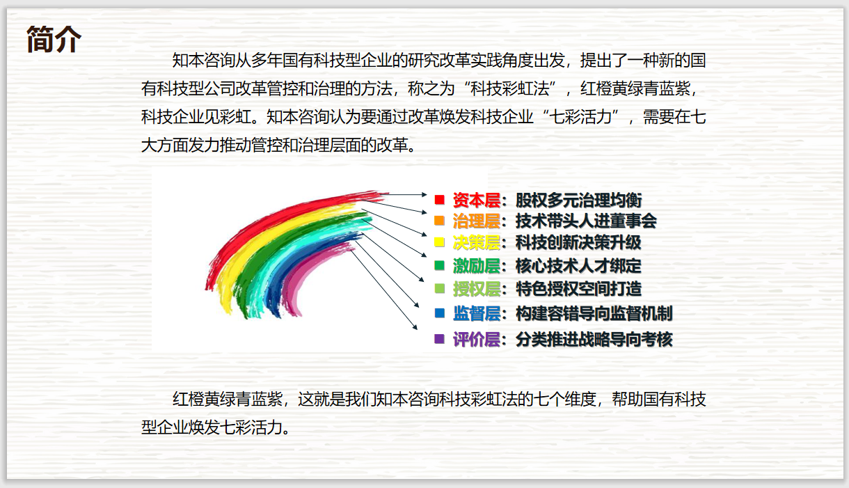 国企改革方法论 主要是在相关政策研究的基础上,结合典型案例,针对国有企业改革过程中存在的方方面的问题,提炼而出的具有实操性、系统性的解决方案。知本咨询国企改革方法论,聚焦于 混改和股权多元化、干部机制、三项制度、国企创新、两类公司、中长期激励、管控与治理优化、对标世界一流、国有企业产业整合和重组 等不同领域,为国有企业提供可快速落地的改革模型、改革路径、改革举措等,帮助国有企业早日实现改革目标。
