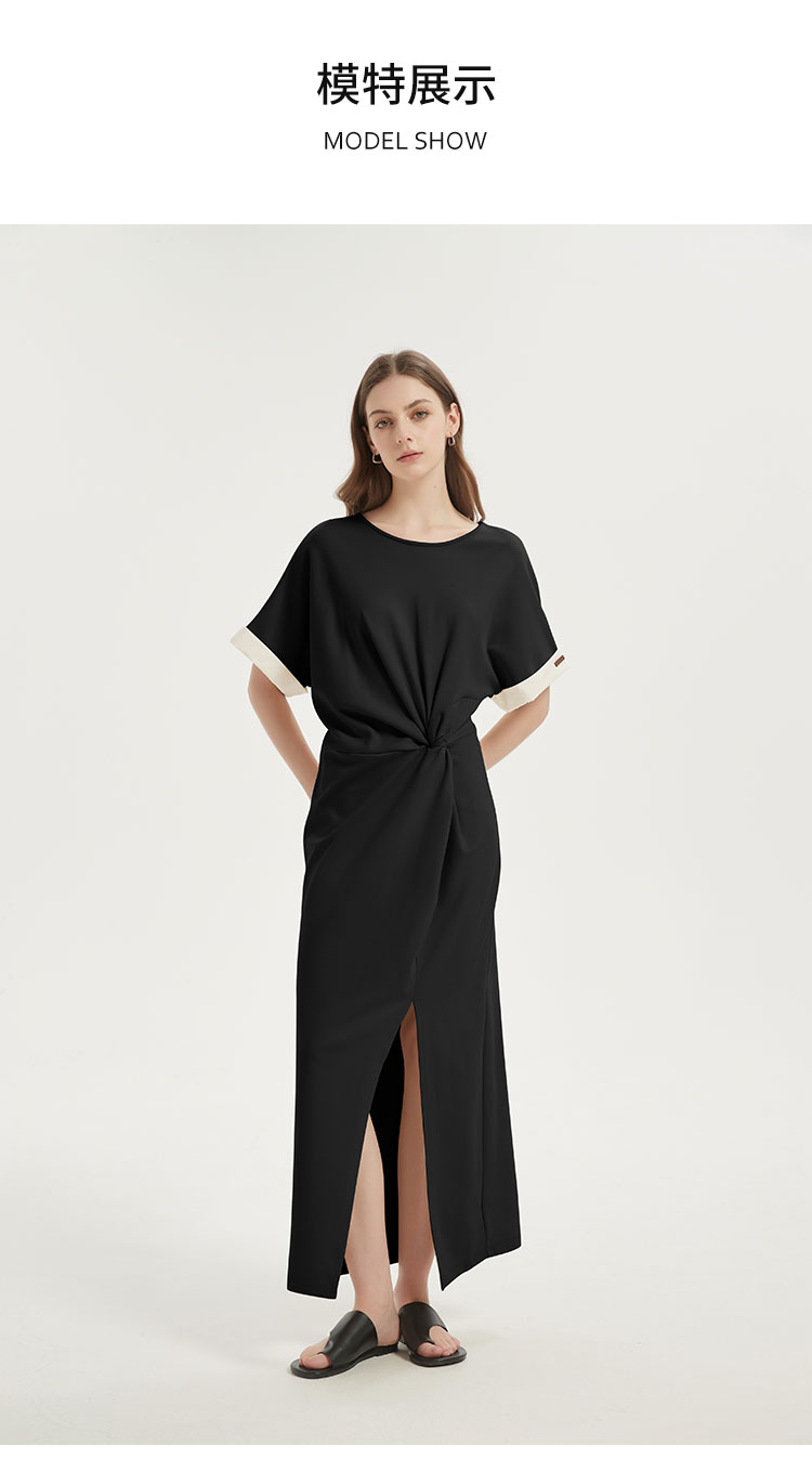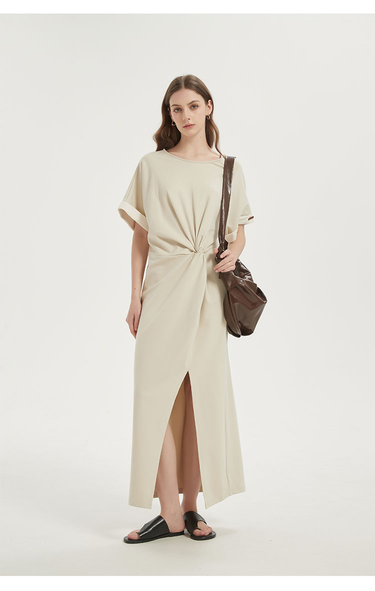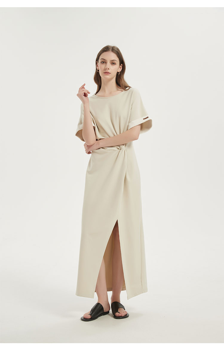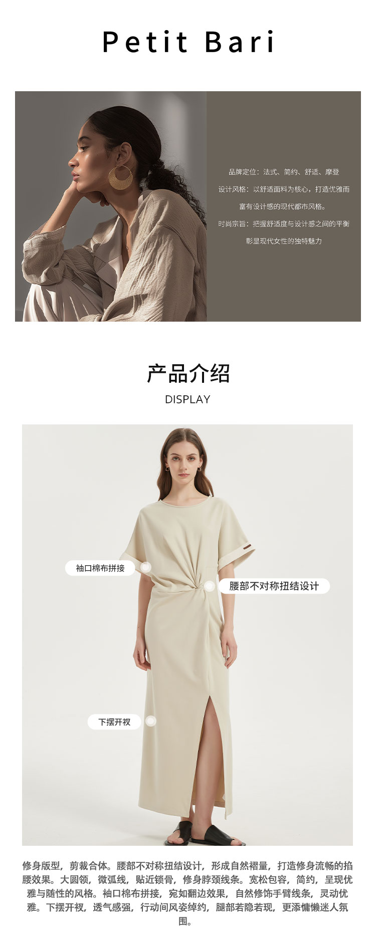 【2件9折】【Petit Bari】(多色)休闲慵懒不对称扭结开衩连衣裙