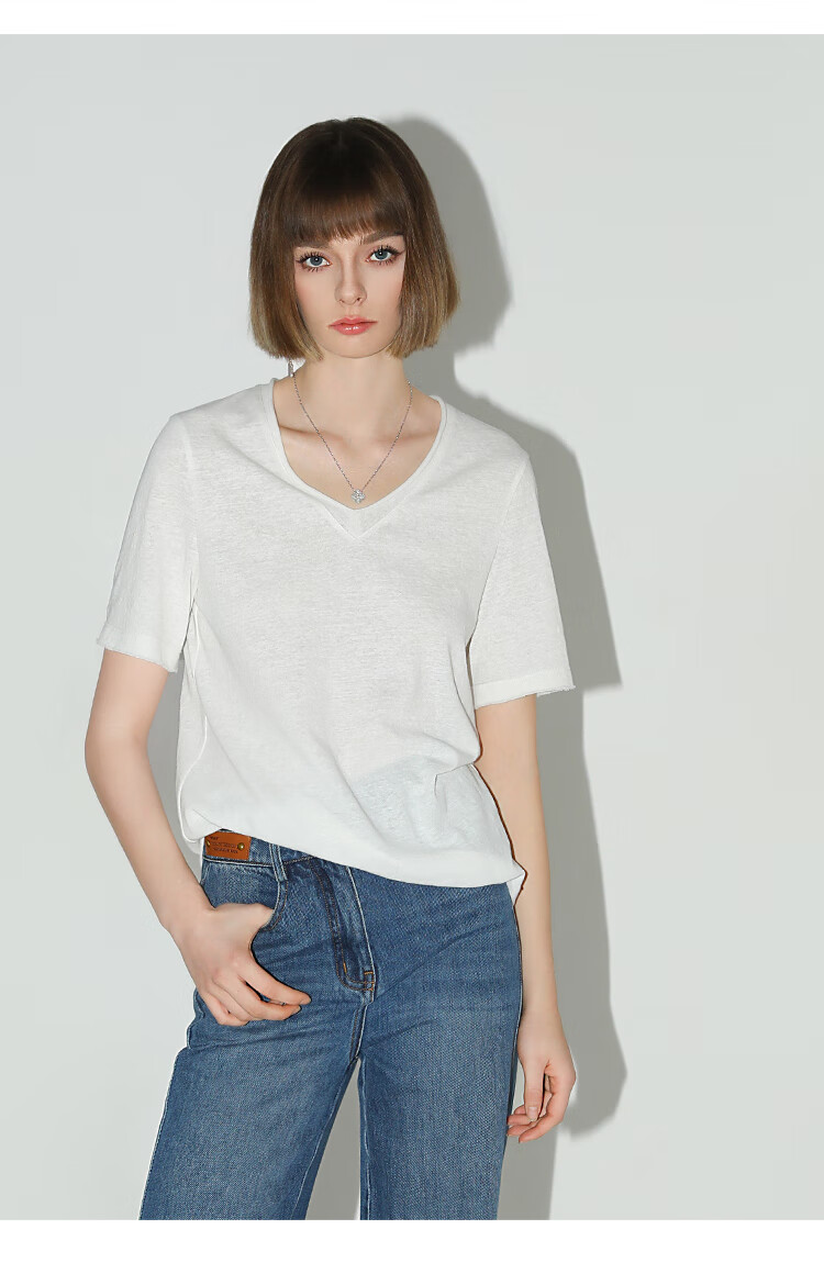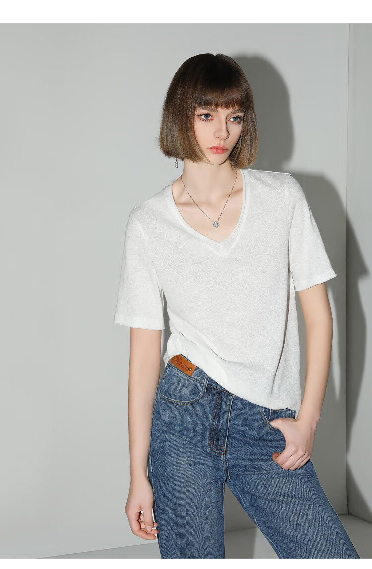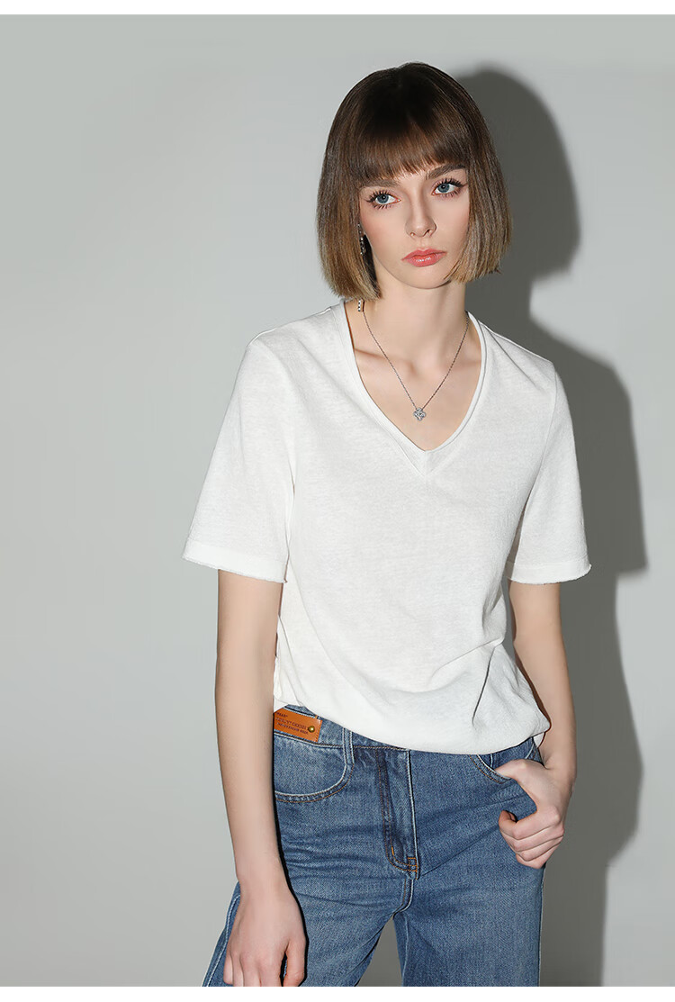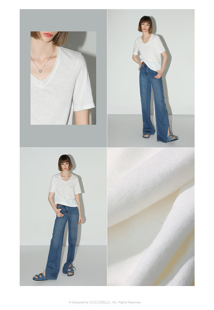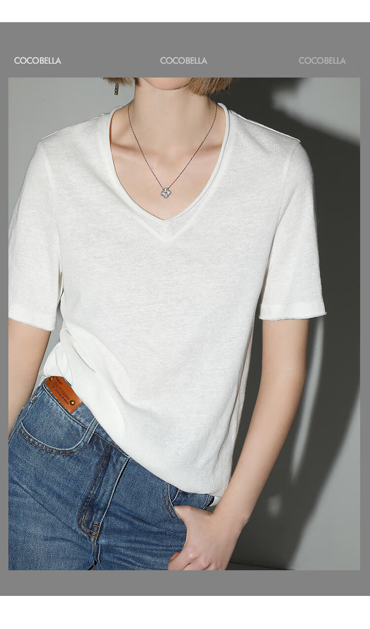 COCOBELLA竹节棉白色短袖T恤基础款V领随性毛边上衣TS7017-2