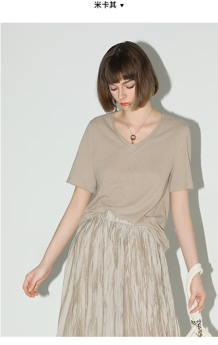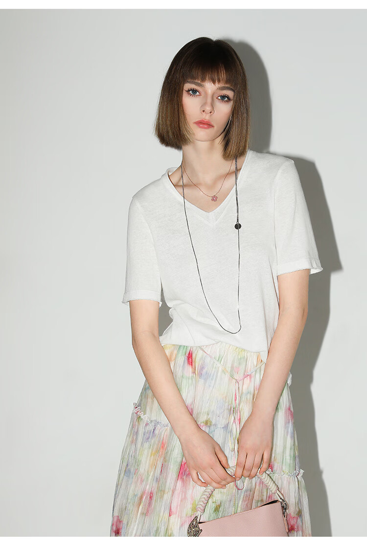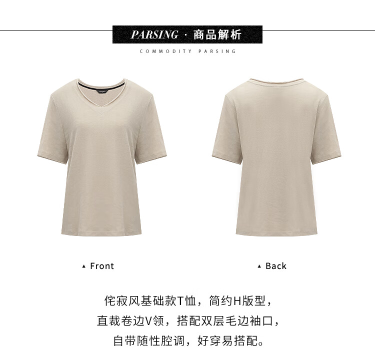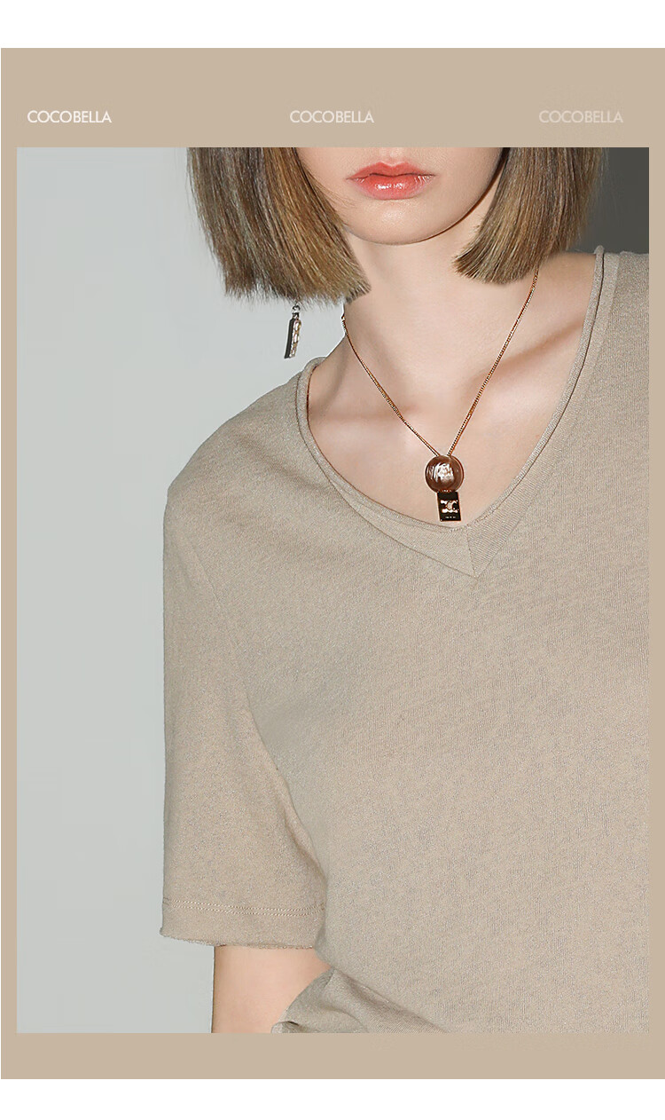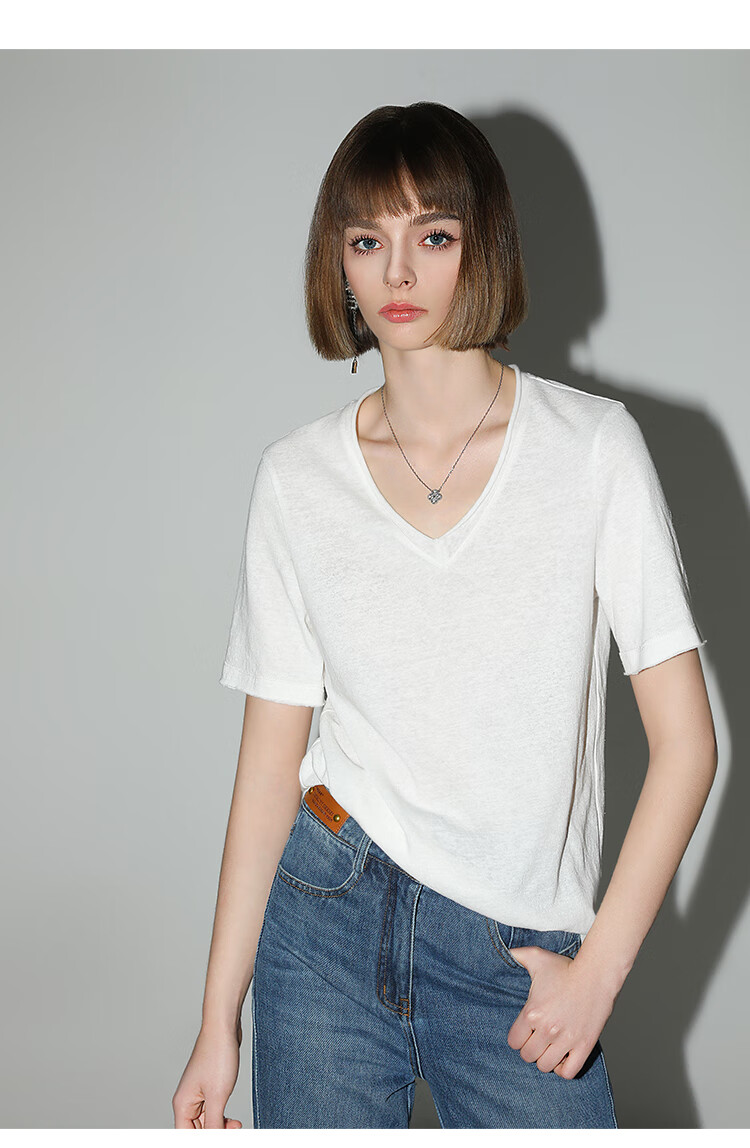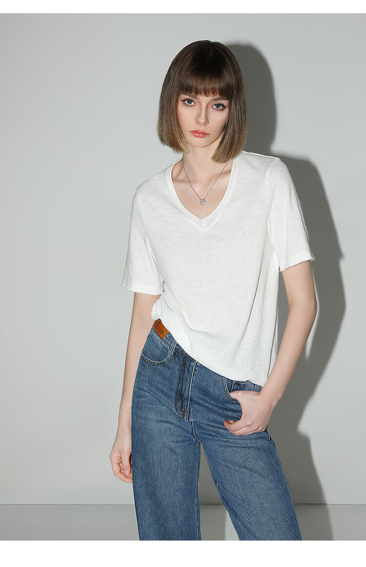 COCOBELLA竹节棉白色短袖T恤基础款V领随性毛边上衣TS7017-2