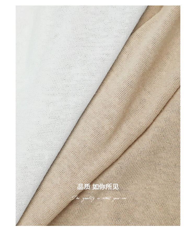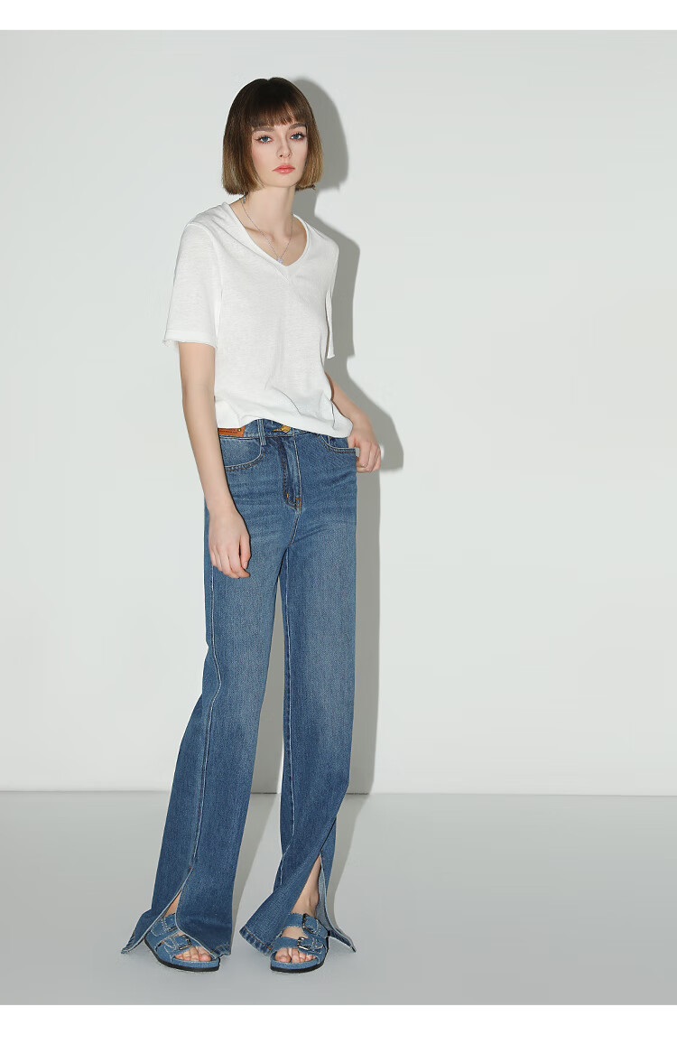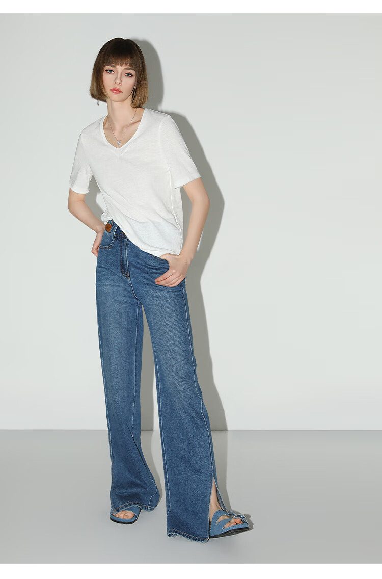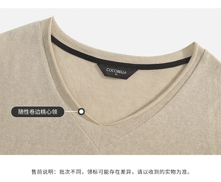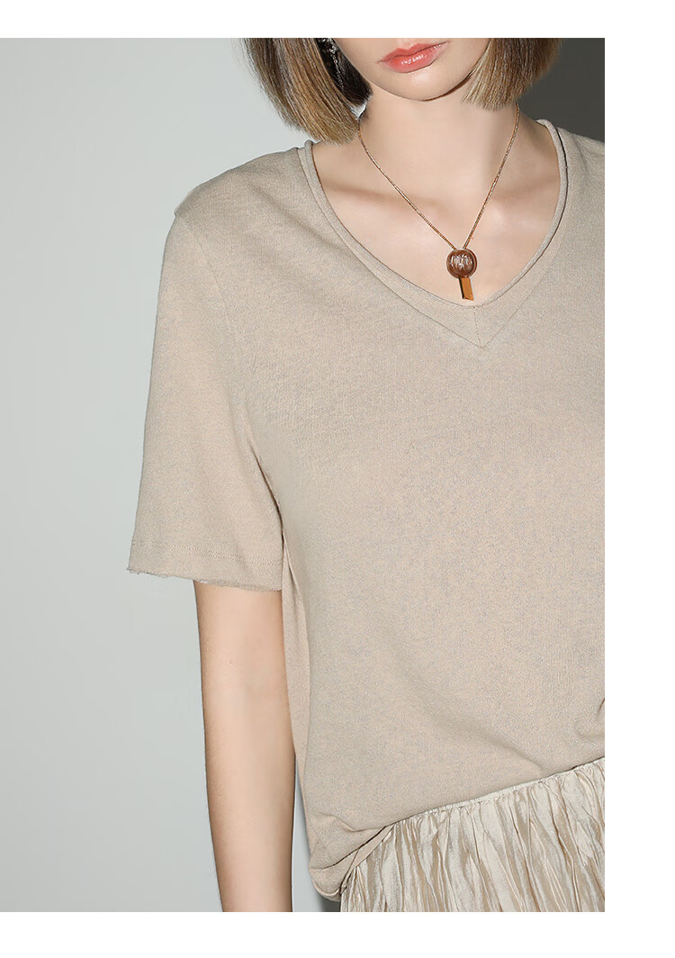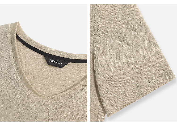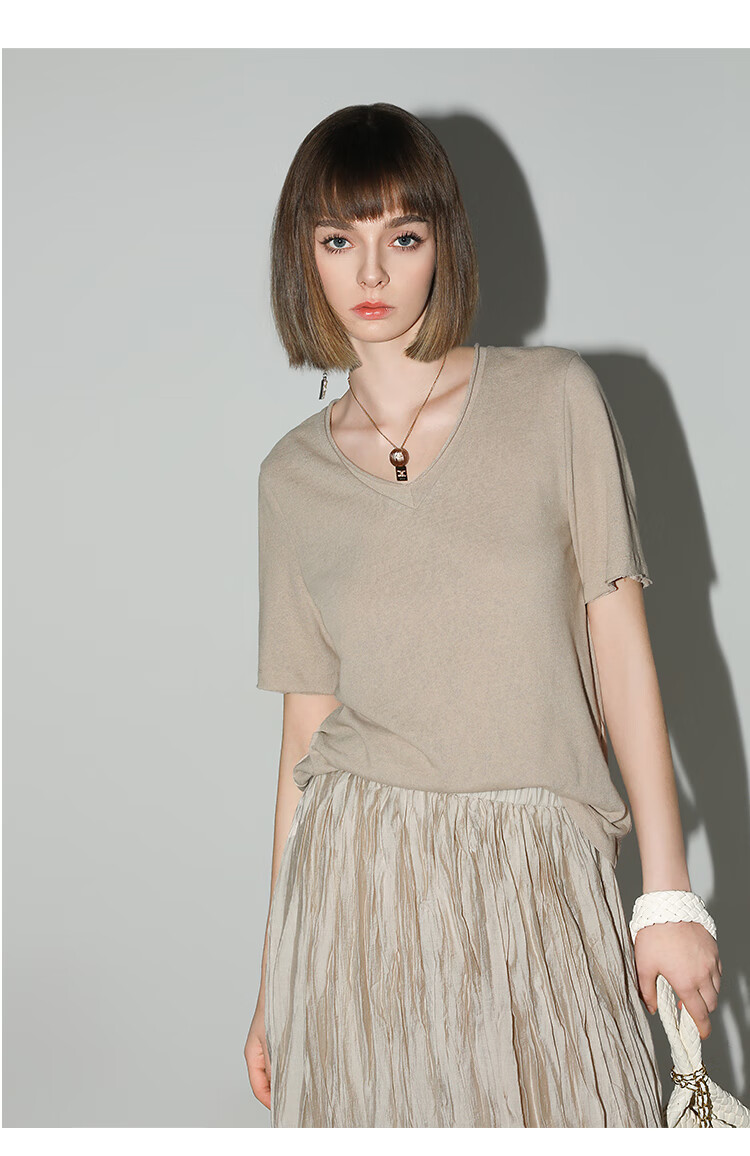 COCOBELLA竹节棉白色短袖T恤基础款V领随性毛边上衣TS7017-2
