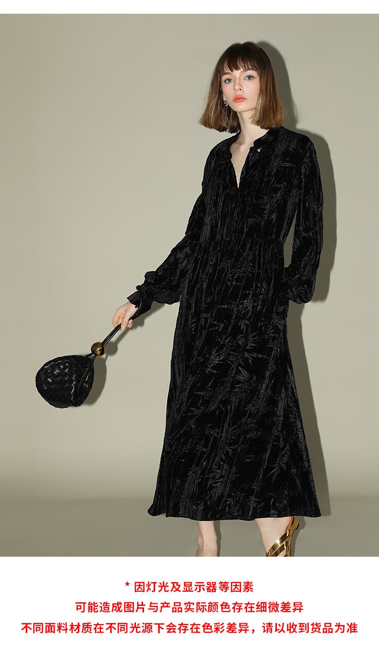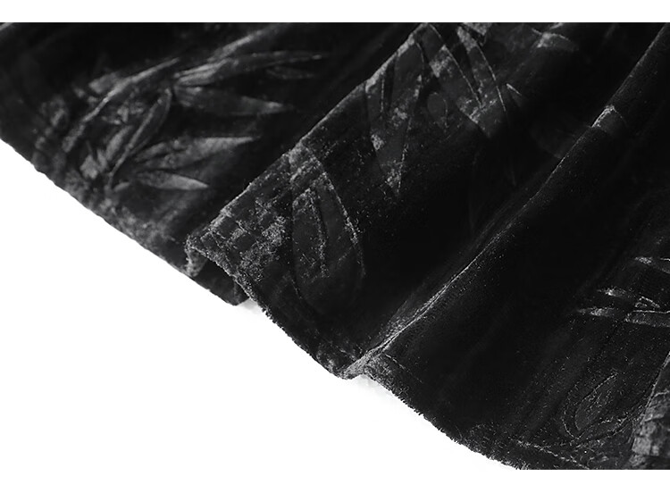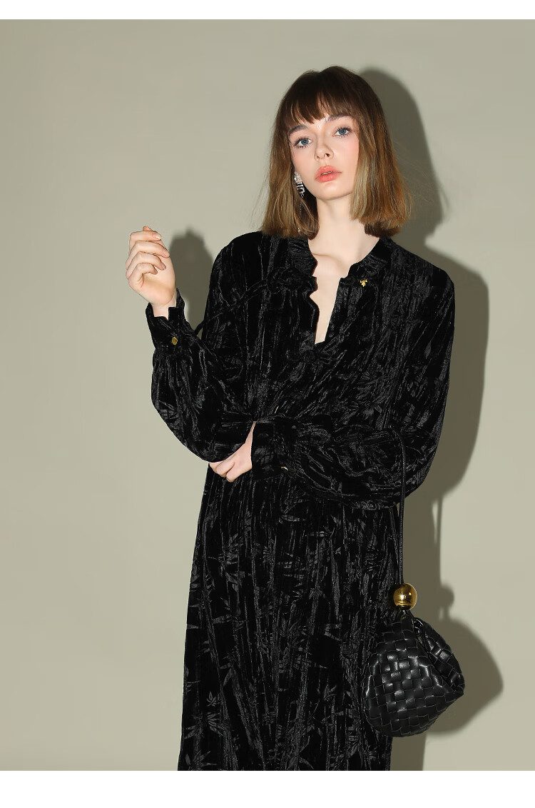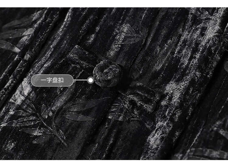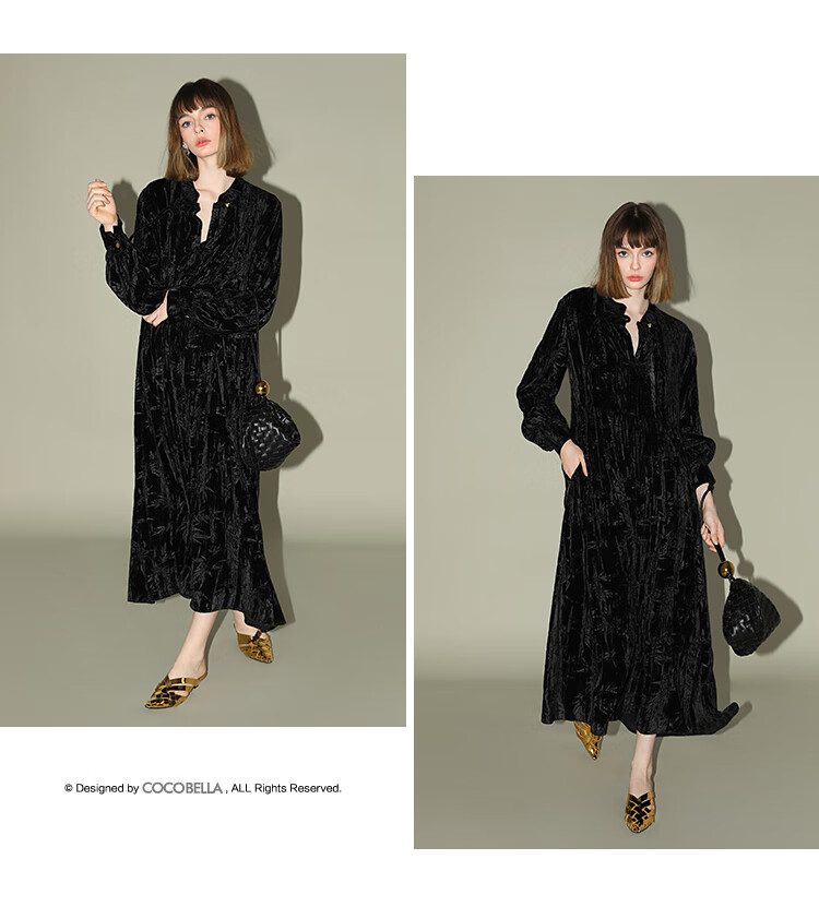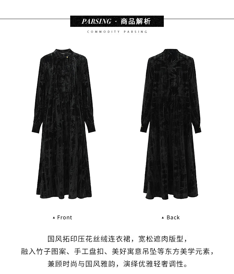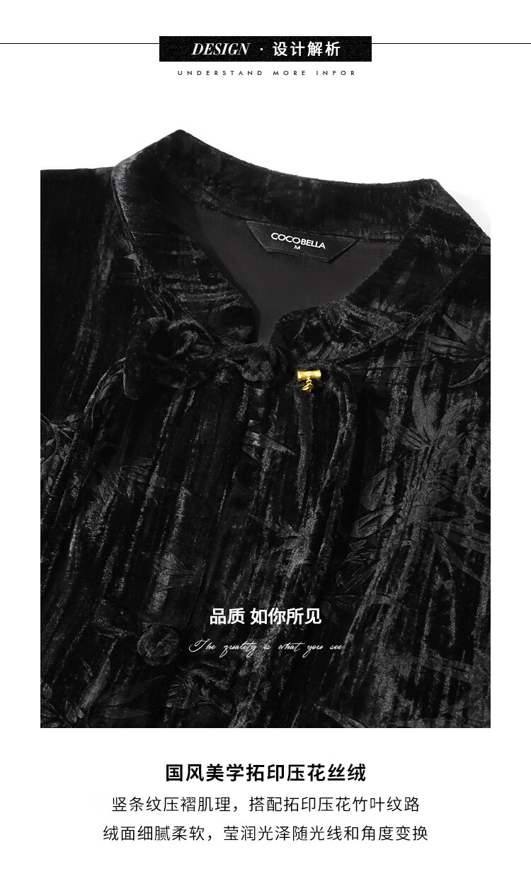 【有赞】COCOBELLA竹叶拓印国风丝绒连衣裙手缝盘扣压褶衬衫裙FR0002B