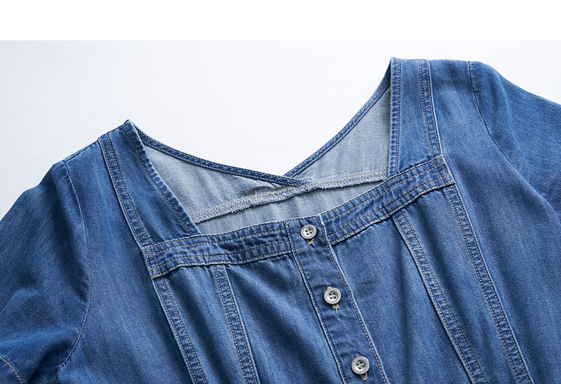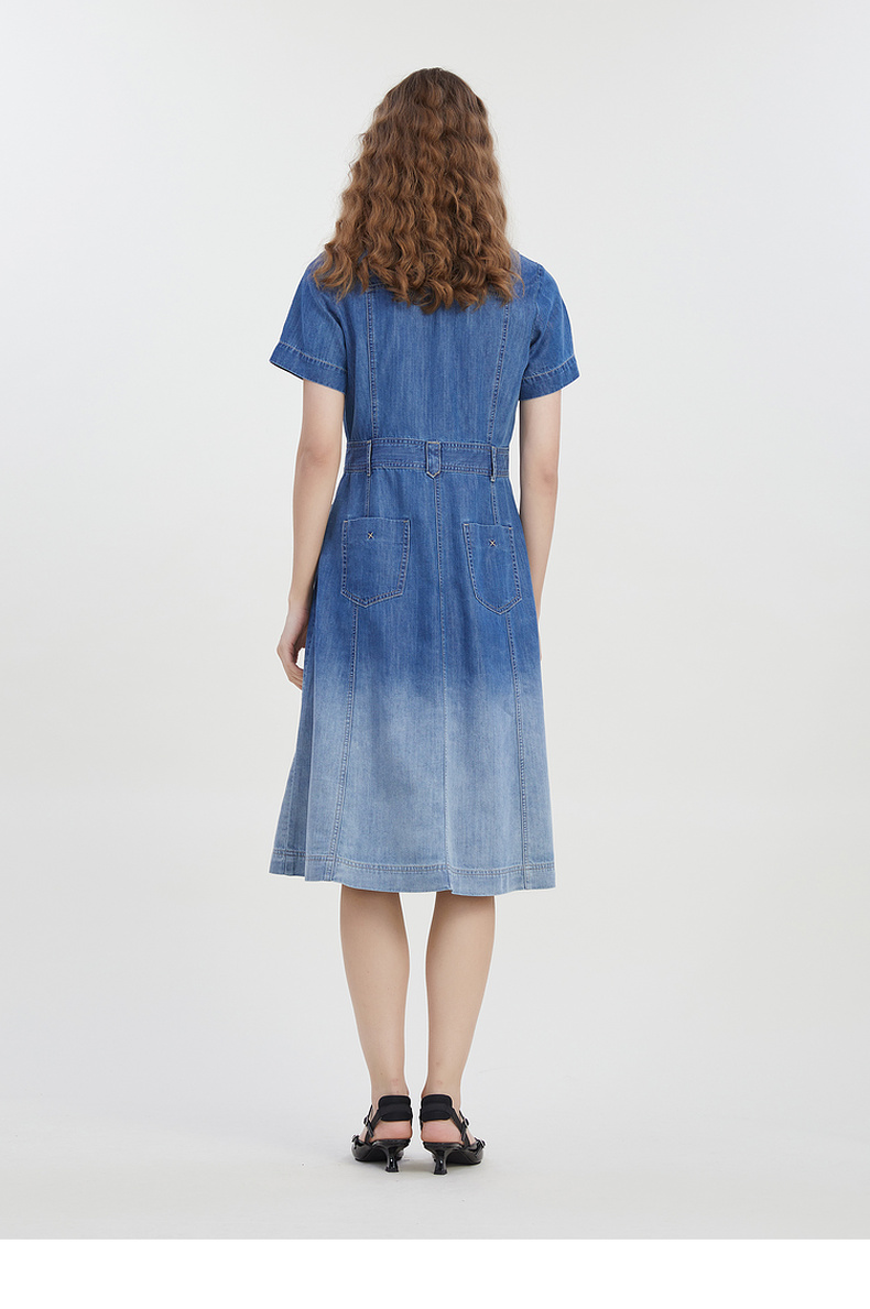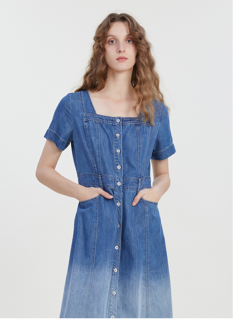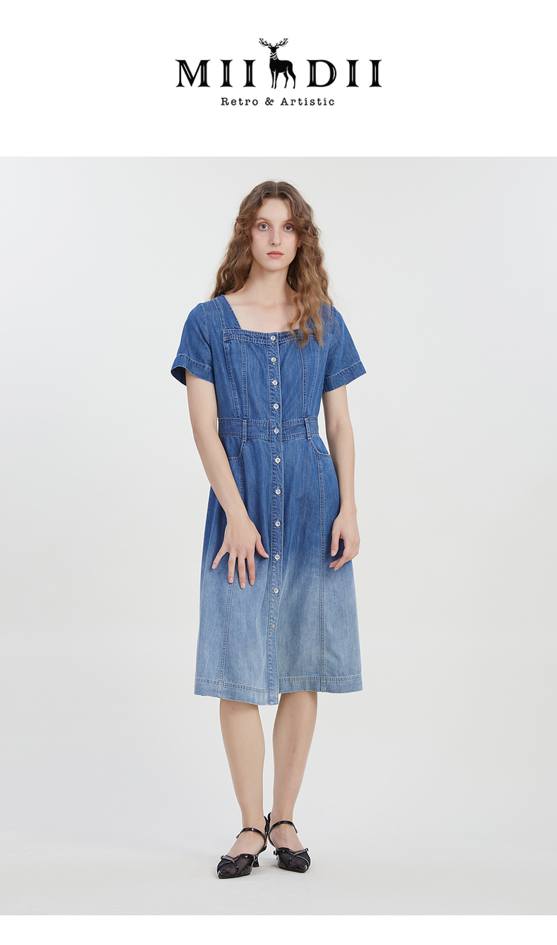 谜底牛仔连衣裙女2023夏复古渐变色方领显瘦中长裙短款232ML0606