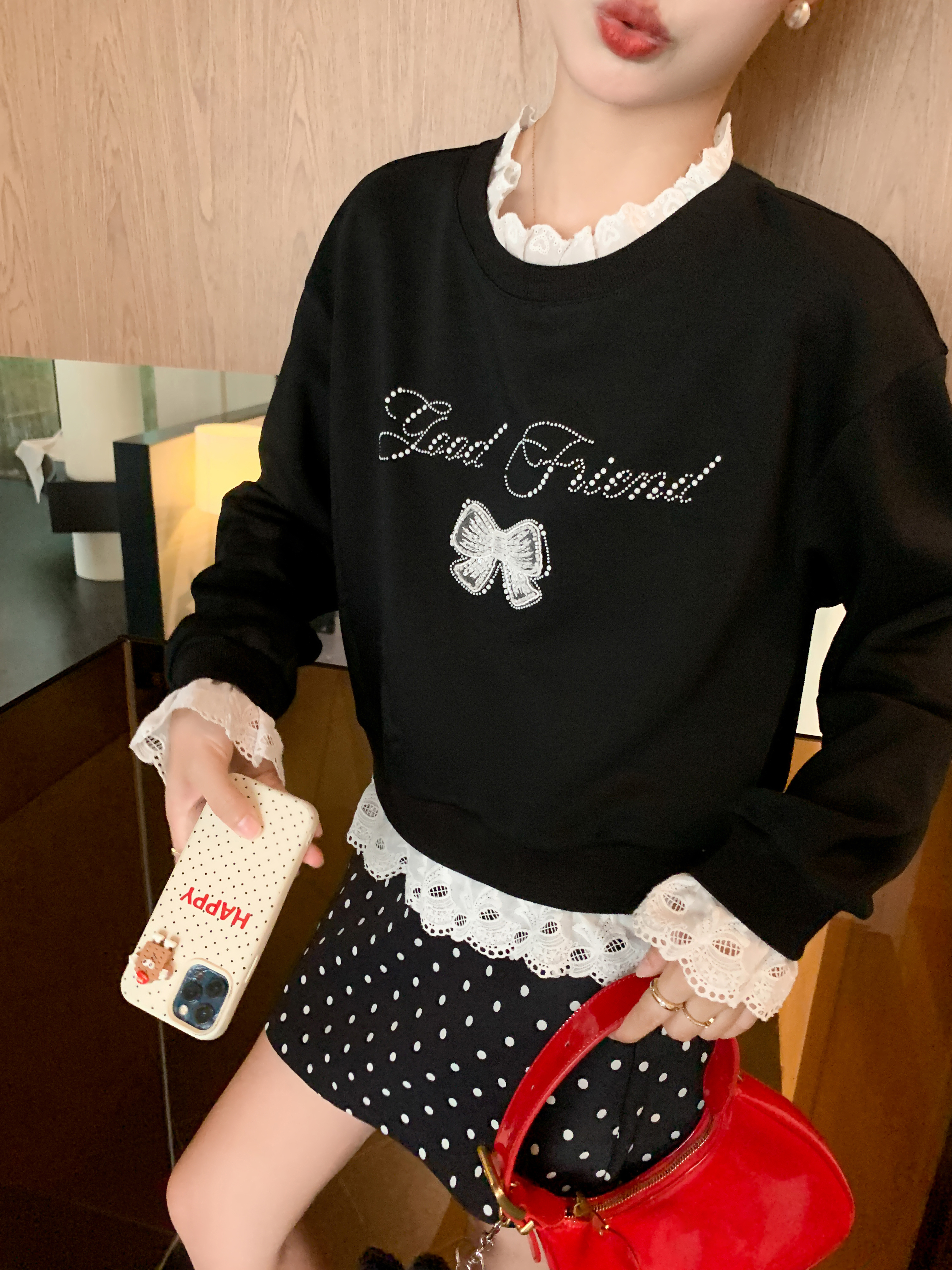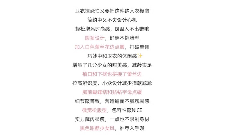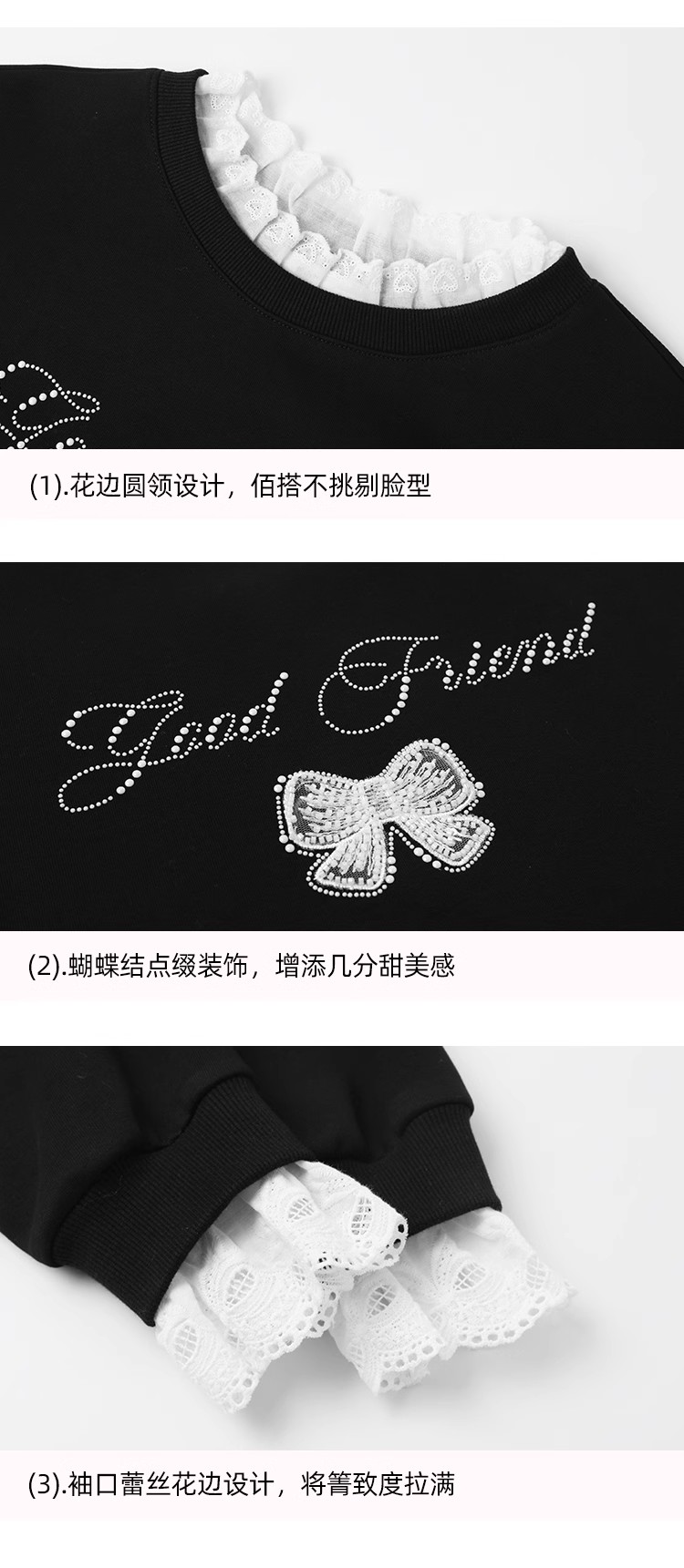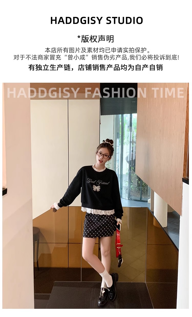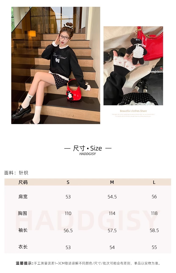 <曾小咸推荐>【现货】韩系甜美花边领黑色宽松显瘦卫衣女早秋新款百搭圆领上衣