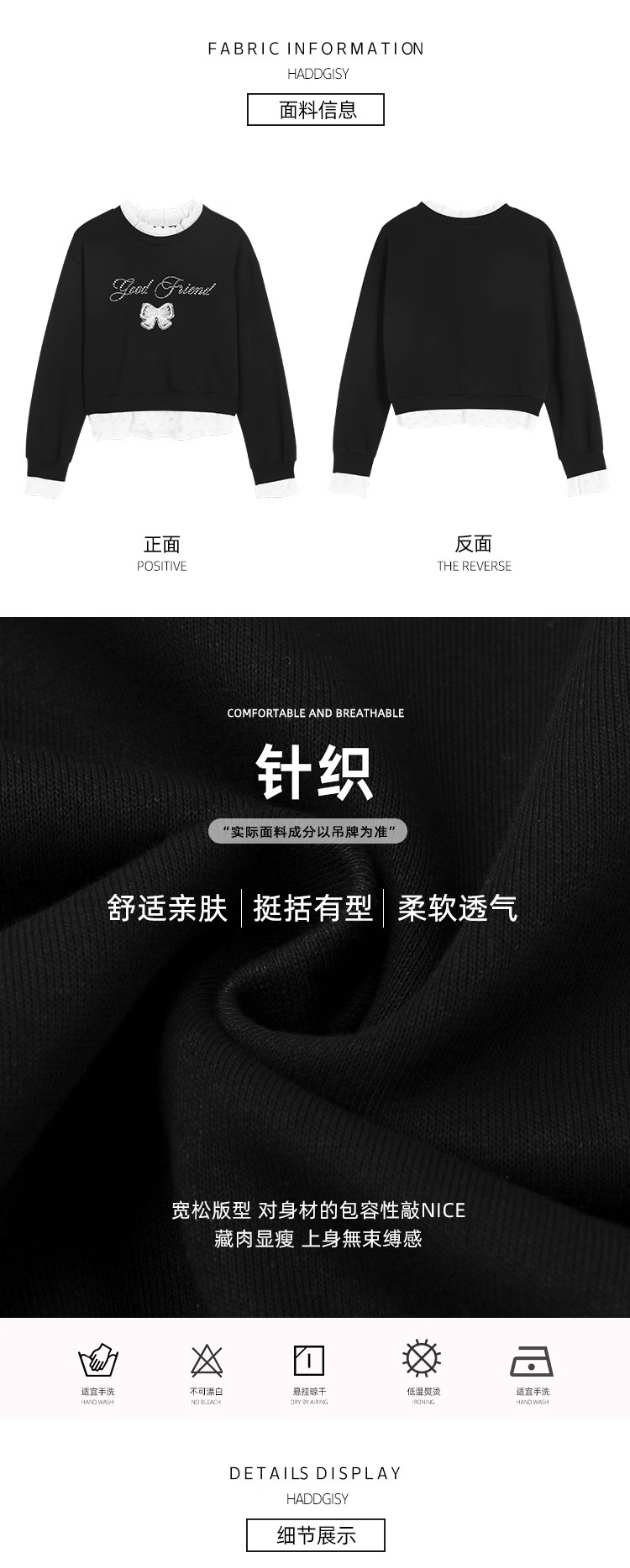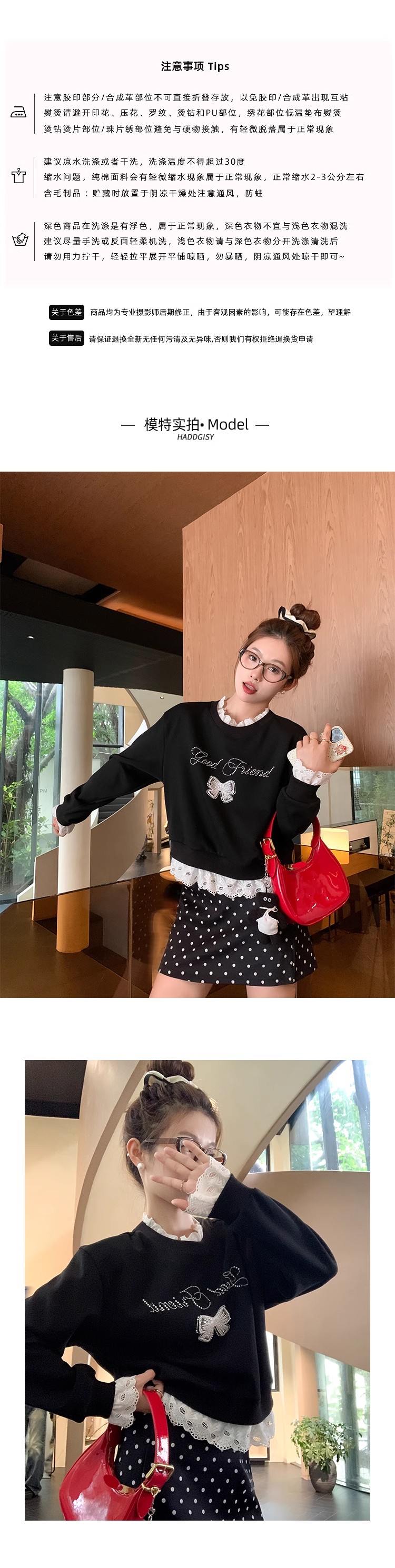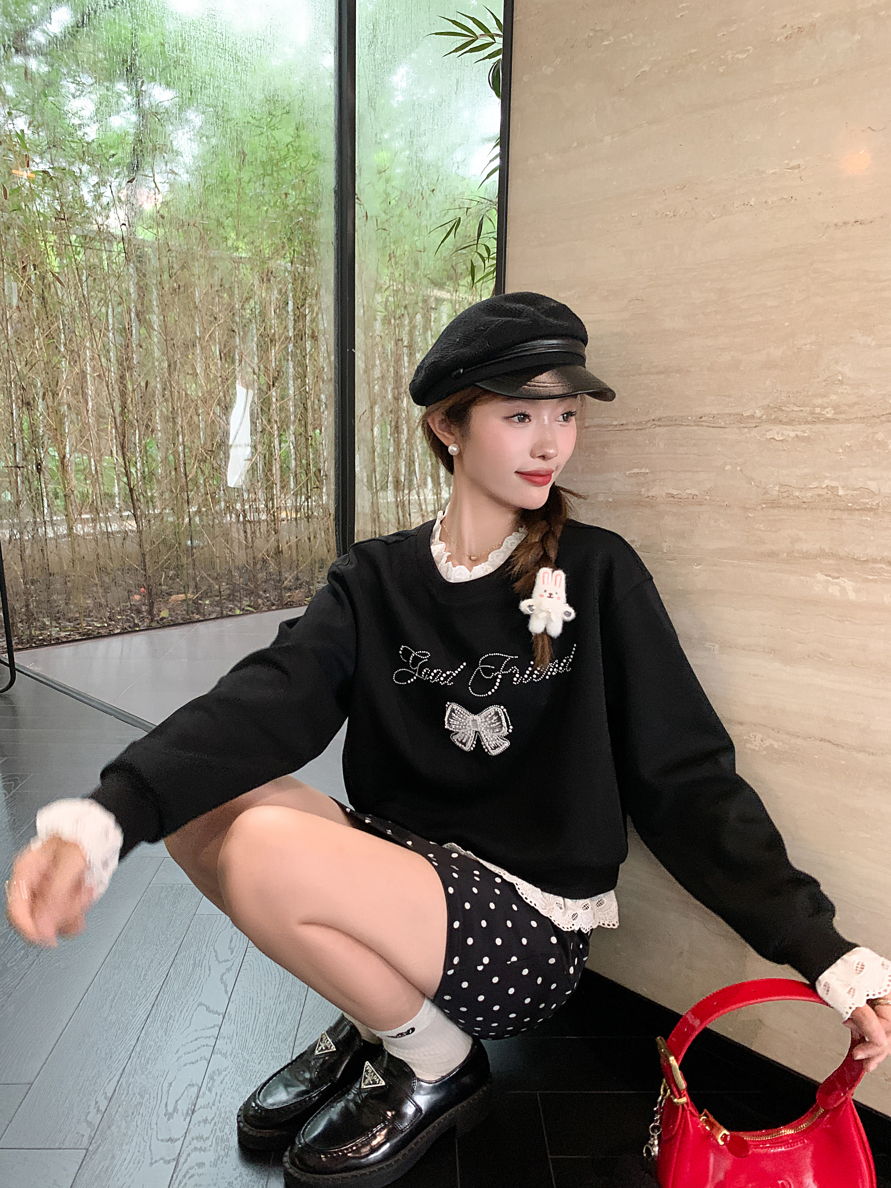 <曾小咸推荐>【现货】韩系甜美花边领黑色宽松显瘦卫衣女早秋新款百搭圆领上衣