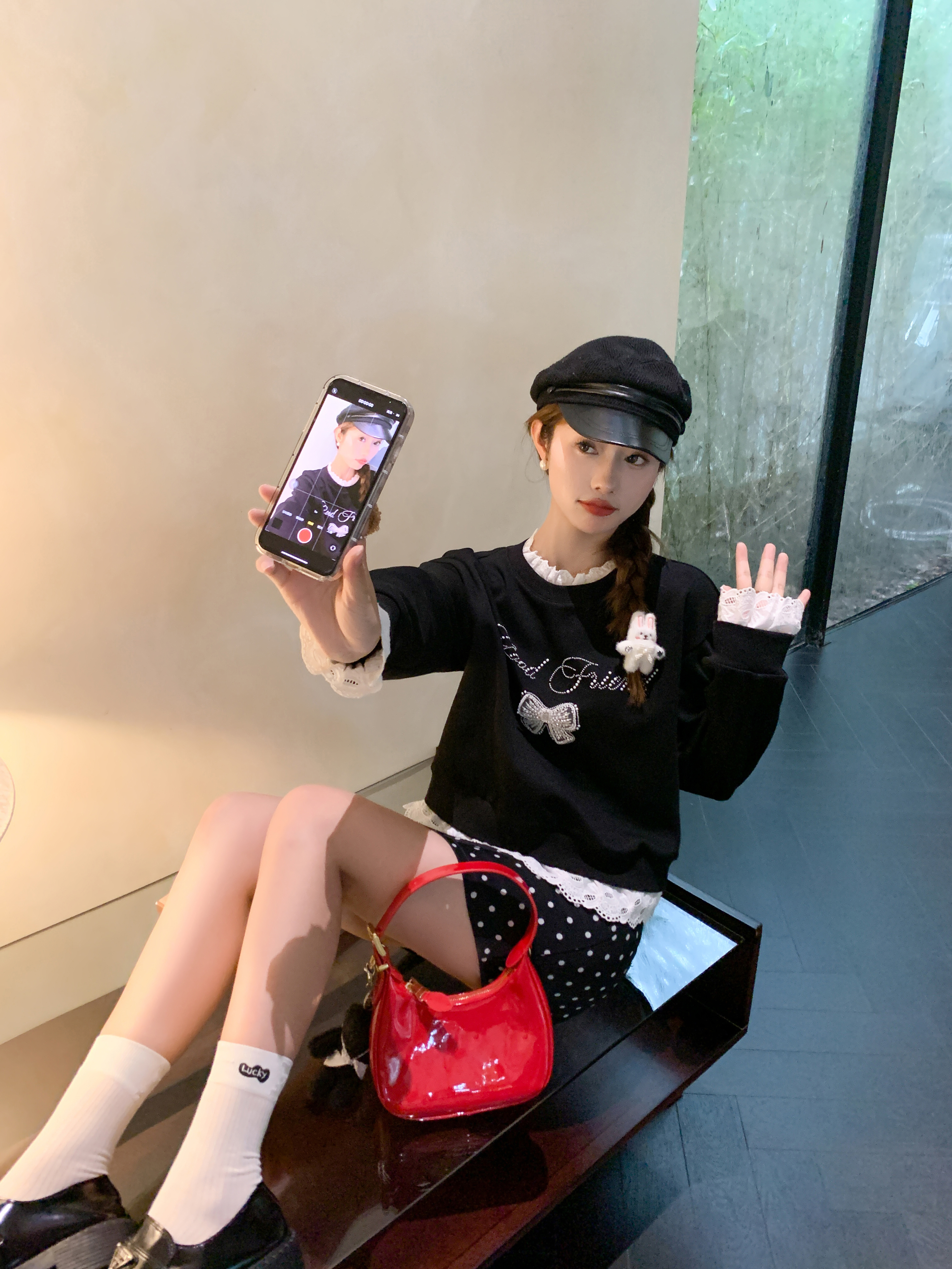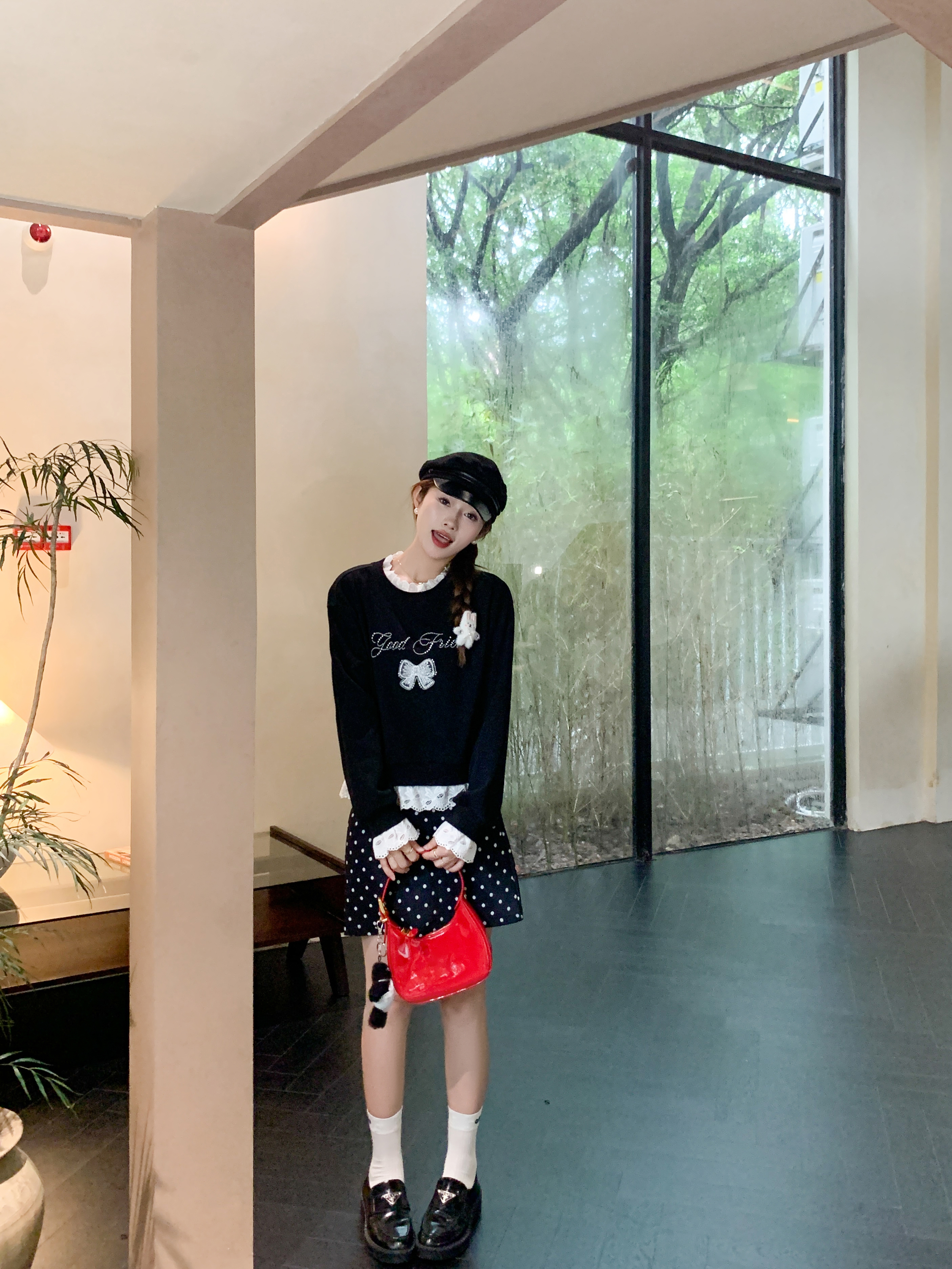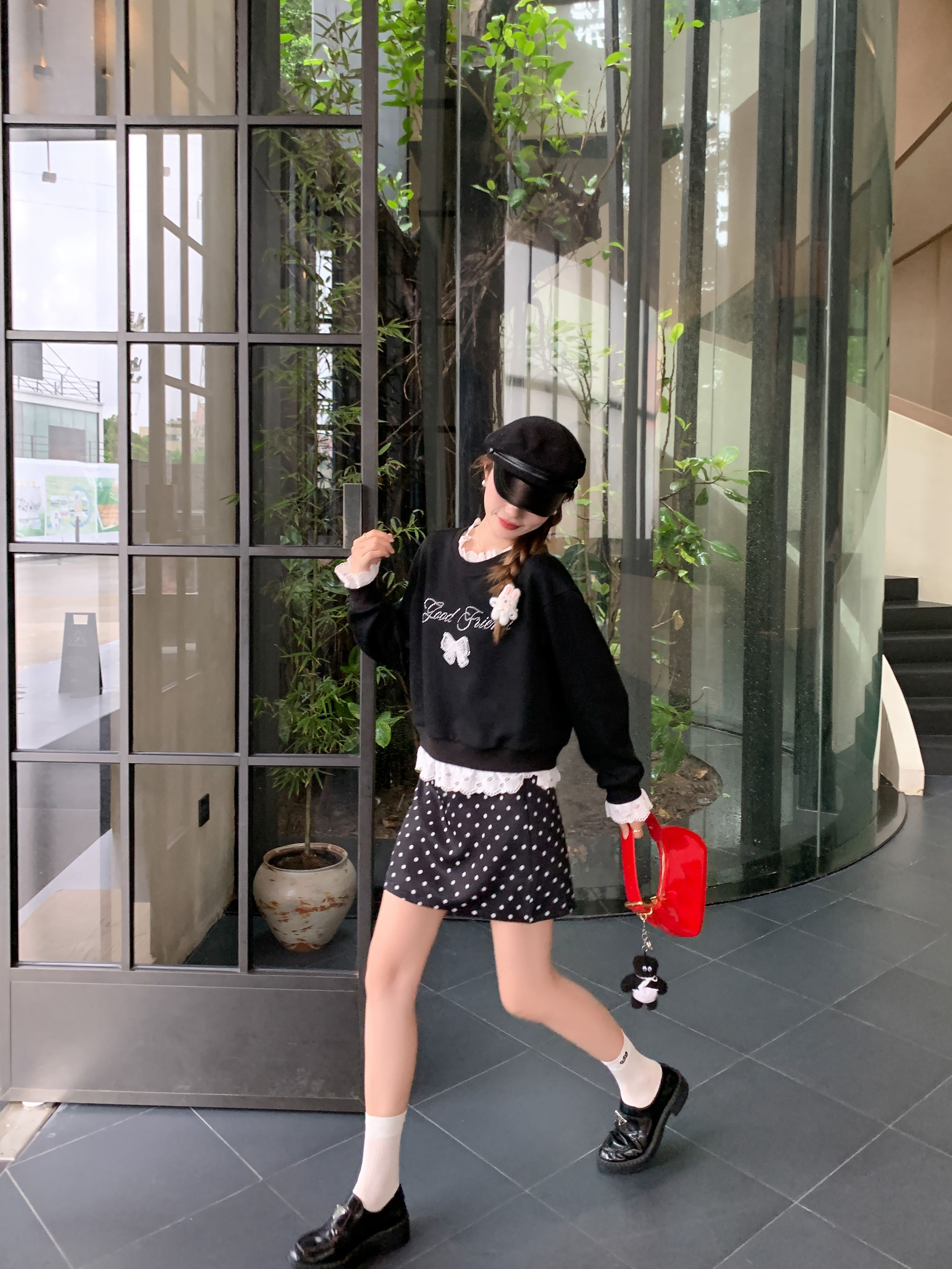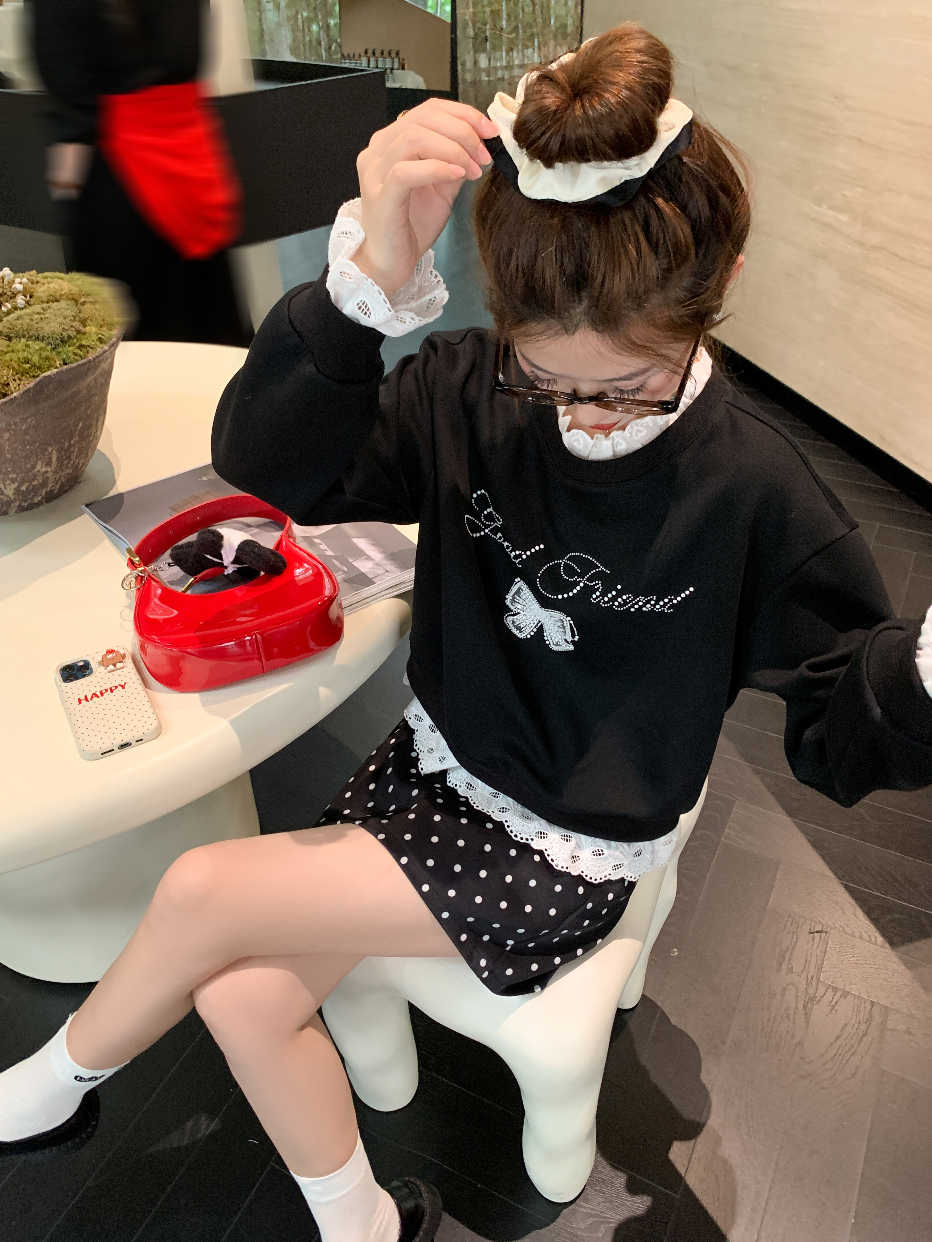 <曾小咸推荐>【现货】韩系甜美花边领黑色宽松显瘦卫衣女早秋新款百搭圆领上衣