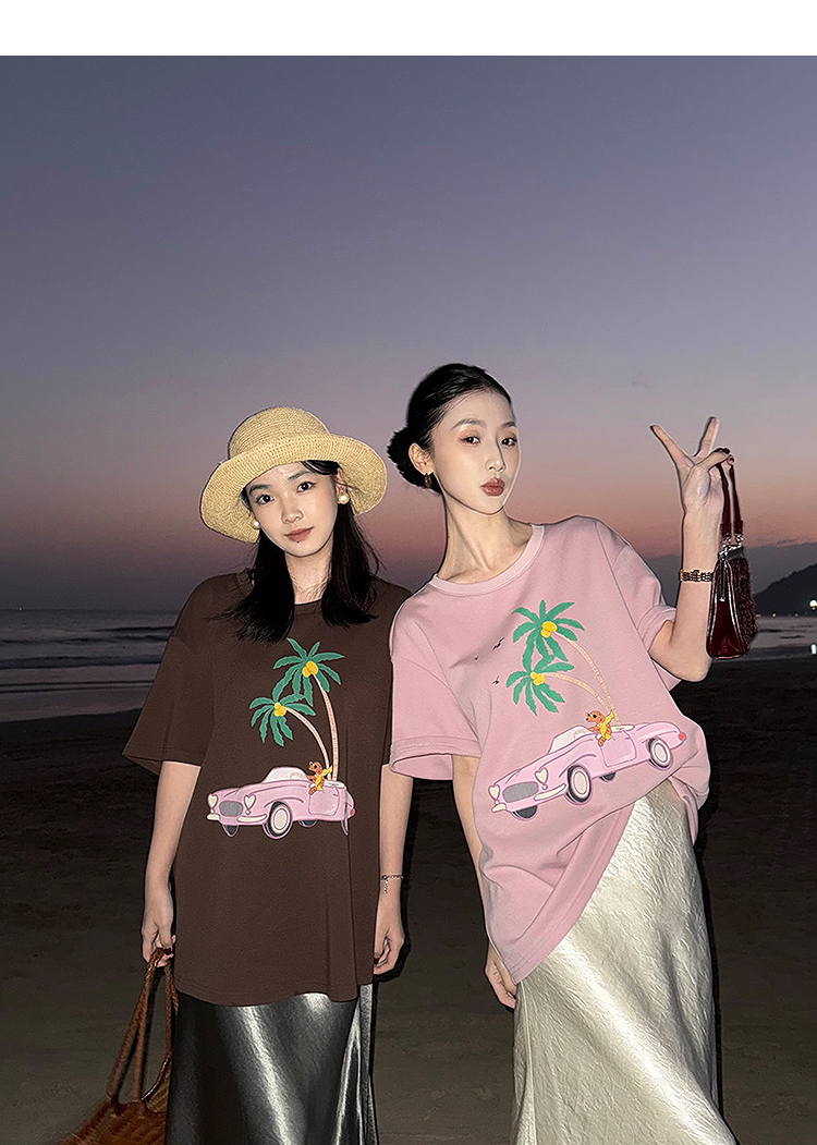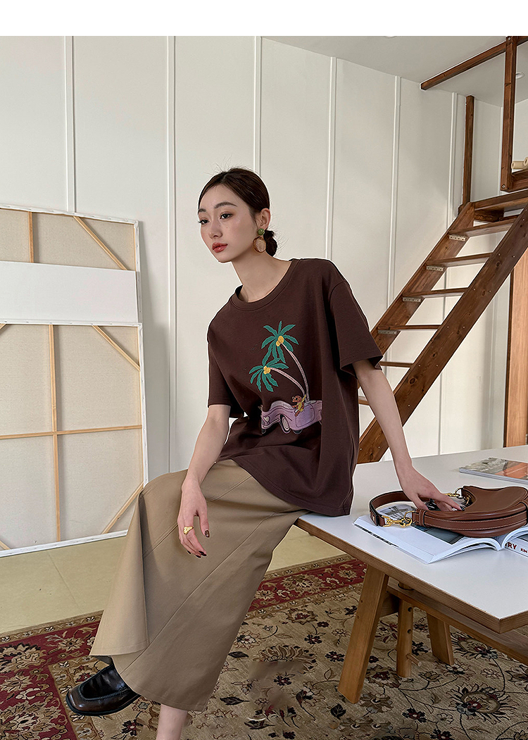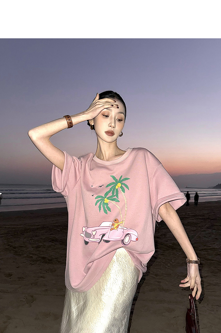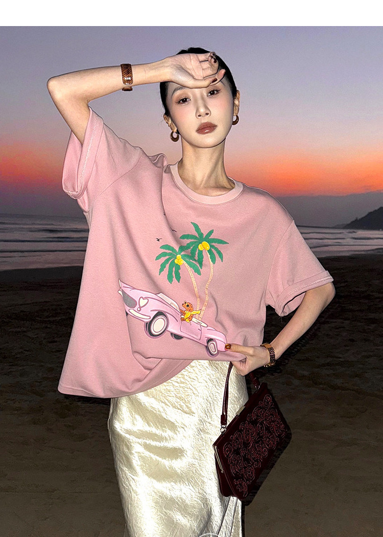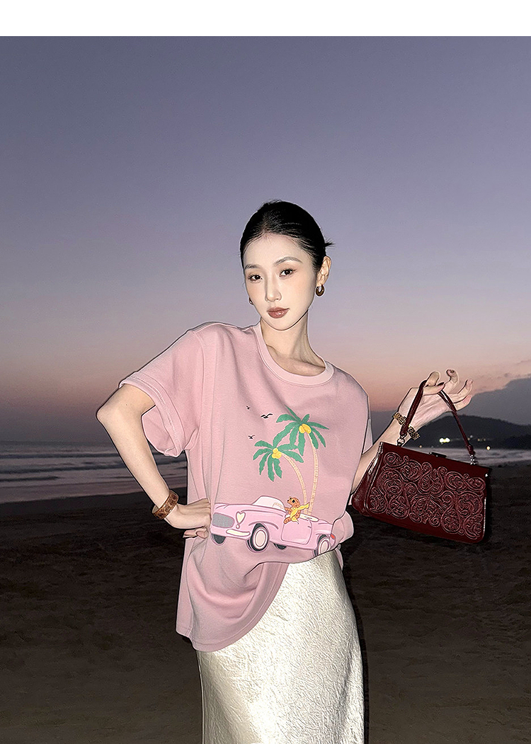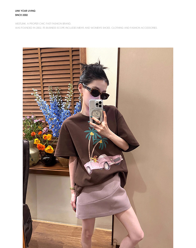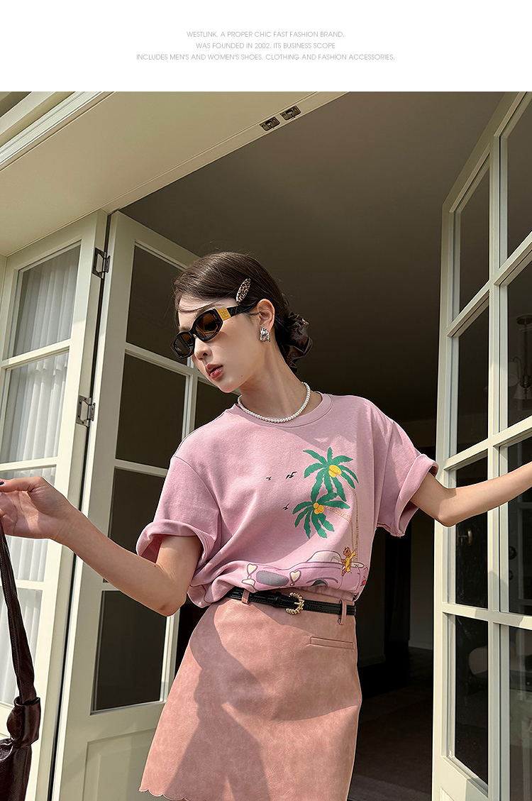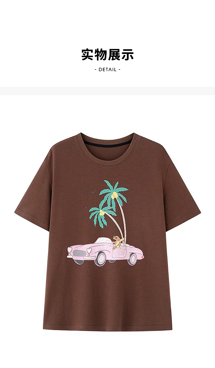 西遇圆领印花短袖T恤女2026年春季新款度假风宽松套头半袖上衣SS060163