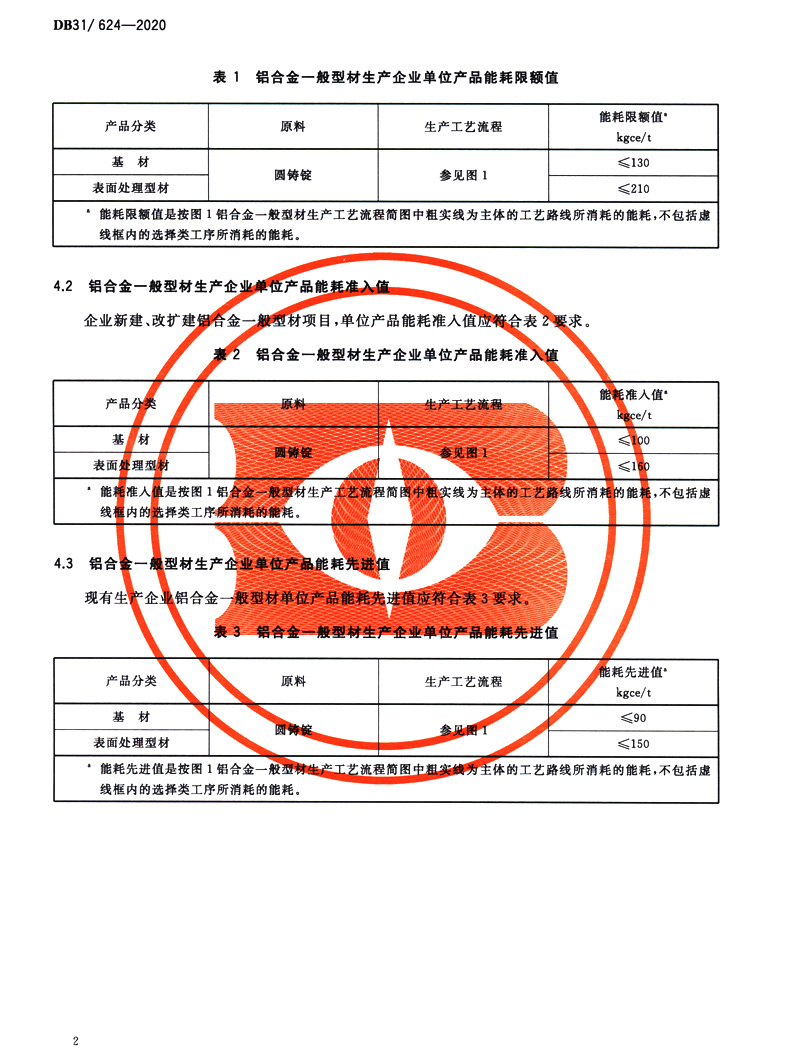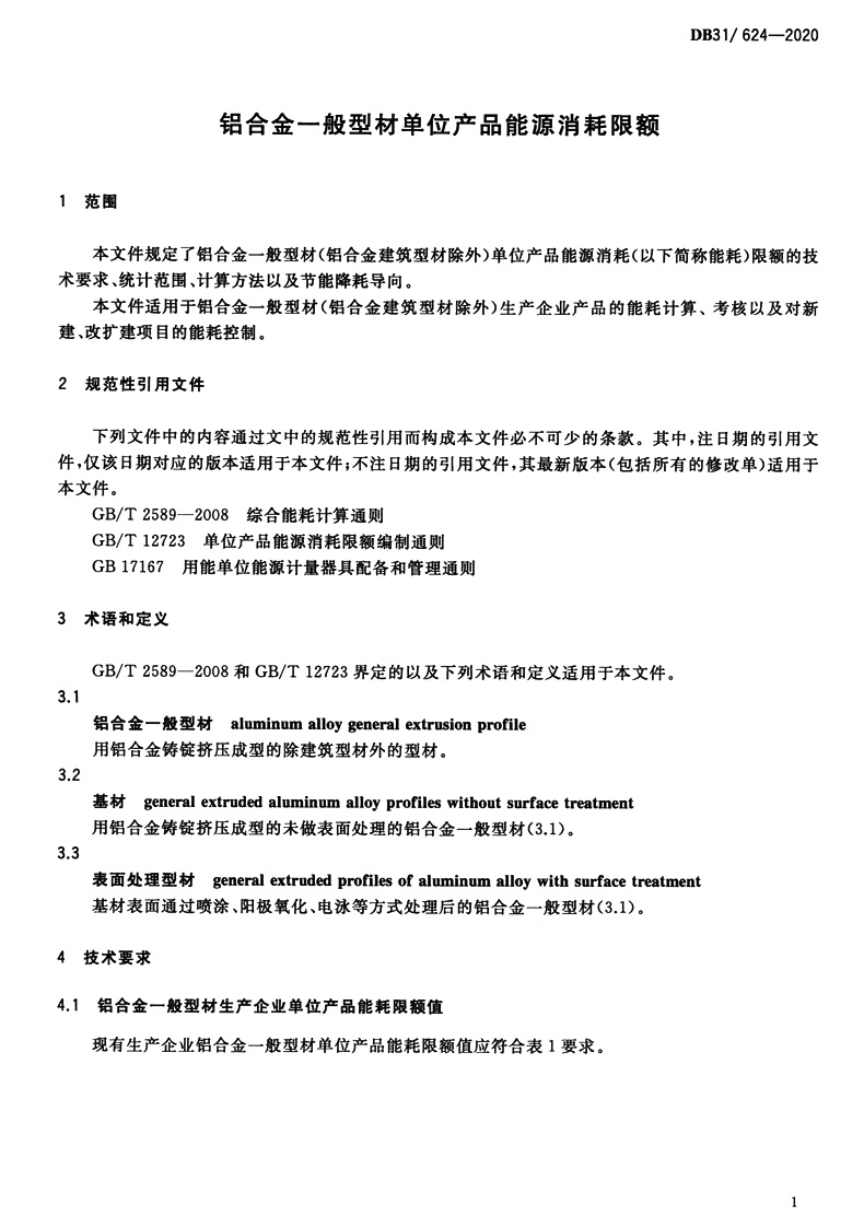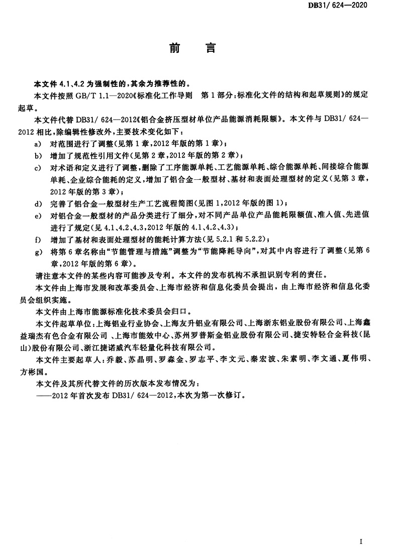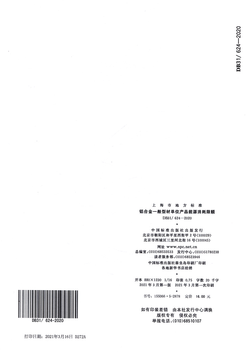 书名:速印不退 DB31/ 624-2020 铝合金一般型材单位产品能源消耗限额