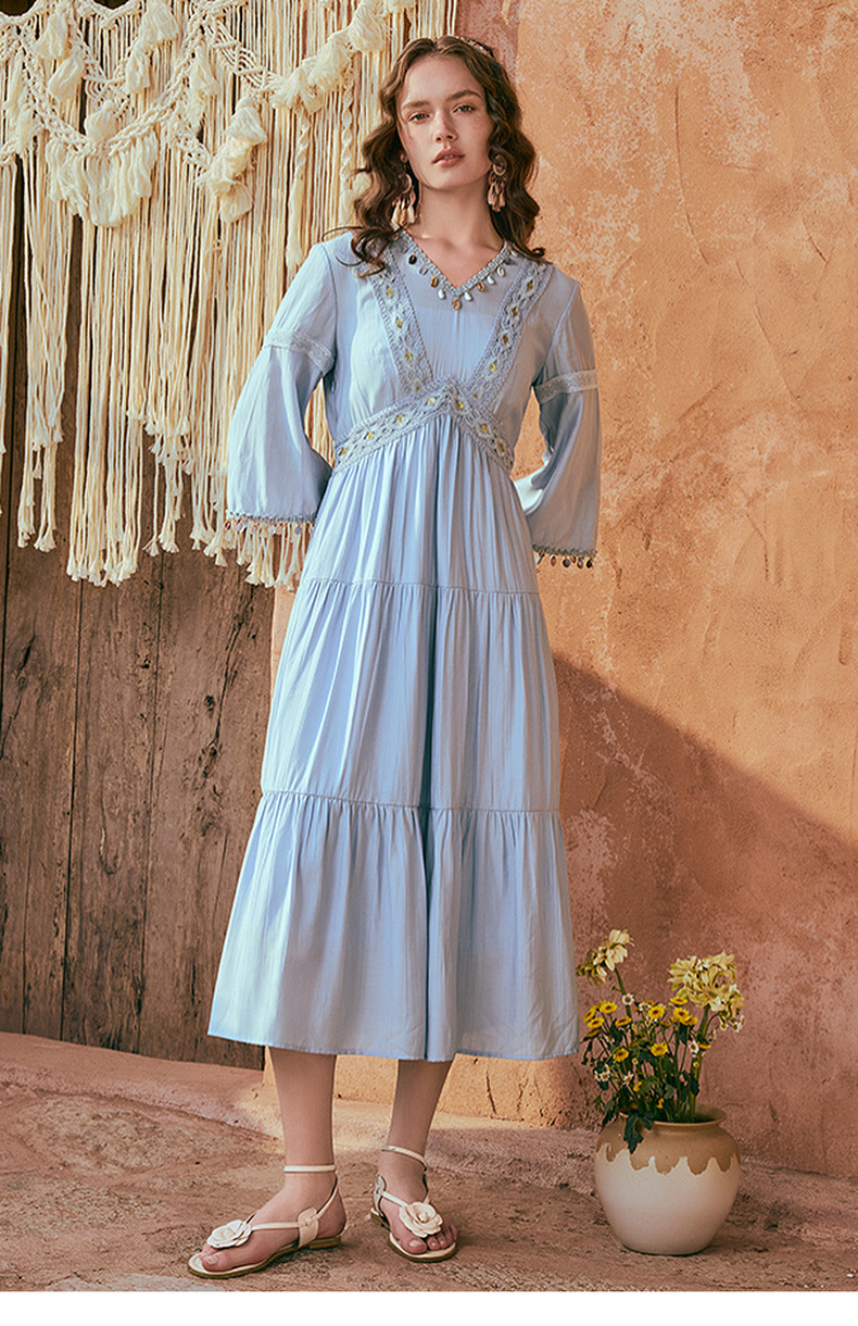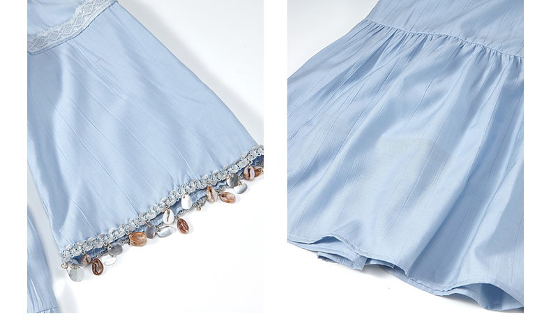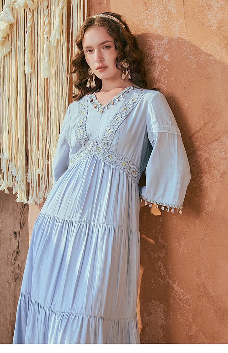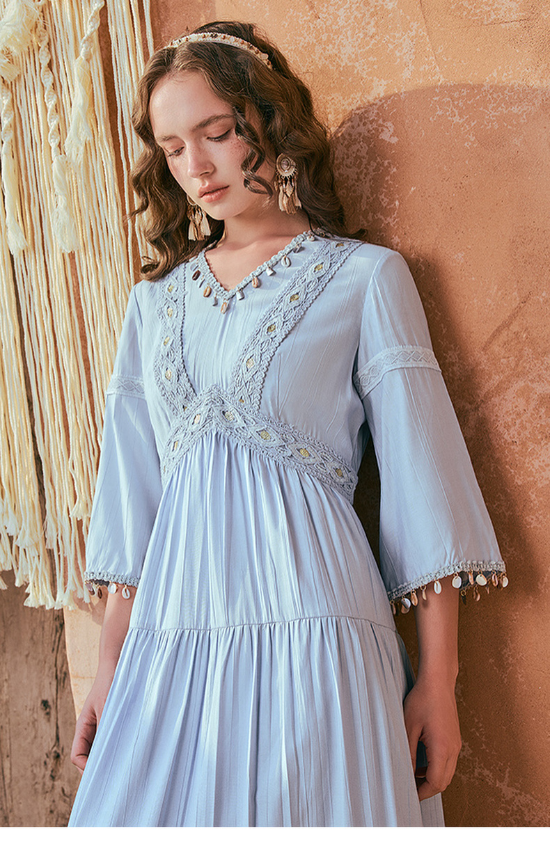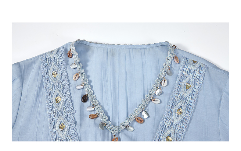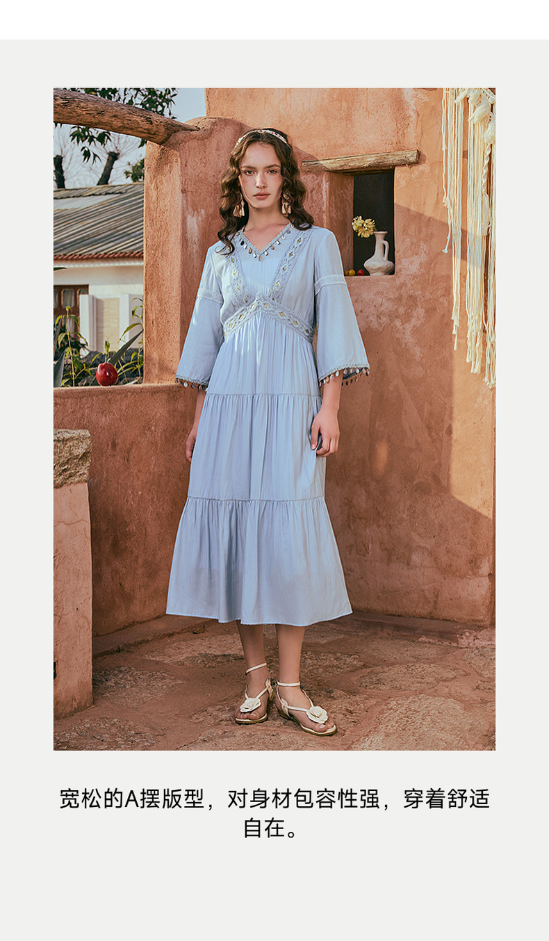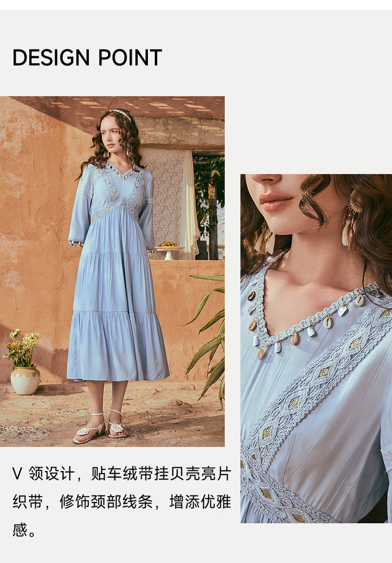 两三事 水星纪 2025夏季新款贝壳装饰亮片织带拼接喇叭袖连衣裙