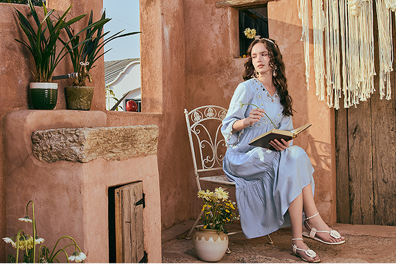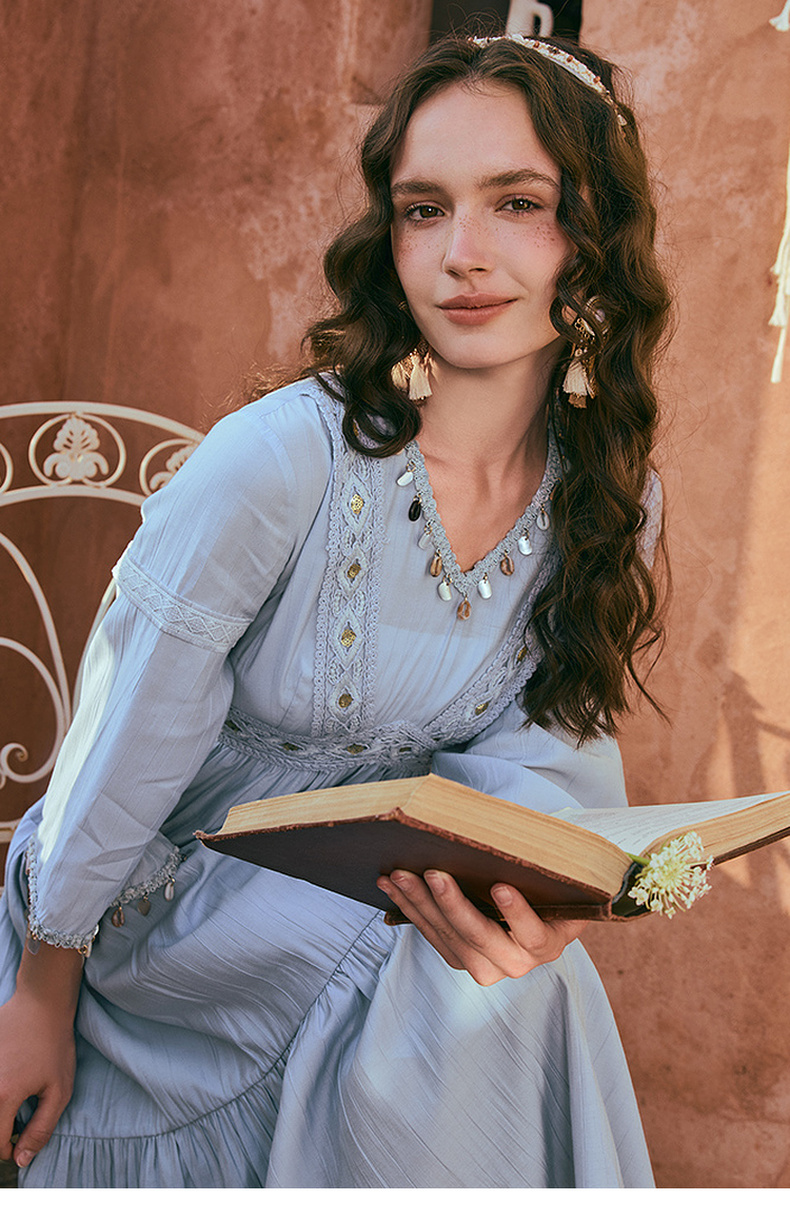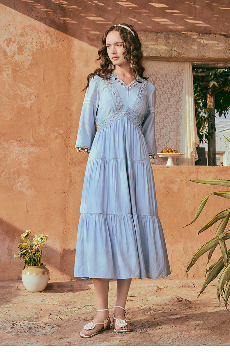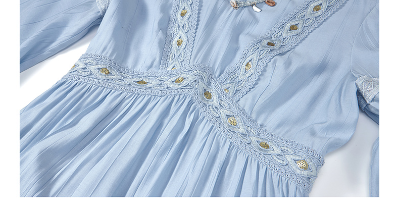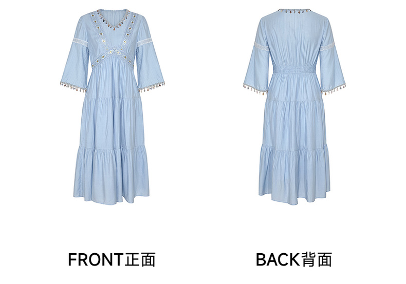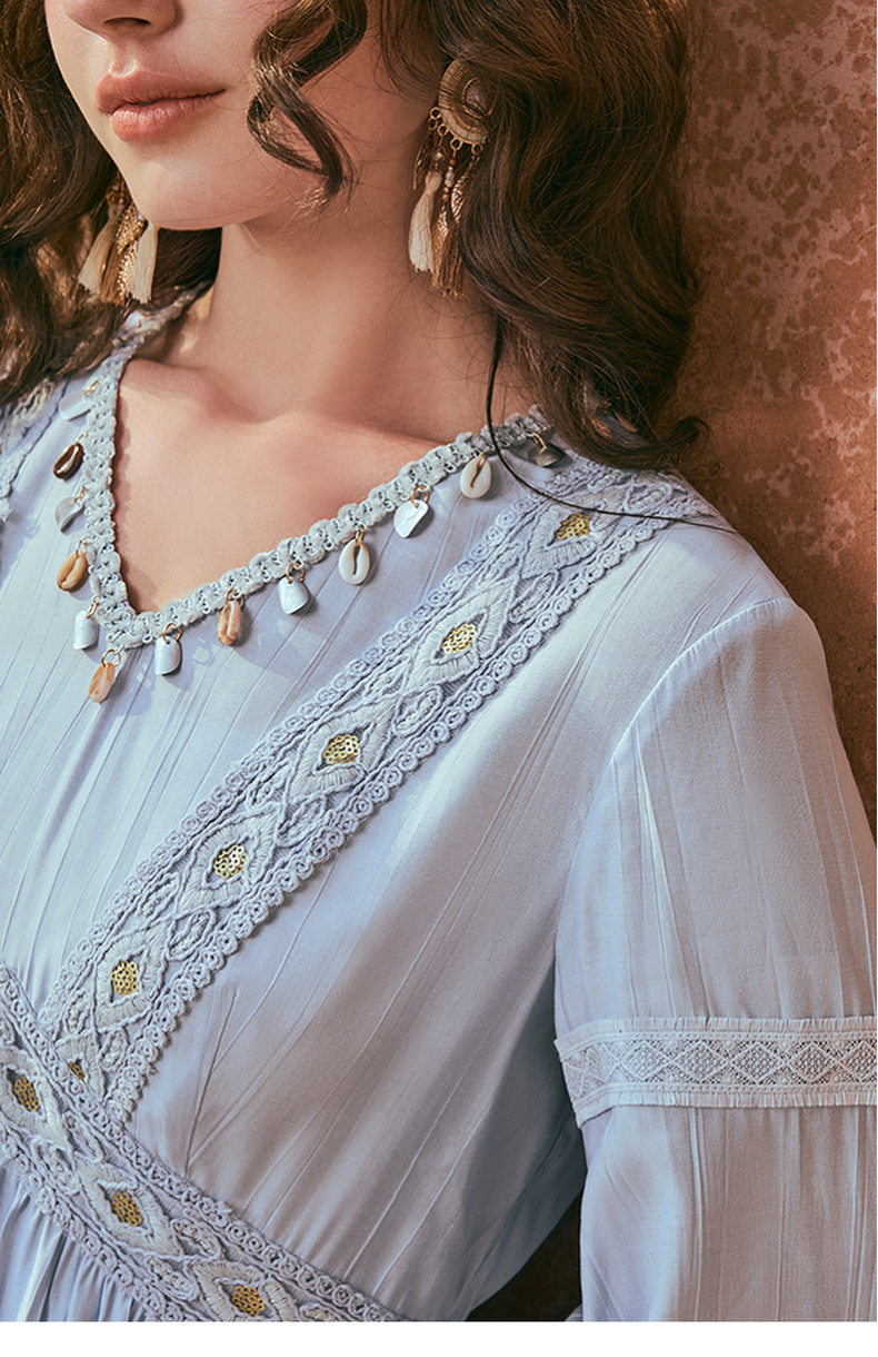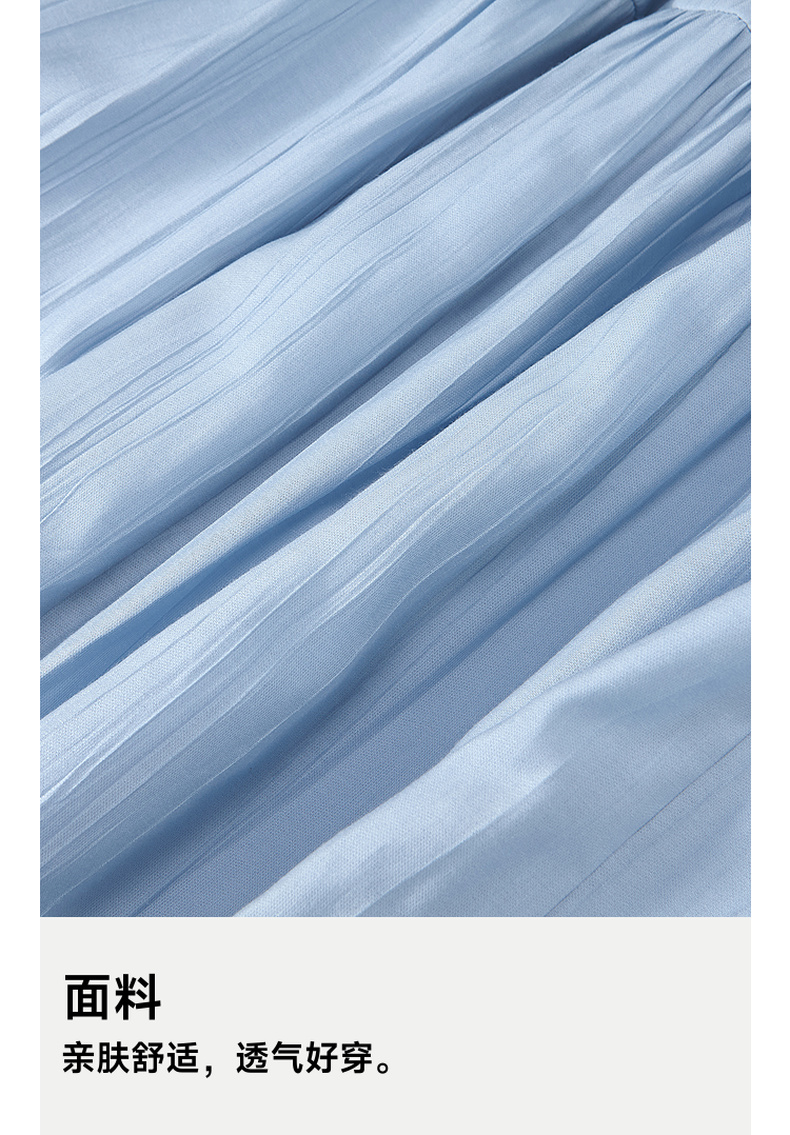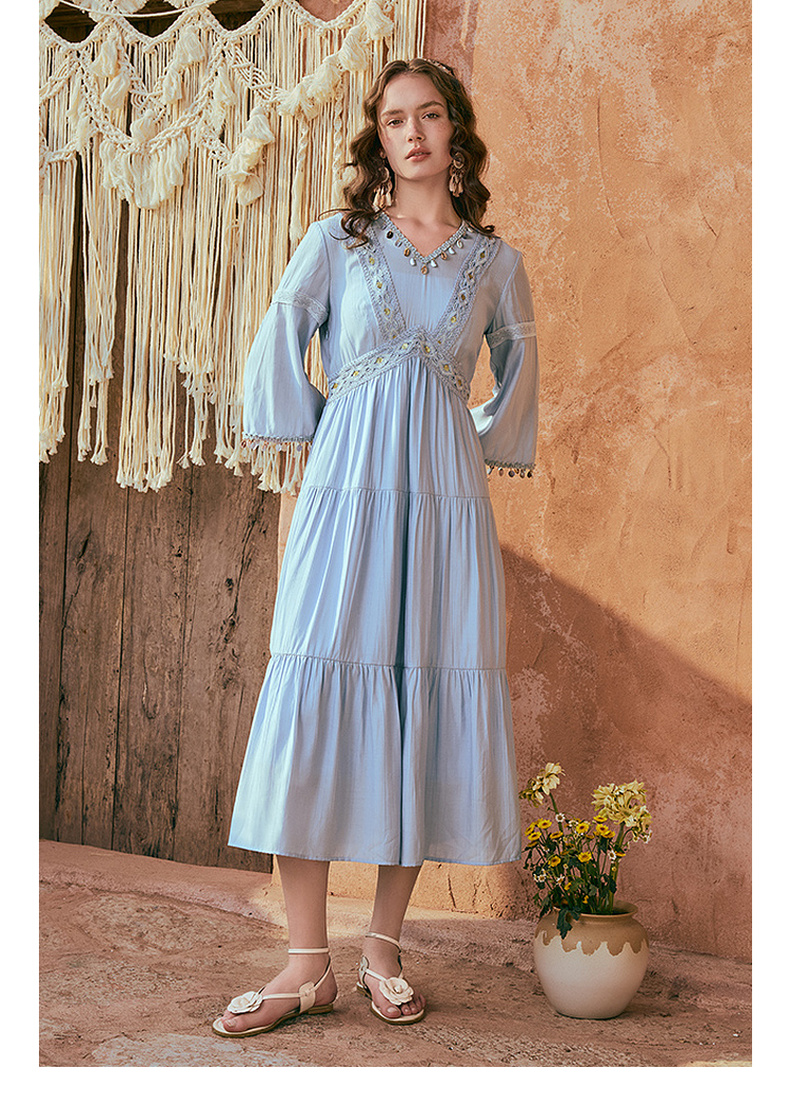 两三事 水星纪 2025夏季新款贝壳装饰亮片织带拼接喇叭袖连衣裙